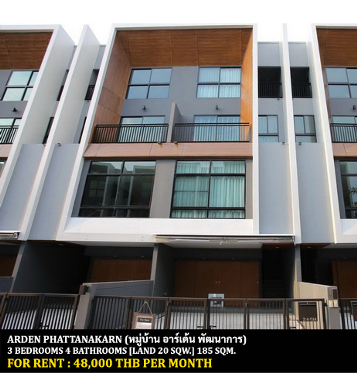 [ให้เช่า] หมู่บ้าน อาร์เด้น พัฒนาการ / 3 ห้องนอน 4 ห้องน้ำ / 20 ตรว. 185 ตรม. **48,000** ทาวน์โฮม 3 ชั้นใจกลางเมือง ตกแต่งสวย เฟอร์นิเจอร์และเครื่องใช้ไฟฟ้าครบชุด เดินทางสะดวก พร้อมเข้าอยู่ เพียง 15 นาทีจากทองหล่อ