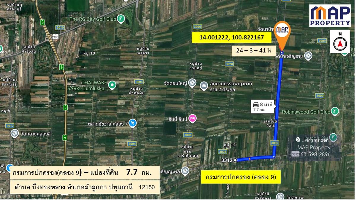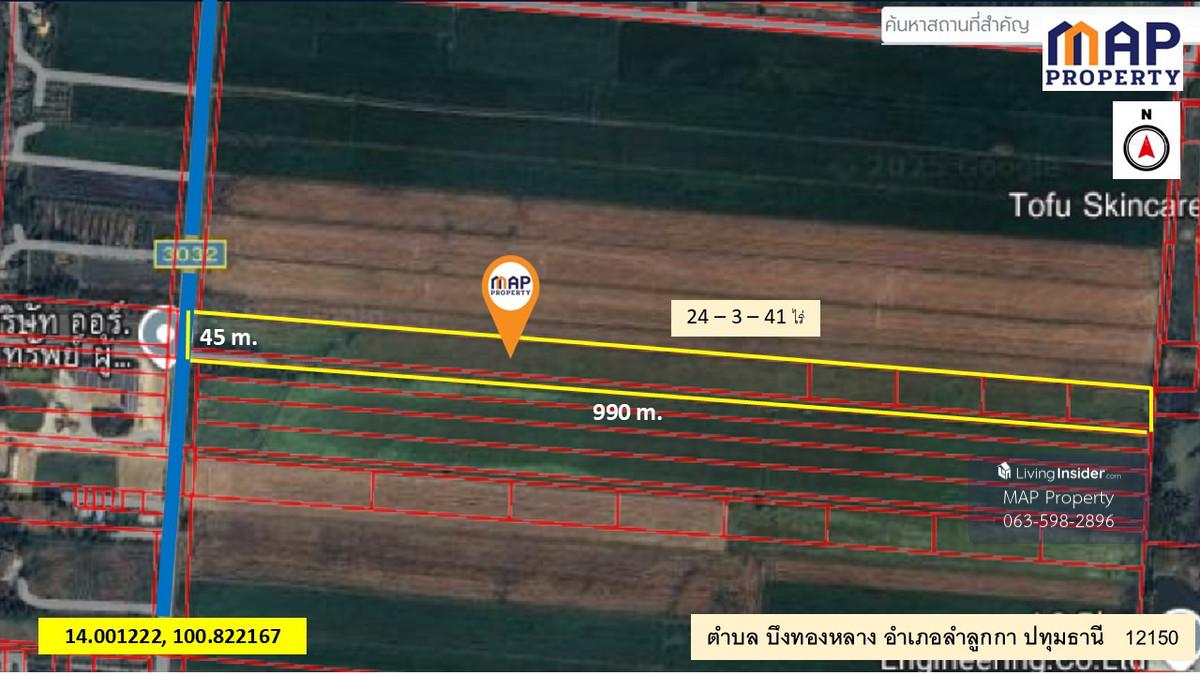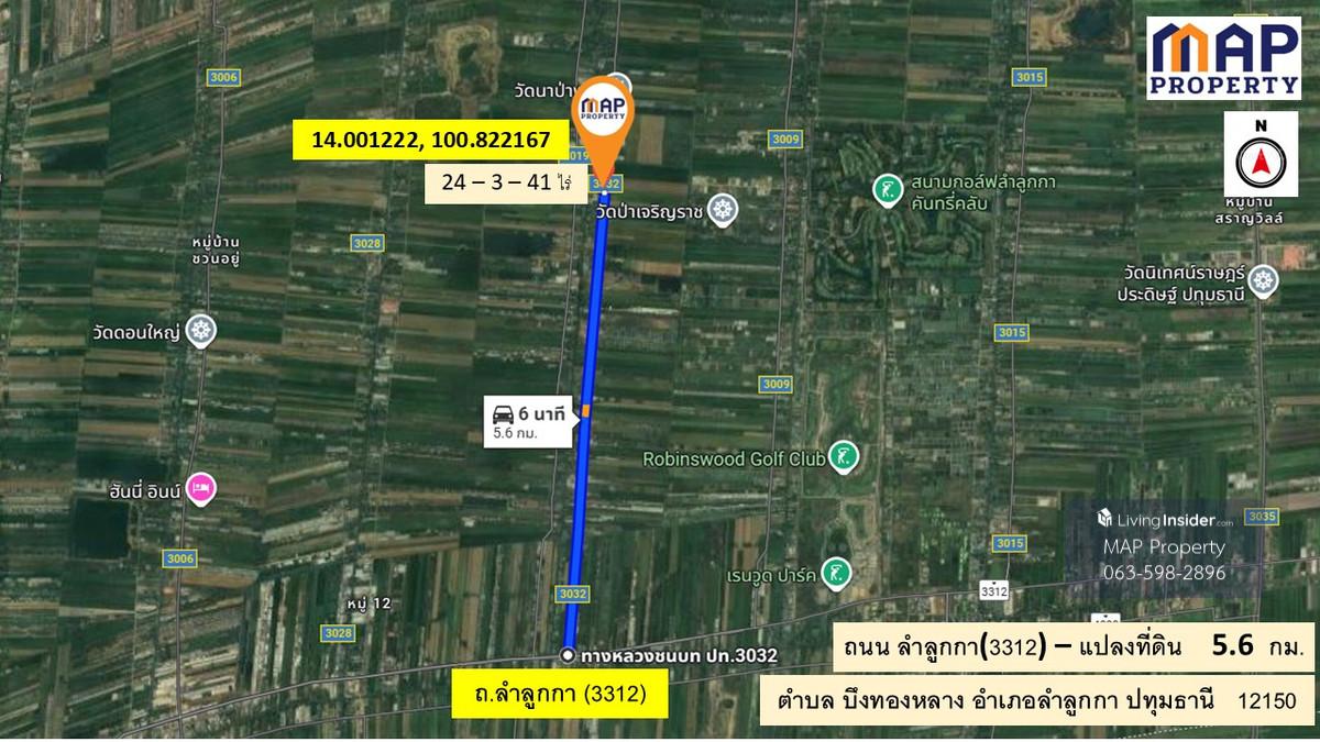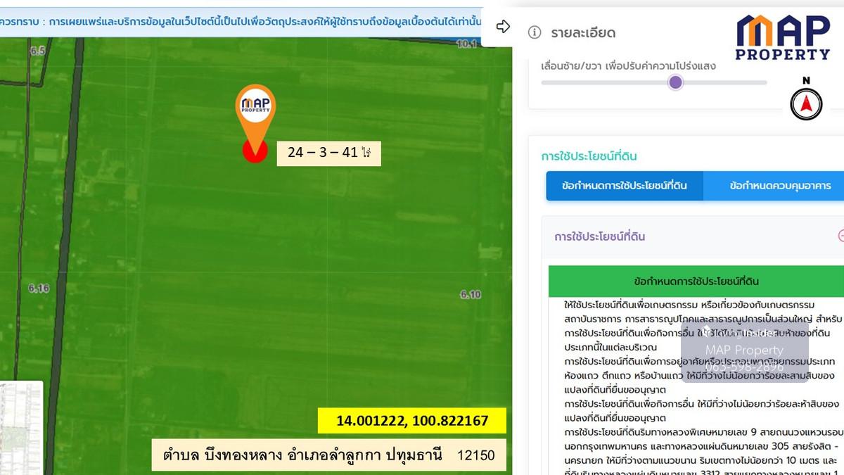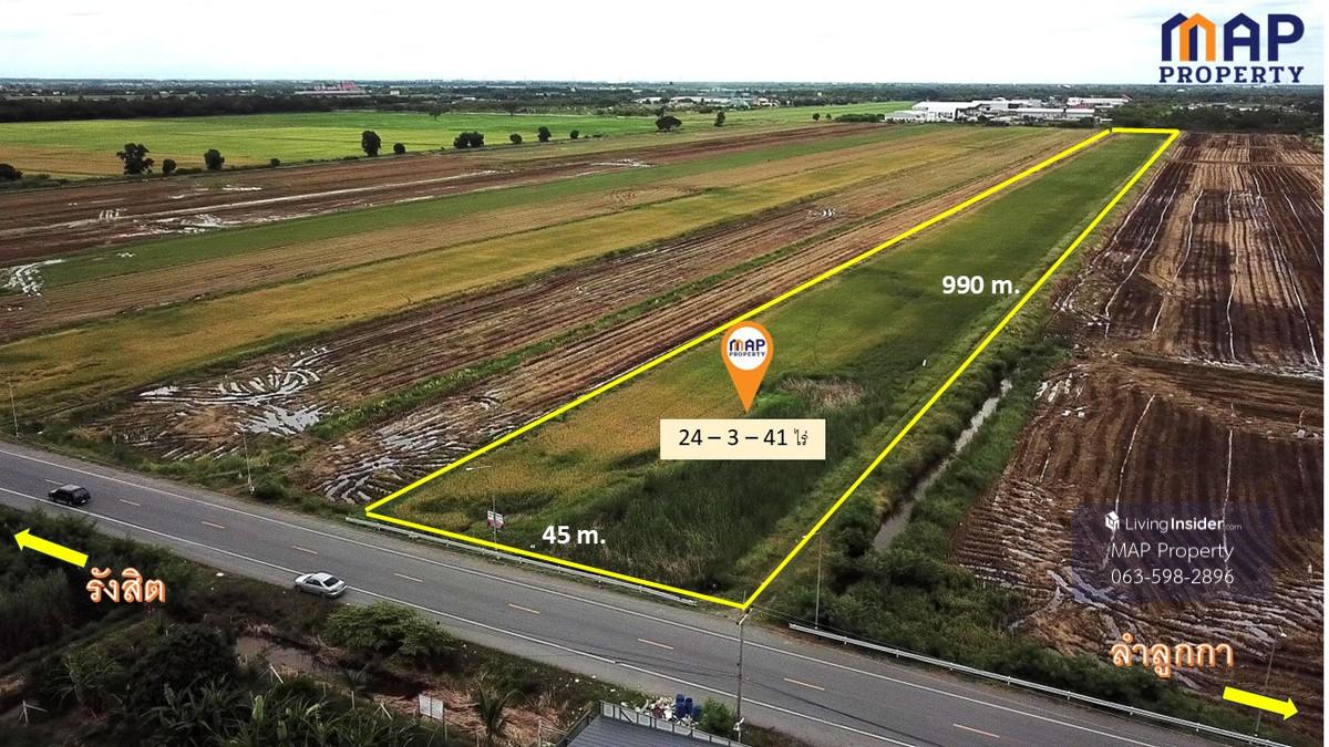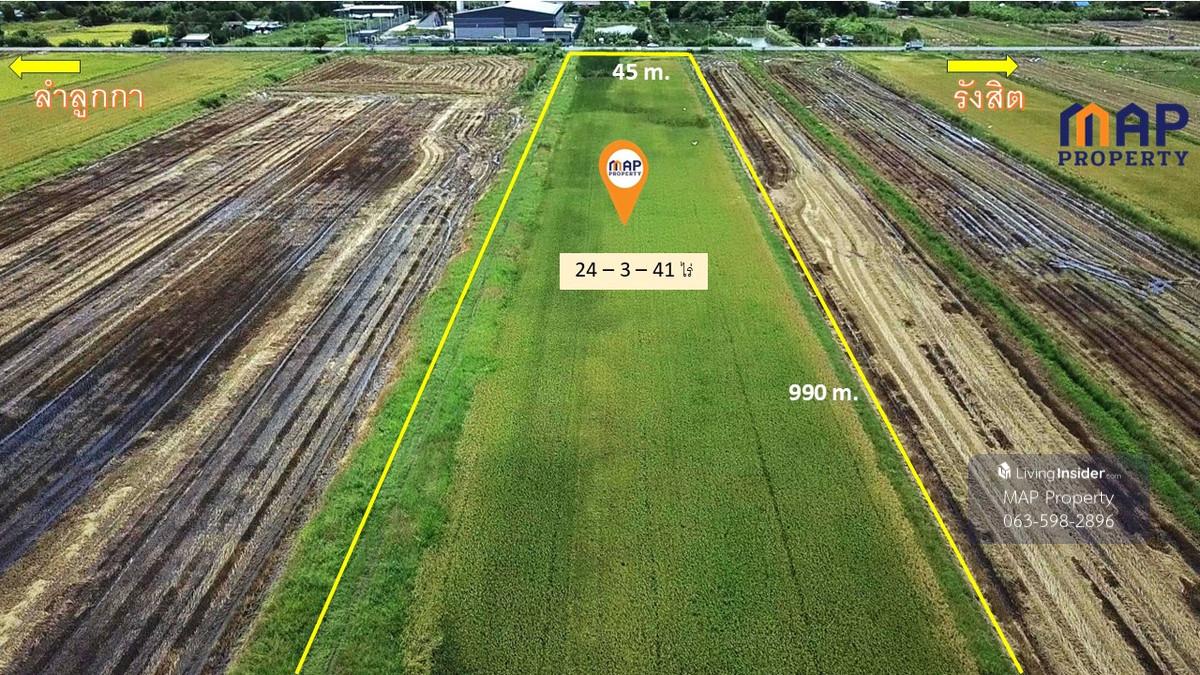 ที่ดินติดถนน เลีบบคลอง 10 ลำลูกา -เนื้อที่ 24 ไร่ 3 งาน 41 ตร.วา. หน้ากว้างที่ดินยาว 990 เมตร การเดินทาง: -5.6 กม.จากถนนลำลูกกา(ปท3312) -7.7 กม.จาก กรมการปกครอง -ใกล้จุด ขึ้น-ลงทางด่วนใหม่ (ทางพิเศษสา
