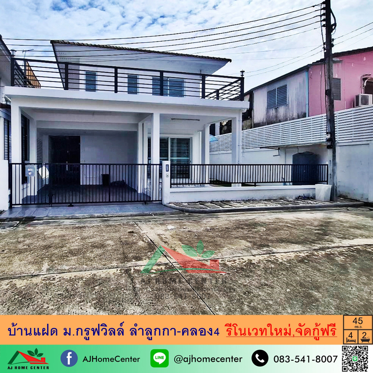 ขายบ้านแฝด45ตรว. ม.กรูฟวิลล์ ลำลูกกา-คลอง4 รีโนเวทใหม่ ต่อเติมครบ จัดกู้ฟรี . บ้านแฝด2ชั้น 45 ตารางวา พื้นที่ใช้สอย 160 ตารางเมตร 4ห้องนอน 2ห้องน้ำ 1ห้องรับแขก 1ห้องครัว 3ที่จอดรถ ***รีโนเวทใหม่ทั้งหลัง*** - ทำสีใหม่ - แถมแอร์3ตัว , โซฟา+ชุดรับแขก / ติดตั้งปั๊มน้ำ-แท็งค์น้ำ - ต่อเติมเทอเรสบริเวณชั้น2 - ต่อเติมหลังคาโรงจอดรถ+ปูกระเบื้อง - ต่อเติมครัวหลังบ้าน+เค้าเตอร์ครัว - ปูหญ้าเทียมข้างบ้าน - หน้าบ้านหันทิศตะวันตกเฉียงเหนือ - อายุทรัพย์สิน 10 ปี . ที่ตั้งทรัพย์สิน : ม.กรูฟวิลล์ ลำลูกกา-คลอง4 ซ.สวนเขียว ถ.ลำลูกกา (ไสวประชาราษฎร์) ต.ลาดสวาย อ.ลำลูกกา จ.ปทุมธานี พิกัดทรัพย์ : https://maps.app.goo.gl/BLVFGscmeqTfn8L38 การเดินทาง เริ่มจาก ทางด่วนกาญจนาภิเษก วงแหวนฯตะวันออก⇒ ถ.ลำลูกกา ⇒ กลับรถ ⇒ ถ.พระองค์เจ้าสาย คลอง 4 ⇒ 600 ม. ถึงโครการ กรูฟวิลล์ ลำลูกกา-คลอง 4 *ใกล้บิ๊กซี ลำลูกกาคลอง 4 . ราคาขาย 3.69 ล้านบาท . จุดเด่น - บ้านรีโนเวทใหม่พร้อมอยู่ - โครงการอยู่ในซอยที่เชื่อมทะลุระหว่างถนนลำลูกกาและถนนรังสิต-นครนายก - เดินทางเข้า-ออกได้หลายเส้นทาง ทั้งถนนลำลูกกา, รังสิต-นครนายก, สายไหม และทางด่วนดอนเมืองโทลเวย์ - ใกล้รถไฟฟ้าสายสีเขียว สถานีคลอง4 - ราคาต่อรองได้ - บริการจัดสินเชื่อฟรีโดยมืออาชีพ - มีบริการรับผ่อนตรงกับบริษัทที่น่าเชื่อถือ . สิ่งอำนวยตวามสะดวก - คลับเฮ้าส์ - สระว่ายน้ำ - สวนสาธารณะ - กล้องวงจรปิด - ระบบรักษาความปลอดภัยตลอด 24 ชม. . สถานที่ใกล้เคียง > ตลาดเอ.ซี คลอง4 > โรงเรียนแย้มสะอาด > โรงเรียนสารสาสน์สายไหม > โรงพยาบาลสายไหม > โรงพยาบาลบีแคร์ > ดรีมเวิลด์ > สนามกีฬาธูปะเตมีย์ . สนใจติดต่อ คุณอ้อย โทร. คลิกเพื่อดูเบอร์โทรติดต่อ / คลิกเพื่อดูเบอร์โทรติดต่อ / คลิกเพื่อดูเบอร์โทรติดต่อ