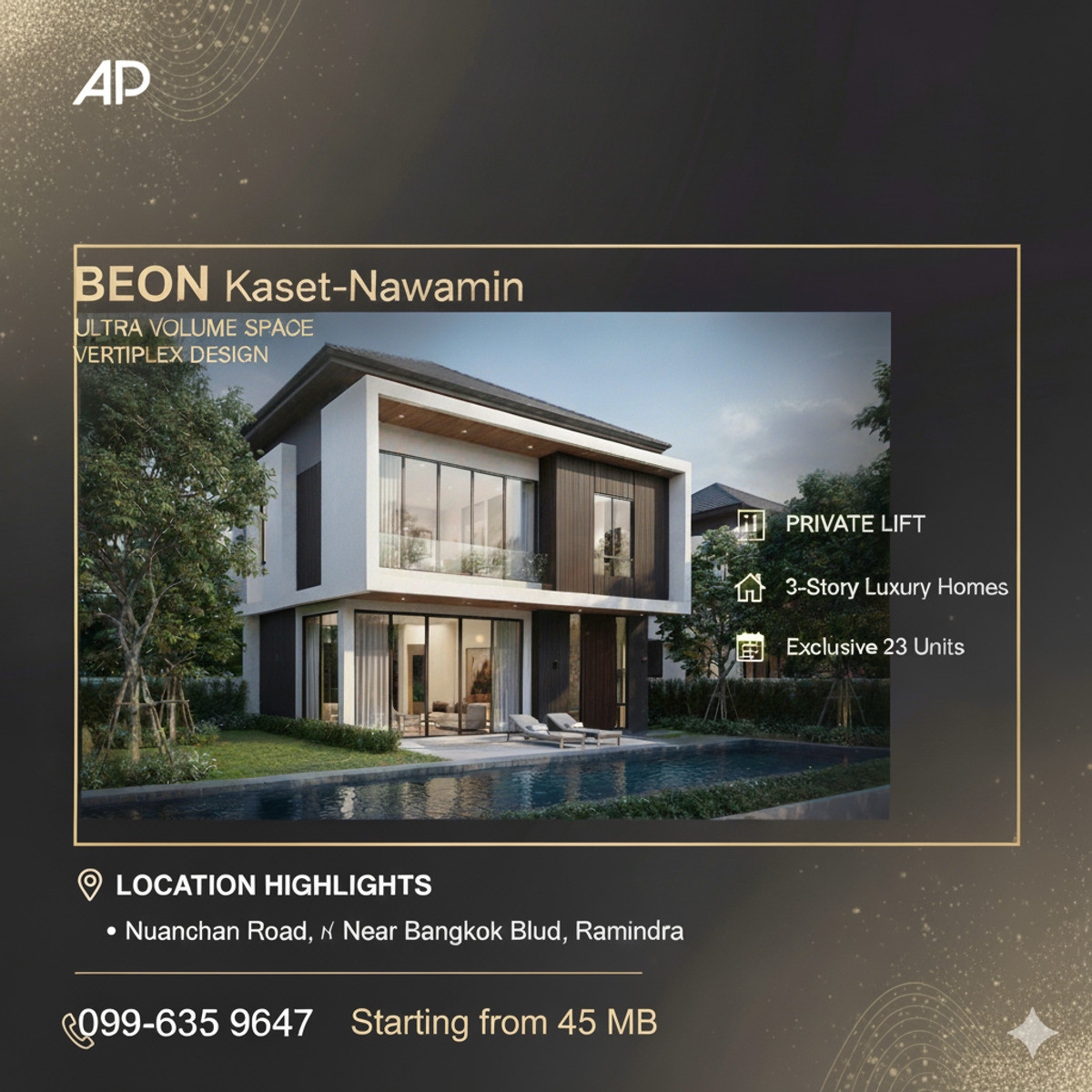 "สัมผัสชีวิตเหนือระดับกับ BEON Kaset-Nawamin บ้านเดี่ยวดีไซน์โมเดิร์นที่ตอบโจทย์ทุกไลฟ์สไตล์ของคนรุ่นใหม่ ในทำเลศักยภาพใจกลางเกษตร–นวมินทร์ มาพร้อมข้อเสนอพิเศษ ดอกเบี้ยถูก ผ่อนสบาย เหมือนได้บ้านหรูในราคาที่เอื้อมถึง"