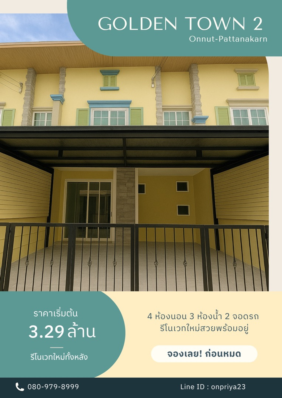 🏡 โกลเด้นทาวน์ 2 อ่อนนุช–พัฒนาการ 💰 ขายเพียง 3.29 ล้านบาท | รีโนเวทใหม่ทั้งหลัง พร้อมเข้าอยู่ได้ทันที 📍 ทำเลดีในซ.อ่อนนุช 65 แยก 14 เดินทางสะดวกใกล้ถนนพัฒนาการ–ศรีนครินทร์–สุขุมวิท ใกล้แหล่งงานและสิ่งอำนวยความสะดวกครบ 📐 พื้นที่ 19.7 ตร.ว. | พื้นที่ใช้สอย 115 ตร.ม. 🛏 4 ห้องนอน | 🚿 3 ห้องน้ำ | 🚗 จอดรถได้ 2 คัน ✨ จุดเด่นของบ้าน • รีโนเวทใหม่ทั้งหลัง พร้อมเข้าอยู่ • บ้านหน้ากว้าง จอดรถสะดวก • ฟังก์ชันครบสำหรับครอบครัว • อยู่ในโครงการคุณภาพ Golden Town พร้อมระบบรักษาความปลอดภัย 24 ชม. ใกล้: แอร์พอร์ตลิงก์หัวหมาก, โลตัส พัฒนาการ, ซีคอนสแควร์, เมกาบางนา, สนามบินสุวรรณภูมิ 📞 สนใจนัดชมบ้านหรือดูรูปเพิ่มเติม คลิกเพื่อดูเบอร์โทรติดต่อ Line ID : onpriya23