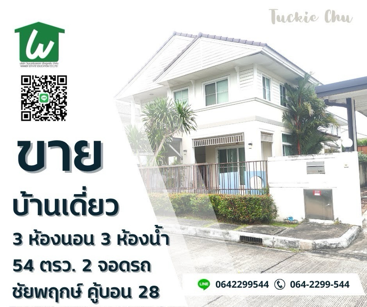 ขายบ้านเดี่ยว 2 ชั้น หมู่บ้านชัยพฤกษ์ รามอินทรา – วงแหวน ขนาด 54 ตร.ว. ซอยคู้บอน 28 รามอินทรา **รายละเอียด** - บ้านเดี่ยว 2 ชั้น จากโครงการคุณภาพ บริษัท แลนด์ แอนด์ เฮ้าส์ - ที่ตั้ง ซอยคู้บอน 28 แขวงรามอินทรา เขตคันนายาว กรุงเทพมหานคร - เนื้อที่ 54 ตารางวา พื้นที่ใช้สอย 158 ตารางเมตร - 3 ห้องนอน 3 ห้องน้ำ 1 ห้องครัวกั้นแยก 1 ห้องรับแขก - ที่จอดรถ 2 คัน หมดกังวลเรื่องที่จอดรถ - มีพื้นที่สวนบริเวณรอบบ้าน สามารถปลูกต้นไม้ จัดแต่งตามสไตล์ - สร้างพื้นที่พักผ่อนส่วนตัวของคุณได้เลย **บรรยากาศในหมู่บ้าน เงียบสงบ ร่มรื่น มีเพียง 120 ครอบครัวเท่านั้น มีพื้นที่สวนกลางให้ลูกบ้าน กว้างขวาง น่าอยู่ ถนนหน้าบ้านกว้าง และสระว่ายน้ำ **สิ่งอำนวยความสะดวก** - สระว่ายน้ำ - สวนสาธารณะ - สนามเด็กเล่น **สถานที่ใกล้เคียง** - ใกล้ทางด่วนบางนา-บางปะอิน - ใกล้ทางด่วนจตุโชติ - แฟชั่นไอส์แลนด์ - ซาฟารีเวิลด์ - สนามบินสุวรรณภูมิ - โรงพยาบาลสินแพทย์ - โรงพยาบาลพญาไท นวมินทร์ แผนที่ตั้งโครงการ https://maps.app.goo.gl/z6Rg3x1eZnJLHfwFA =========================== ราคาขาย 4,990,000 บาท ค่าใช้จ่ายการโอนทั้งหมด 50:50 =========================== สอบถามข้อมูลเพิ่มเติมปรึกษาเรื่องบ้าน โทร: ตั๊กกี้ คลิกเพื่อดูเบอร์โทรติดต่อ LINE : https://line.me/ti/p/cdPhoR5pdr #รับฝากขาย-เช่า บ้าน ที่ดิน คอนโด อาคารพาณิชย์ โรงงาน โกดัง อสังหาริมทรัพย์ทุกประเภท #ให้คำปรึกษาและจัดหาสินเชื่อทุกธนาคาร มีบริการจัดทำการตลาดเต็มรูปแบบ ไม่มีค่าใช้จ่ายล่วงหน้า #รับจัดหาบ้านคอนโดที่ดินตามความต้องการ #รับฝากขายบ้านคอนโดที่ดินและอสังหาฯทุกประเภท #ให้คำแนะนำในการกำหนดราคาที่เหมาะสม #ชัยพฤกษ์ #คู้บอน #รามอินทรา #วงแหวน #จตุโชติ #ฟรีการตลาดคุณภาพตรงกลุ่มเป้าหมาย #ฟรีป้ายหน้าทรัพย์และป้ายกองโจร #ที่ปรึกษาอสังหาริมทรัพย์ #ที่ปรึกษาอสังหา #บ้านเดี่ยว2ชั้น #บ้านเดี่ยว #บ้านแฝด #บ้าน #คอนโดหรู #คอนโด #ที่ดิน #โกดัง #จำนอง #ขายฝาก #การตลาด #จัดเต็ม #การลงทุน