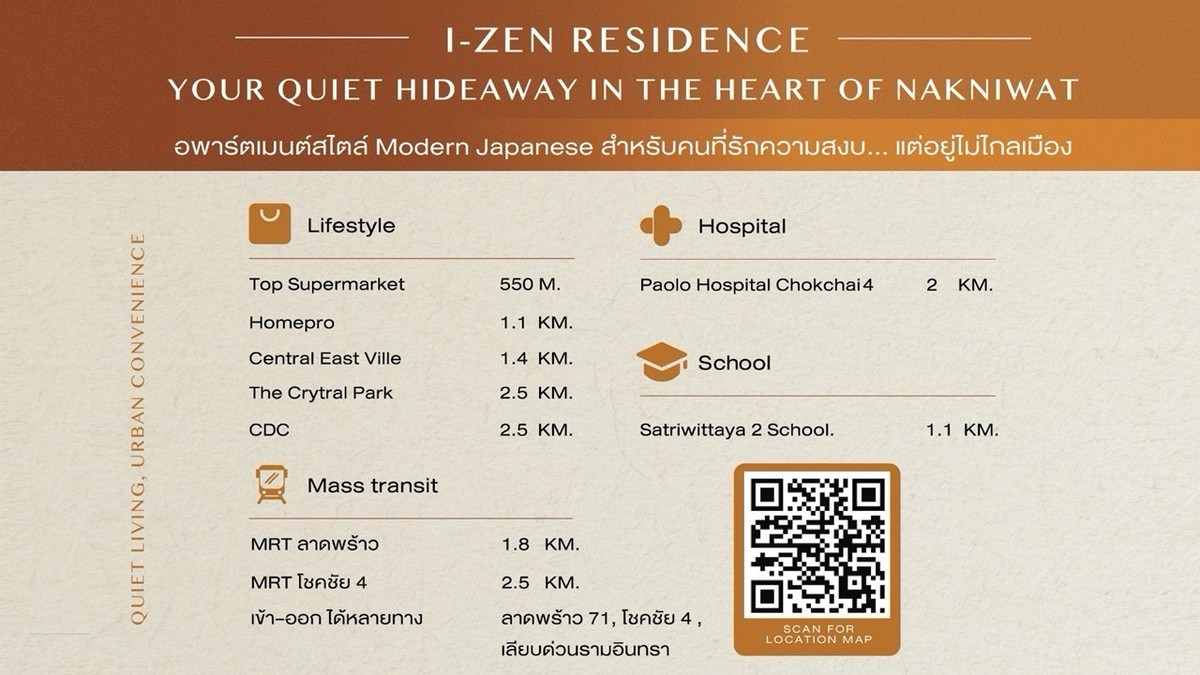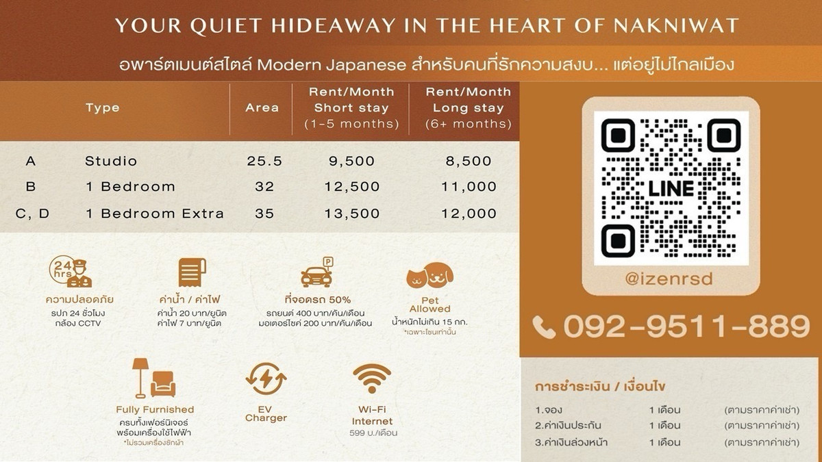 ✨ I-ZEN RESIDENCE – Modern Japanese Hideaway ✨ Luxury อพาร์ตเมนต์สไตล์ Modern Japanese ใจกลาง ถนนนาคนิวาส ทำเลสงบแต่ใกล้เมือง ใกล้ Central Eastville, The Crystal Park, CDC และ MRT ลาดพร้าว / โชคชัย 4 เหมาะกับคนทำงาน คนรุ่นใหม่ และครอบครัวเล็กที่ต้องการความเป็นส่วนตัว เพียงไม่กี่ยูนิต ⸻ 🏠 ประเภทห้อง & ราคา Long Stay (6 เดือนขึ้นไป) • Studio 25.5 ตร.ม. → 8,500 บ./ด. • 1 Bedroom 32 ตร.ม. → 11,000 บ./ด. • 1 Bedroom Extra 35 ตร.ม. → 12,000 บ./ด. ⸻ ✅ Fully Furnished + เครื่องใช้ไฟฟ้าครบ พร้อมเข้าอยู่ได้ทันที • เฟอร์นิเจอร์บิลท์อิน / ตู้เสื้อผ้า / โต๊ะทำงาน • เตียง + ที่นอนคุณภาพ • ชั้นวางทีวี • ครัวบิลท์อิน + ซิงก์ • เครื่องใช้ไฟฟ้า: แอร์, ทีวี, ตู้เย็น, เครื่องทำน้ำร้อน • เครื่องซักผ้า* 500 บาท/ เดือน • Internet Wi-Fi* สัญญา 1 ปี ฟรี Wifi ⸻ 🏢 สิ่งอำนวยความสะดวก • ระบบรักษาความปลอดภัย 24 ชม. + กล้อง CCTV • ลิฟต์ •เข้าออกด้วยคีย์การ์ด • EV Charger • ลานจอดรถกว้าง (รถยนต์ 400 บ./คัน/ด., มอเตอร์ไซค์ 200 บ./คัน/ด.) ⸻ 🎁 โปรโมชั่นพิเศษ ทำสัญญา 1 ปี ฟรี! Wifi 🐾 พิเศษ! โซน Pet Allowed รองรับผู้เช่าที่ต้องการอยู่กับสัตว์เลี้ยง พร้อมกฎระเบียบชัดเจน ดูแลง่าย (จำนวนยูนิตจำกัด — สอบถามได้เลย)** 📍 สอบถามรายละเอียด ✅Line:@izenrsd หรือกดลิ้ง 👇👇👇 https://lin.ee/BYPlXZn 📌Map: https://maps.app.goo.gl/7kjPVQajrcuudYvn8 โทร คลิกเพื่อดูเบอร์โทรติดต่อ