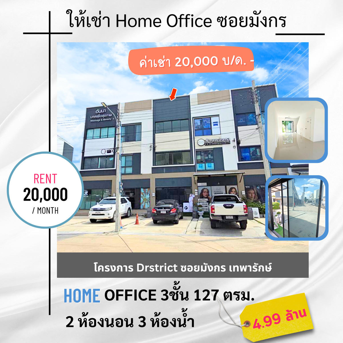 🏢 โฮมออฟฟิศ 3 ชั้น District เทพารักษ์ (ซอยมังกร – แพรกษา 11) เหมาะทำออฟฟิศ | ค้าขาย | อยู่อาศัย 💰 ราคา 4.99 ล้านบาท 💵 ให้เช่า 20,000 บาท/เดือน 📐 ขนาด 23.3 ตร.ว. | พื้นที่ใช้สอย 127.6 ตร.ม. ✨ รายละเอียดตัวอาคาร ทาวน์โฮมส์ 3 ชั้น 2ห้องนอน 3 ห้องน้ำ แอร์รวม 4 เครื่อง แทงค์น้ำ + ปั๊มน้ำ ระบบท่อปลวกทั้งหลัง ถังบำบัดไร้กลิ่น (ถังแซก) ข้อมูลโครงการ DISTRICT เทพารักษ์ พื้นที่โครงการ 3-3-35.51 ไร่ ห้องทั้งหมด 40 ยูนิต 🚗ลานจอดรถ ส่วนกลาง 20 คัน 🏠 ฟังก์ชันพื้นที่ภายใน ชั้น 1: พื้นที่โล่ง เหมาะทำออฟฟิศ/ร้านค้า (+แอร์ 1 ตัว) ชั้น 2: พื้นที่โล่ง เป็นสำนักงาน สต๊อกสินค้า (+แอร์ 1 ตัว) ชั้น 3: แบ่ง 2 ห้องนอน มีห้องน้ำ +แอร์ 2 ตัว 📍 ทำเลดี ซอยมังกร – เทพารักษ์ (แพรกษา 11) แผนที่ : https://maps.app.goo.gl/JgNE1geuronTSFzt7 📌 สถานที่ใกล้เคียง โรงเรียนสุขเจริญผล แพรกษา ทางด่วนวงแหวนกาญจนา เทพารักษ์ ไปเมกะบางนาง่าย เชื่อมต่อถนนแพรกษา / นิคมอุตสาหกรรมบางปู เดินทางไปเมกะบางนา สะดวก 📞 สนใจติดต่อ คุณอาทิตย์ คลิกเพื่อดูเบอร์โทรติดต่อ 💬 Line : sun.agent ตัวแทนรับฝากขาย–ให้เช่าบ้านและที่ดินมืออาชีพ