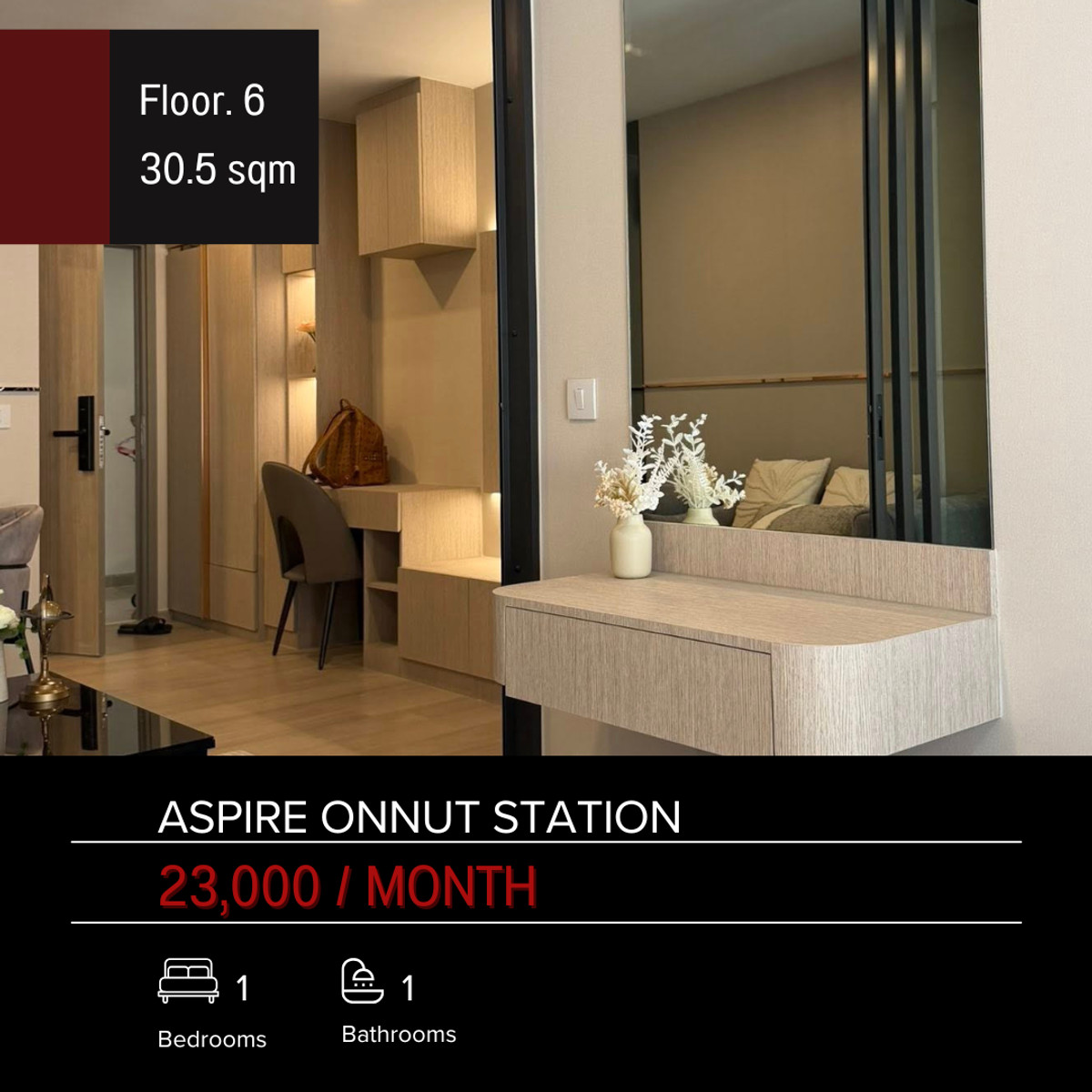 For Rent Ready to move Condo : Aspire Onnut Station Size : 30.5 SQM Floor. 6 Type: 1 bedroom 1 bathroom Rent Price : 23,000 Baht Tel. คลิกเพื่อดูเบอร์โทรติดต่อ ( Anda ) WhatsApp คลิกเพื่อดูเบอร์โทรติด