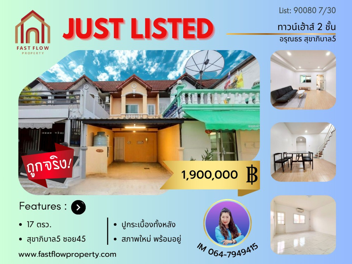 ขาย ทาวน์เฮ้าส์ 2 ชั้น ม.อรุณธร ซอยสุขาภิบาล 5 ซอย 45 ใกล้ถนนจตุโชติ วัชรพล ทางด่วนฉลองรัช เส้นทางเชื่อมต่อ ถนนหทัยราษฎร์ ถนนเพิ่มสิน ถนนสายไหม ถนนพหลโยธิน IM สนใจติดต่อ รันญรัตน์ (อิม) Fast Flow Property คลิกเพื่อดูเบอร์โทรติดต่อ เบอร์ Line : คลิกเพื่อดูเบอร์โทรติดต่อ Listing no : 90080 Property Detail: - ขาย ทาวน์เฮ้าส์ 2 ชั้น ม.อรุณธร สุขาภิบาล5 - บ้านตำแหน่งดี อยู่ติดถนนเมน - ที่ดิน 17 ตารางวา - พื้นที่ใช้สอย 100 ตารางเมตร รวมต่อเติมครัวและโรงรถ - หน้าบ้านหันทิศเหนือ ไม่ค่อยโดนแดด บ้านเย็นสบาย - มี 2 ห้องนอน 2 ห้องน้ำ - ต่อเติมครัวไทยด้านหลังบ้าน เต็มพื้นที่ เคาน์เตอร์ครัวปูนอย่างดี - ต่อเติมโรงรถ พร้อมปูกระเบื้อง จอดรถในร่มได้ 1 คัน - ชั้นล่างปูกระเบื้อง ชั้นบนปูกระเบื้อง - ขายบ้านเปล่า ตกแต่งต่อเติมได้ง่าย - ขายพร้อมเครื่องปรับอากาศ 1 เครื่อง Project and Facilities: - โครงการ ม.อรุณธร พัฒนาโดยบริษัทมาร์ค แลนด์ พลาซ่า จำกัด - ค่าส่วนกลาง 100 บาท ต่อเดือน - CCTV และ รปภ. 24 ชั่วโมง สถานที่ใกล้เคียง: - ทางด่วนฉลองรัช, ทางด่วนกาญจนาภิเษก บางปะอิน-บางนา - ตลาดออเงิน, ตลาดถนอมมิตร, ตลาดวงศกร, ตลาดมารวย - เพลินนารี่มอลล์, บิ๊กซี สุขาภิบาล5 - สำนักงานเขตสายไหม, สนามบินดอนเมือง - โรงเรียนสารสาสน์วิเทศน์, โรงเรียนรัตนโกสินทร์สมโภช บางเขน, โรงเรียนวัดออเงิน, โรงเรียนฤทธิยะวรรณาลัย, โรงเรียนนวมินทราชินูทิศ - โรงพยาบาลสายไหม, โรงพยาบาล CGH, โรงพยาบาลภูมิพล ตำแหน่งที่ตั้ง https://maps.app.goo.gl/PGFiuwifRdptvWtt7 ราคา 1,900,000 บาท บริการช่วยเหลือจัดหาสินเชื่อธนาคารฟรี! สามารถนัดเข้าชมสถานที่จริงได้ทุกวัน สนใจราคาคุยกันได้ ติดต่อ คุณรันญรัตน์ (อิม) คลิกเพื่อดูเบอร์โทรติดต่อ เบอร์ Line: คลิกเพื่อดูเบอร์โทรติดต่อ ติดต่อ Fast Flow Property Office Tel: คลิกเพื่อดูเบอร์โทรติดต่อ Line id: @fastflow FB page: facebook.com/fastflowproperty www.fastflowproperty.com บริการรับฝากขายอสังหาริมทรัพย์ทุกประเภท ฟรีค่าโฆษณา