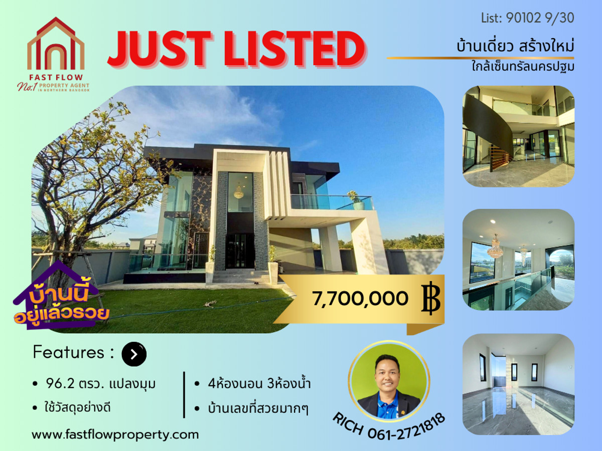 ขาย บ้านเดี่ยว ใกล้เซ็นทรัลนครปฐม ติดถนนสาธารณะ 2 ด้าน บ้านเลขที่สวย พร้อมอยู่ ไม่เคยพักอาศัย วัสดุอย่างดี ถนนยิงเป้าใต้ ซอยตรงข้าม สวนราชพฤกษ์เอราวัณ สนามจันทร์ RICH สนใจติดต่อ บุณยฤทธิ์ Fast Flow Property คลิกเพื่อดูเบอร์โทรติดต่อ Line id: คลิกเพื่อดูเบอร์โทรติดต่อ Listing no : 90102 Property Detail: - ขาย บ้านเดี่ยว 2 ชั้น สร้างใหม่ ใกล้เซ็นทรัลนครปฐม - บ้านตำแหน่งดี หลังมุม อยู่ติดถนนสาธารณะ 2 ด้าน - บ้านเลขที่สวย ขั้นเทพ - ที่ดิน 96.2 ตารางวา - ตัวบ้านพื้นที่ใช้สอย 250 ตารางเมตร - หน้าบ้านหันทิศใต้ ลมดี อากาศถ่ายเทสะดวก - เป็นบ้านติดถนนสาธารณะ 2 ด้าน เงียบสงบ ไม่พลุกพล่าน - มี 4 ห้องนอน 3 ห้องน้ำ ห้องนั่งเล่น ห้องทำงาน - มีห้องนอนชั้นล่างพร้อมห้องน้ำ สำหรับผู้สูงอายุ - เคาน์เตอร์ครัวปูนอย่างดี พร้อมซิงค์ล้างจาน - โรงรถปูกระเบื้อง จอดรถในร่มได้ 2 คัน จอดกลางแจ้งในรั้วได้อีก อย่างน้อย 2 คัน - ชั้นล่างและชั้นบน ปูแกรนิตโต้ แผ่นใหญ่สวยหรู - ขายบ้านเปล่า ตกแต่งต่อเติมได้ง่าย - ขายพร้อมเครื่องปรับอากาศ 3 เครื่อง - บ้านใหม่ ไม่เคยพักอาศัย! - ใช้วัสดุอย่างดี สถานที่ใกล้เคียง: - เซ็นทรัลนครปฐม, โลตัส นครปฐม, บิ๊กซี เพลส นครปฐม, แม็คโคร นครปฐม, ไทวัสดุ นครปฐม, โกลบอลเฮ้าส์ นครปฐม - สนามกอล์ฟ THE PITCH GOLF AND YOGA - สวนราชพฤกษ์ เอราวัณ ตำบลสนามจันทร์ - มหาวิทยาลัยศิลปากร วิทยาเขตพระราชวังสนามจันทร์, โรงเรียนสิรินธรราชวิทยาลัย (ในพระราชูปถัมภ์) - อบจ. นครปฐม, ศาลากลางจังหวัดนครปฐม - โรงพยาบาลส่งเสริมสุขภาพตำบลสนามจันทร์, โรงพยาบาลกรุงเทพ สนามจันทร์, โรงพยาบาลสินแพทย์ นครปฐม, โรงพยาบาล นครปฐม ตำแหน่งที่ตั้ง https://maps.app.goo.gl/nnQT5zNaoBKGUjJ3A ราคา 7,700,000 บาท บริการช่วยเหลือจัดหาสินเชื่อธนาคารฟรี! สามารถนัดเข้าชมสถานที่จริงได้ทุกวัน สนใจราคาคุยกันได้ ติดต่อ บุณยฤทธิ์ คลิกเพื่อดูเบอร์โทรติดต่อ Line id: @fastflow ติดต่อ Fast Flow Property Office Tel: คลิกเพื่อดูเบอร์โทรติดต่อ Line id: @fastflow FB page: facebook.com/fastflowproperty www.fastflowproperty.com บริการรับฝากขายอสังหาริมทรัพย์ทุกประเภท ฟรีค่าโฆษณา