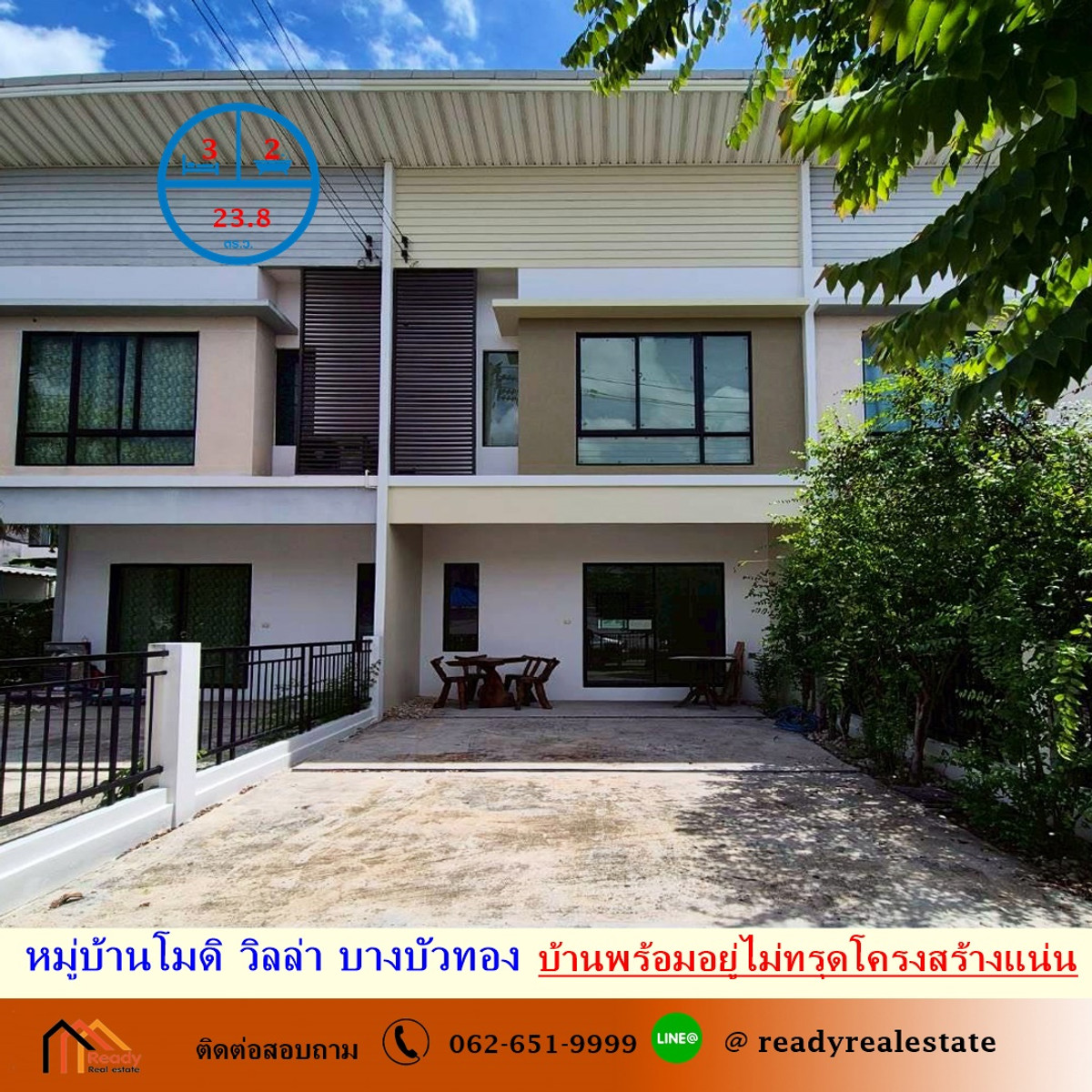ขาย ทาวน์เฮ้าส์ 23.8 ตร.ว ม.โมดิ วิลล่า บางบัวทอง บ้านพร้อมอยู่ไม่ทรุดโครงสร้างแน่น ทำเลดีใกล้ตลาดสมบัติบุรี ทาวน์เฮ้าส์ 2 ชั้น เนื้อที่ 23.8 ตารางวา พื้นที่ใช้สอย 125 ตารางเมตร +3 ห้องนอน + 2 ห้องน้ำ + 1 รับแขก + 1 ห้องครัว + 2 ที่จอดรถ ค่าส่วนกลาง: 524 บาท / เดือน ชื่อโครงการ : ม.โมดิ วิลล่า บางบัวทอง ที่ตั้ง : ซ.สามวัง ถ.กาญจนาภิเษก ตำบลบางบัวทอง อำเภอบางบัวทอง จังหวัดนนทบุรี 11110 พิกัด : https://goo.gl/maps/xsuDdrXsC6CQ62AAA ราคาขาย 2,390,000 บาท จุดเด่น - บ้านอยู่ช่วงต้นโครงการ โครงสร้างแน่น ไม่ทรุด - พื้นที่หน้าบ้านลึกพิเศษถึง 9 เมตร - ไม่มีบ้านตรงข้าม หน้าบ้านโล่ง โปร่ง สงบ - ทิศเหนือ ไม่ร้อนตอนบ่าย - รีโนเวทใหม่ทั้งหลัง: ทาสีใหม่ พื้นไม้ชั้น 2 เปลี่ยนใหม่หมด - ราคาต่ำกว่าตอนโครงการเปิดตัว! - โฉนดปลอดภาระ พร้อมโอน - จัดสินเชื่อยืนกู้ฟรี สิ่งอำนวยความสะดวก – สวนสาธารณะ – รปภ., CCTV – สระว่ายน้ำ – สนามเด็กเล่น – เข้าออกโครงการด้วย Easy Pass Card – สัญญาณกันขโมยติดให้ทุกหลัง สถานที่ใกล้เคียง – Central West Gate : 9.2 กม. – บางใหญ่ Night Plaza (BB Market) : 11.2 กม. – Index Living Mall : 11.3 กม. – Plus Mall (Lotus บางใหญ่) : 17.3 กม. – Pop Market : 6.7 กม. – Pure Place ราชพฤกษ์ : 8 กม. – รพ.เกษมราษฏร์ : 8.1 กม. – ตลาดบางบัวทอง : 3.1 กม. – รร.เตรียมพัฒน์ นนทบุรี : 11.4 กม. – รร.นนทบุรีวิทยาลัย : 9.4 กม. – สะพานพระราม 4 : 12.4 กม. – สะพานนวลฉวี : 16.7 กม. สนใจสอบถามรายละเอียดเพิ่มเติม คุณออย เบอร์โทรศัพท์ คลิกเพื่อดูเบอร์โทรติดต่อ / คลิกเพื่อดูเบอร์โทรติดต่อ Line: @ readyrealestate