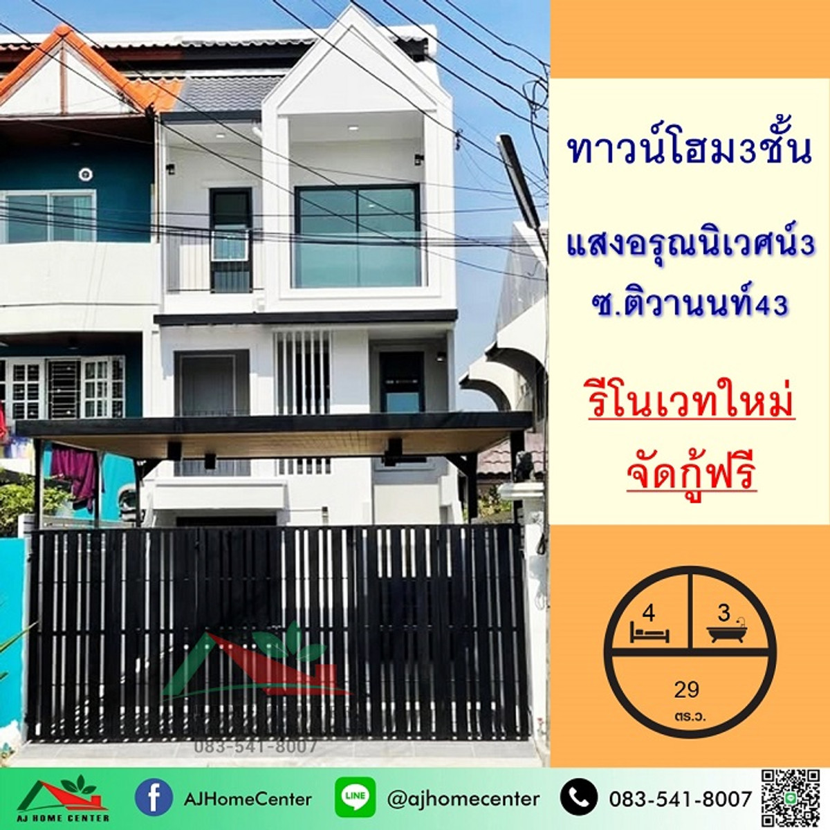 รีโนเวทใหม่ ขายทาวน์โฮม3ชั้น 29ตรว. ม.แสงอรุณนิเวศน์3 ซ.ติวานนท์43 รีโนเวทใหม่ ภายในเล่นระดับ จัดกู้ฟรี . ทาวน์โฮม3ชั้น เนื้อที่ 29 ตารางวา พื้นที่ใช้สอย 220 ตารางเมตร 4ห้องนอน 3ห้องน้ำ 1ห้องครัว 1ห้องรับแขก 2ที่จอดรถ ***รีโนเวทใหม่ทั้งหลัง*** - ทำสีใหม่ทั้งภายในและภายนอก - ต่อเติมหลังคาหน้าบ้าน+ปูพื้นกระเบื้อง - ต่อเติมครัว+เค้าเตอร์+อ่างล้างจาน - ต่อเติมพื้นที่ด้านหลังบ้าน - แถมปั๊มน้ำ , แทงค์น้ำ - วัสดุปูพื้น : ชั้นล่าง – แกรนิตโต้ / ชั้นบน – ลามิเนต . ที่ตั้งทรัพย์สิน : ม.แสงอรุณนิเวศน์3 ซ.ติวานนท์43 ต.ท่าทราย อ.เมือง จ.นนทบุรี การเดินทาง เริ่มจาก ถนนติวานนท์ เข้าสู่ซอยติวานนท์ 43 ตรงไปประมาณ 260 เมตร แล้วเลี้ยวขวาเข้าสู่ซอยหมู่บ้านแสงอรุณนิเวศน์ 3 ตรงไปประมาณ 100 เมตร บ้านจะอยู่ด้านขวามือ พิกัด : https://maps.app.goo.gl/iRBPFMdApPAJwS2h9 . ราคาขาย 3.89 ล้านบาท . จุดเด่น - ทาวน์โฮม 3 ชั้น สวย รีโนเวทใหม่ทั้งหลัง - ภายในเล่นระดับ ต่อเติมครบ พร้อมอยู่ - อยู่ห่างจากรถไฟฟ้า สายสีชมพู สถานีสามัคคี เพียง 350 เมตร - ใกล้ทางพิเศษศรีรัช 5 กม. - เดินทางสะดวก ทั้งถนนสามัคคี ถนนติวานนท์ และถนนสนามบินน้ำ - ใกล้ห้าง แหล่งช็อปปิ้ง ศูนย์ราชการ - ราคาต่อรองได้ - บริการจัดสินเชื่อฟรีโดยมืออาชีพ . สถานที่ใกล้เคียง - ตลาดชลประทาน 1.3 กม. - โลตัส แคราย 3.4 กม. - ศูนย์ราชการนนทบุรี 4. 4 กม. - ตลาดนกฮูก 4.9 กม. - เดอะมอลล์งามวงศ์วาน 5.9 กม. - โรงพยาบาลเกษมราษฎร์ประชาชื่น 7.9 กม. - ท่าน้ำนนท์ 7.9 กม. . สนใจติดต่อ คุณบู้ เบอร์โทรศัพท์ คลิกเพื่อดูเบอร์โทรติดต่อ / คลิกเพื่อดูเบอร์โทรติดต่อ / คลิกเพื่อดูเบอร์โทรติดต่อ
