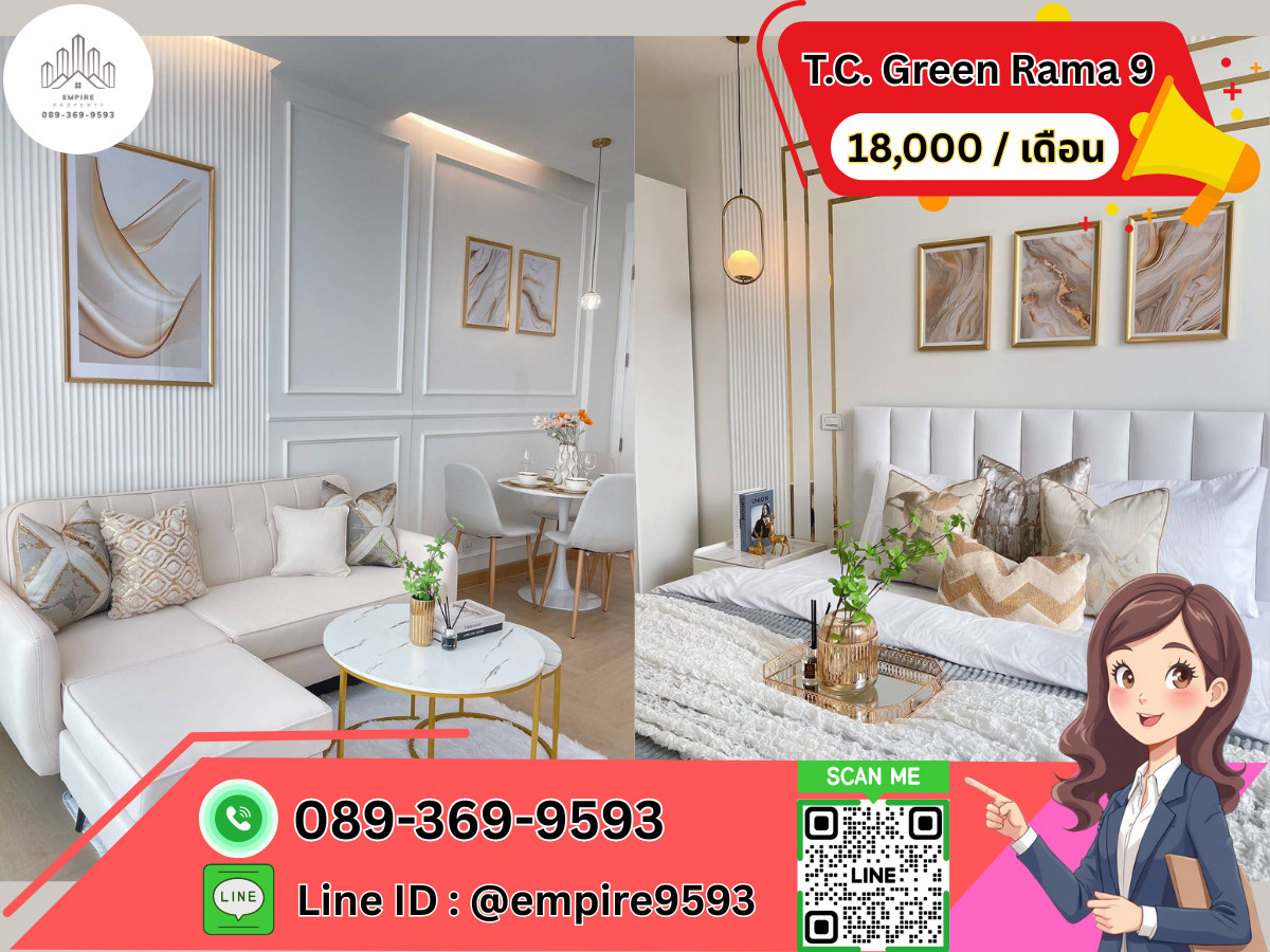 ให้เช่า 🎯TC Green Rama 9 ใกล้ MRT พระราม 9 น่าอยู่ 📍Line : @empire9593 📍 🛏️รายละเอียดห้อง: • ขนาด: 38 ตร.ม. • ประเภท: 1 ห้องนอน 1 ห้องน้ำ • ตึก B ชั้น: 14 วิวเมือง • เฟอร์นิเจอร์ + เครื่องใช้ไฟฟ้าครบ (ทีวี, แอร์, ตู้เย็น, เครื่องซักผ้า, ไมโครเวฟ, เครื่องทำน้ำอุ่น, เตาไฟฟ้าพร้อมที่ดูดควัน) 🏢สิ่งอำนวยความสะดวกโครงการ: • สระว่ายน้ำ / ฟิตเนส • สวนหย่อม / พื้นที่จัดบาร์บีคิว • ระบบรักษาความปลอดภัย 24 ชั่วโมง • ที่จอดรถ ทำเล: 📍 ใกล้ MRT พระราม 9 📍 ติดถนนใหญ่ ใกล้จุดขึ้นลงทางด่วน 📍 ใกล้เซ็นทรัล พระราม 9, RCA, โรงพยาบาลปิยะเวท 💰 ให้เช่า เพียง : 18,000 บาท/เดือน เงื่อนไขการเช่า: มัดจำ 2 เดือน ล่วงหน้า 1 เดือน ติดต่อสอบถาม / นัดชมห้อง: 📞 โทร: คลิกเพื่อดูเบอร์โทรติดต่อ 📱 Line ID: @empire9593 📧 Email: คลิกเพื่อดูอีเมล 🏡 รับฝากขาย - เช่า บ้าน | ที่ดิน | คอนโด | อสังหาริมทรัพย์ทุกประเภท 📌 บริการครบวงจร • ให้คำปรึกษาด้านการซื้อ – ขายอสังหาริมทรัพย์ • รับปรึกษาและยื่นสินเชื่อให้ ทุกอาชีพ มีเจ้าหน้าที่ดูแลทุกขั้นตอนกับทุกธนาคาร 📣 ลงโฆษณาฟรี! ช่วยคุณโปรโมททรัพย์ให้ ขาย / เช่า ได้ไวกว่าเดิม 📞 สนใจติดต่อเราได้เลย พร้อมให้คำปรึกษาแบบมืออาชีพ!