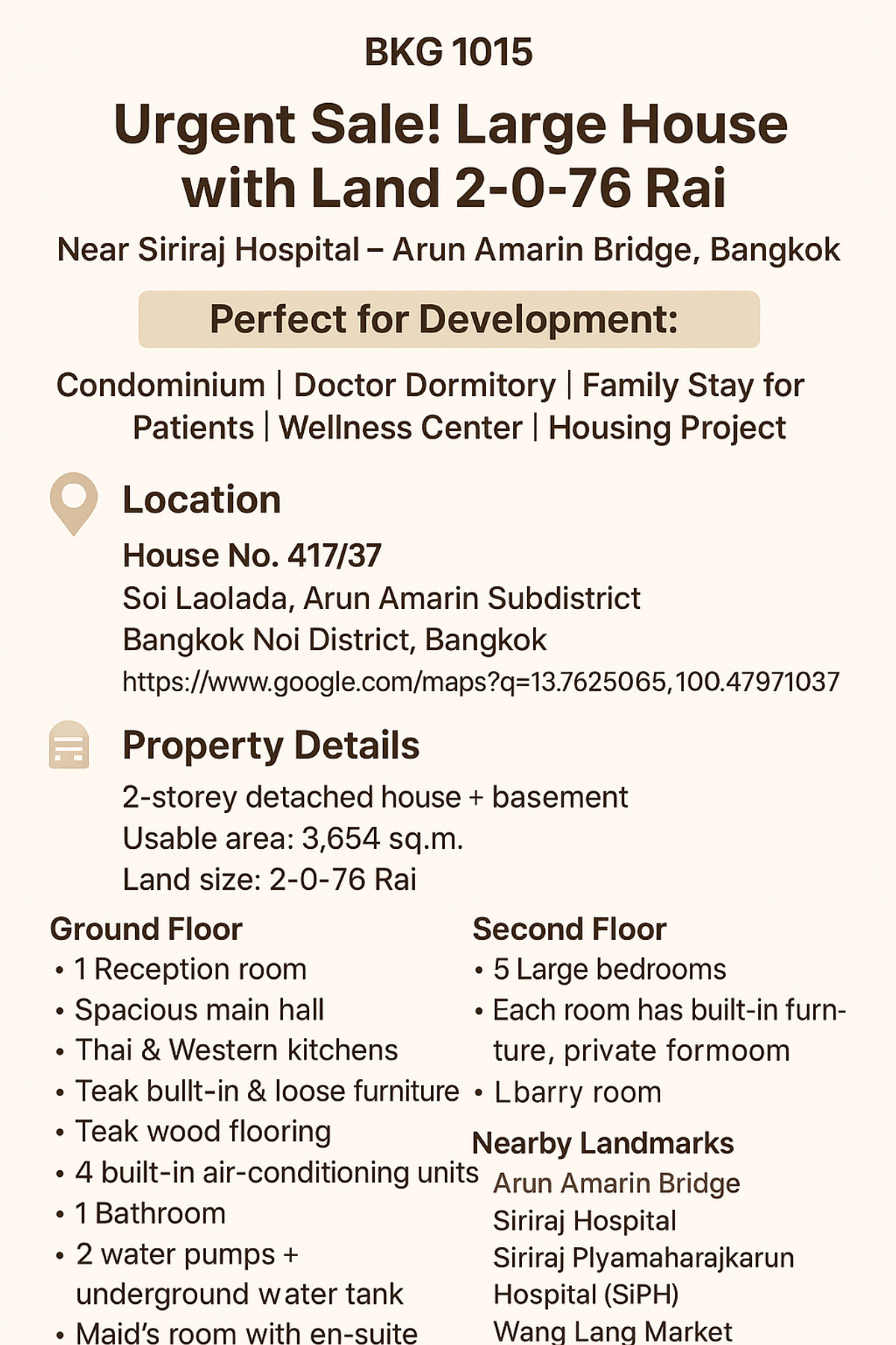 BKG 1015 ขายด่วนบ้านพร้อมที่ดินแปลงใหญ่ 2-0-76 ไร่ ใกล้ รพ.ศิริราช สะพานอรุณอัมรินทร์ พื้นที่สามารถพัฒนาเป็น คอนโดฯ หอพักแพทย์ /คนที่มาเฝ้าไข้ Wellness บ้านจัดสรร ย่านอรุณอัมรินท์ ศิริราช กรุงเทพมหานคร ที่ตั้ง บ้านเลขที่ 417/37 ซอยเหล่าลดา แขวงอรุณอัมรินทร์ เขตบางกอกน้อย กรุงเทพมหานคร รายละเอียด บ้านเดี่ยว 2 ชั้น พร้อมชั้นใต้ดิน ขนาด 3,654 ตร.ม ที่ดิน 2-0-76 รวม 3 โฉนด ชั้น 1 -ห้องรับรอง 1 ห้อง -ห้องโถ่งใหญ่ -ห้องครัวไทย/ครัวฝรั่ง -เฟอนิเจอร์บิวอินไม้สัก/เฟอนิเจอร์ลอยตัว -พื้นไม้สัก -เครื่องปรับอากาศแบบฝัง 4 ตัว -ห้องน้ำ 1 ห้อง -ปั๊มน้ำ 2 ตัว ถังสำรองน้ำใต้ดิน -ห้องคนรับใช้ห้องน้ำในตัว ชั้น 2 -ห้องนอนขนาดใหญ่ 5 ห้อง พร้อมเฟอร์บิวอิน ห้องน้ำและระเบียงทุกห้อง ชั้นใต้ดิน -ห้องหนังสือ 1 ห้อง -ห้องเก็บของ สถานที่ใกล้เคียง -สะพานอรุณอัมรินทร์ -รพ.ศิริราช -ตลาดรถไฟธนบุรี -อาคารมูลนิธิอิสลาม ราคา 200,000,000 ล้านบาท (ค่าธรรมเนียมการโอนคนละครึ่ง) ติดต่อหนิง คลิกเพื่อดูเบอร์โทรติดต่อ 🏡 BKG 1015 | Urgent Sale! Large House with Land 2-0-76 Rai 📍 Near Siriraj Hospital – Arun Amarin Bridge, Bangkok ✨ Perfect for Development: Condominium | Doctor Dormitory | Family Stay for Patients | Wellness Center | Housing Project Prime location in the heart of Arun Amarin – Siriraj, Bangkok. 📌 Location House No. 417/37 Soi Laolada, Arun Amarin Subdistrict Bangkok Noi District, Bangkok 📍 Google Maps: https://www.google.com/maps?q=13.76425065,100.47971037 🏠 Property Details 2-storey detached house + basement Usable area: 3,654 sq.m. Land size: 2-0-76 Rai (3 Title Deeds) 🧱 Ground Floor 1 Reception room Spacious main hall Thai & Western kitchens Teak built-in and loose furniture Teak wood flooring 4 built-in air-conditioning units 1 Bathroom 2 water pumps + underground water tank Maid’s room with en-suite bathroom 🛏 Second Floor 5 Large bedrooms Each room has built-in furniture Private bathroom and balcony in all rooms 📚 Basement 1 Library / Study room Storage room 🗺 Nearby Landmarks Arun Amarin Bridge Siriraj Hospital Siriraj Piyamaharajkarun Hospital (SiPH) Wang Lang Market Bangkok Noi Canal Thonburi Railway Market Islamic Foundation Building 💰 Price: 200,000,000 THB 📌 Transfer fee shared 50/50 📞 Contact: Ning คลิกเพื่อดูเบอร์โทรติดต่อ