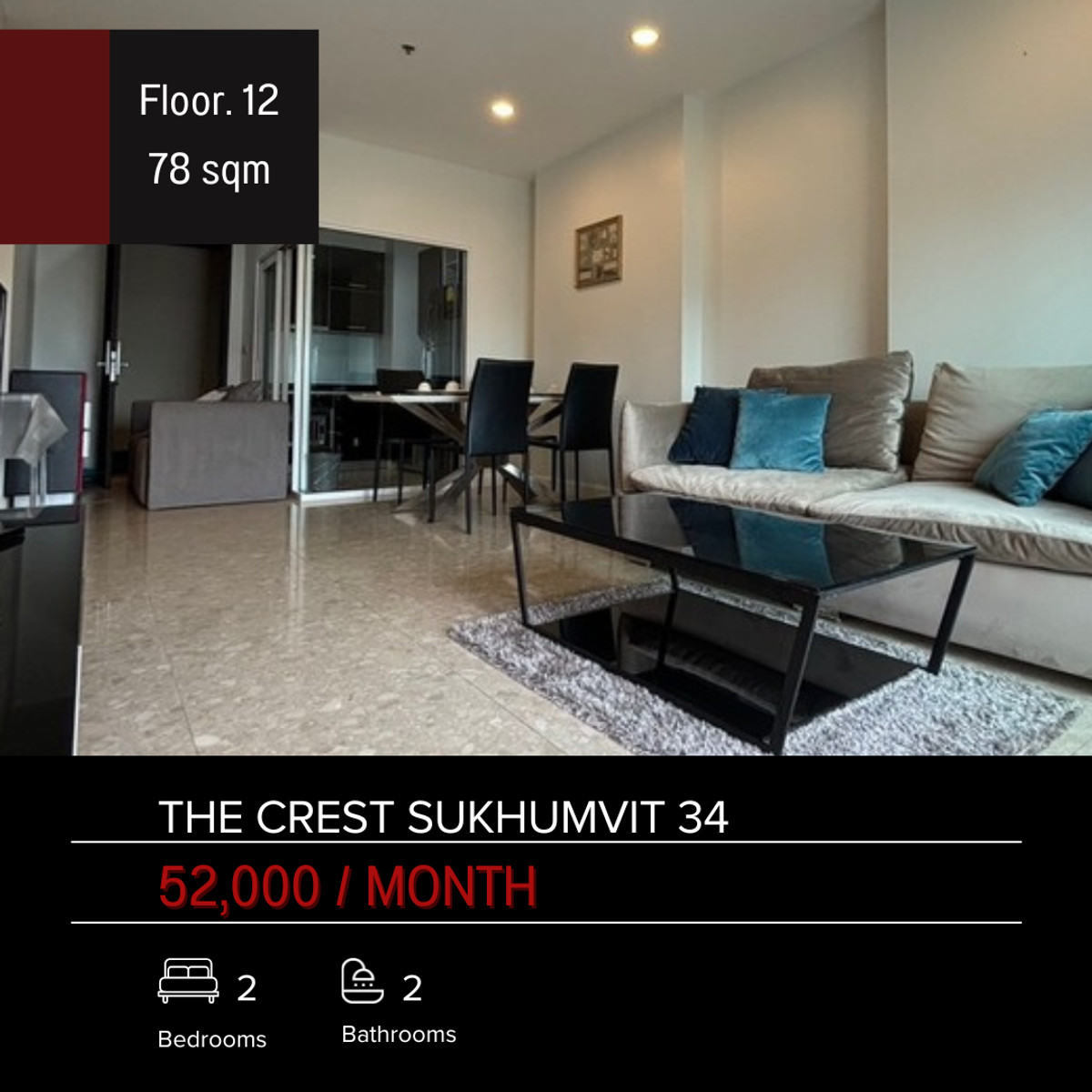 For Rent Ready to move Condo : The crest Sukhumvit 34 Size : 78 SQM Floor. 12 Type: 2 bedroom 2 bathroom Rent Price : 52,000 Baht Tel. คลิกเพื่อดูเบอร์โทรติดต่อ ( Anda ) WhatsApp คลิกเพื่อดูเบอร์โทรติ