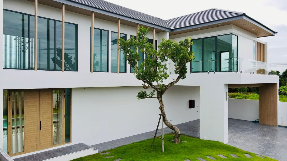 ราคา 13,900,000 บาท • ที่ดิน 142.5 ตร.ว. / พื้นที่ใช้สอย 408 ตร.ม. • 4 ห้องนอน 5 ห้องน้ำ ที่จอดรถ 6 คัน + EV Charger • ครัวไทย, ครัวตะวันตก, ห้องนั่งเล่น • มี Private Pool + สนามหญ้า • ผนังก่ออิฐมอญดั