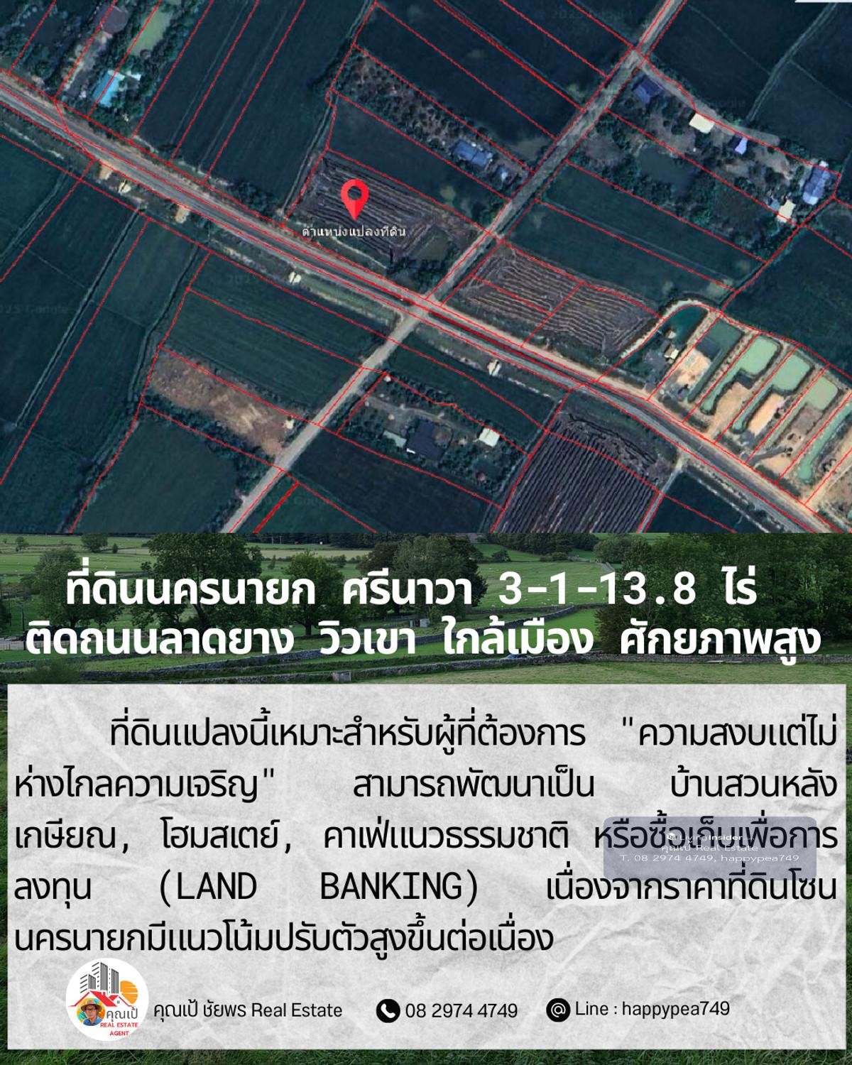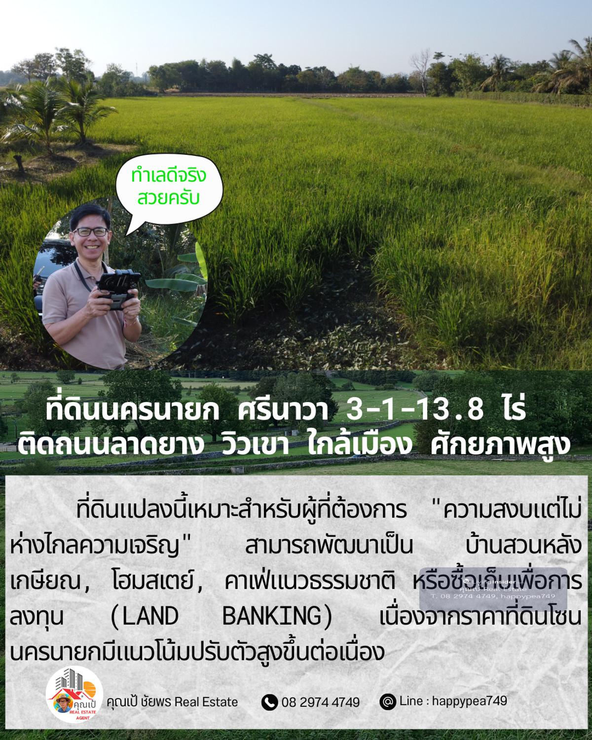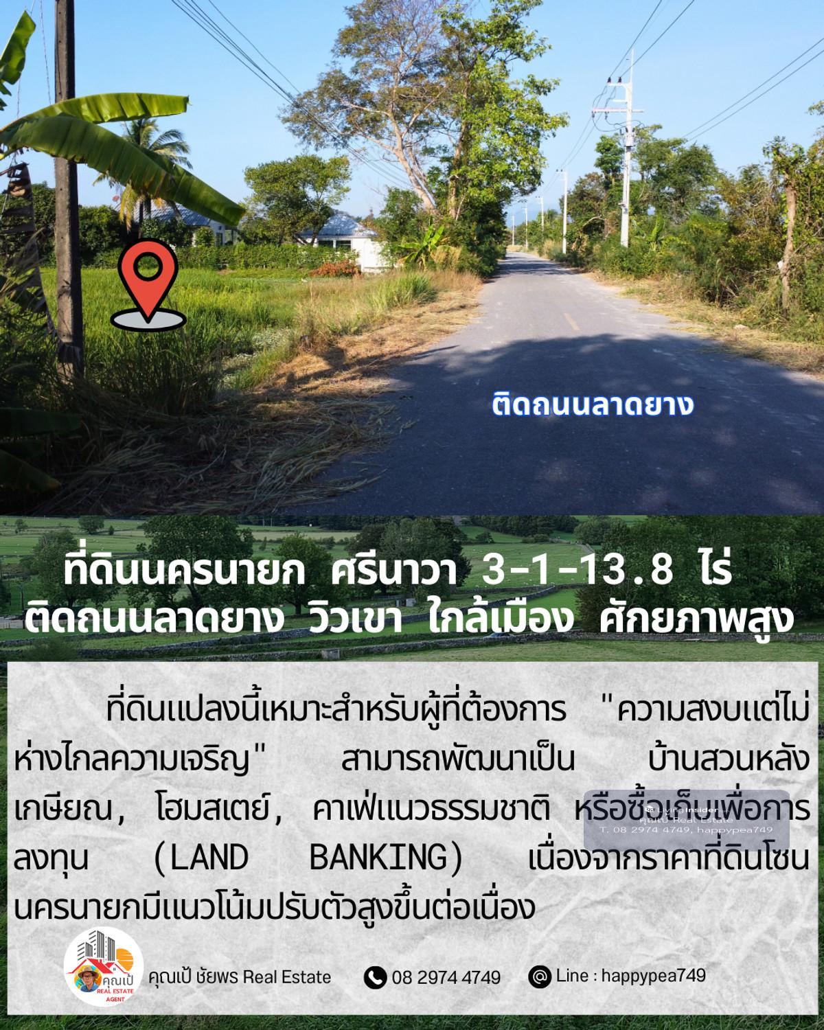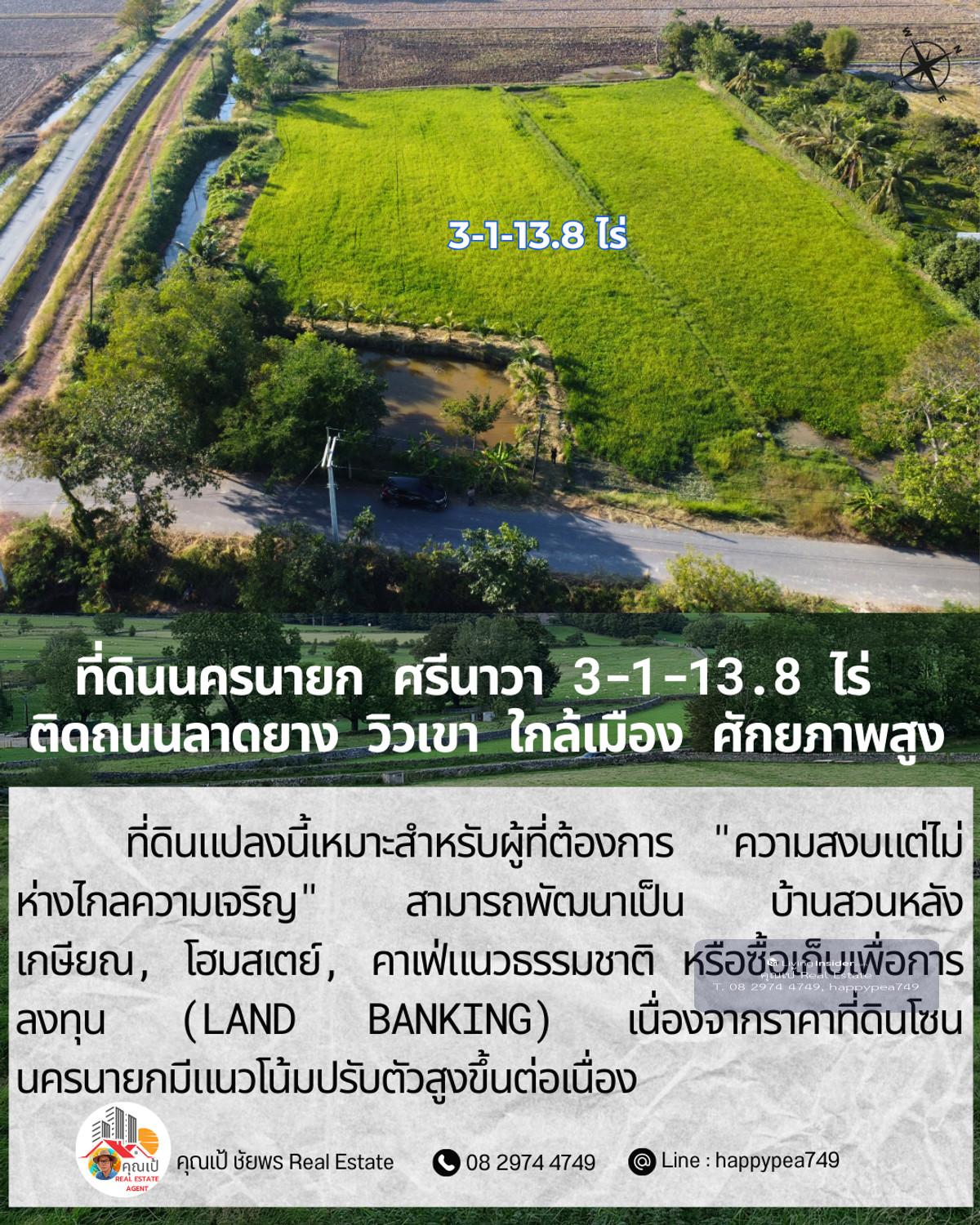 ขายที่ดินเปล่าศักยภาพสูง ทำเล ต.ศรีนาวา อ.เมือง จ.นครนายก เนื้อที่ 3 ไร่ 1 งาน 13.8 ตรางวา (รวม 1,313.8 ตร.ว.) แปลงสวยรูปทรงสี่เหลี่ยมผืนผ้า หน้ากว้างติดถนนลาดยางประมาณ 56 เมตร ลึก 93 เมตร บรรยากาศดีมาก มองเห็นวิวภูเขา เหมาะสำหรับสร้างที่อยู่อาศัย รีสอร์ท หรือทำการเกษตรสมัยใหม่ จุดเด่นและสาธารณูปโภค: การเดินทาง: ติดถนนลาดยาง รถสวนได้สะดวก เชื่อมต่อถนนหลักได้ง่าย สาธารณูปโภค: ไฟฟ้า และน้ำประปา เข้าถึงหน้าแปลง สภาพแวดล้อม: เป็นพื้นที่สีเขียว (Green Zone) สงบ ร่มรื่น อากาศดีตลอดปี พิกัดแปลง: https://maps.app.goo.gl/dpLUbZhZGNbPBQAZ7 สถานที่ใกล้เคียง: ถนนสุวรรณศร (7.8 กม.) โรงพยาบาลนครนายก (9.8 กม.) ตัวเมืองนครนายก และสถานที่ท่องเที่ยวสำคัญ วิเคราะห์ศักยภาพ: ที่ดินแปลงนี้เหมาะสำหรับผู้ที่ต้องการ "ความสงบแต่ไม่ห่างไกลความเจริญ" สามารถพัฒนาเป็น บ้านสวนหลังเกษียณ, โฮมสเตย์, คาเฟ่แนวธรรมชาติ หรือซื้อเก็บเพื่อการลงทุน (Land Banking) เนื่องจากราคาที่ดินโซนนครนายกมีแนวโน้มปรับตัวสูงขึ้นต่อเนื่อง ราคาเสนอขาย: ราคาปกติ 1,200,000 บาท/ไร่ (รวม 3,941,400 บาท) โปรโมชั่นพิเศษ: หากโอนกรรมสิทธิ์ภายใน ธันวาคม 2568 ลดราคาเหมาเหลือเพียง 3,500,000 บาท (ประหยัดไปกว่า 4 แสนบาท) สนใจติดต่อ: คุณเป้ ชัยพร โทร: คลิกเพื่อดูเบอร์โทรติดต่อ Line ID: happypea749 #ขายที่ดินนครนายก #ที่ดินศรีนาวา #ที่ดินวิวเขา #ที่ดินราคาถูก #ที่ดินทำบ้านสวน #อสังหาริมทรัพย์นครนายก #LandForSaleThailand #NakhonNayok #ที่ดินวัยเกษียณ #ลงทุนที่ดิน