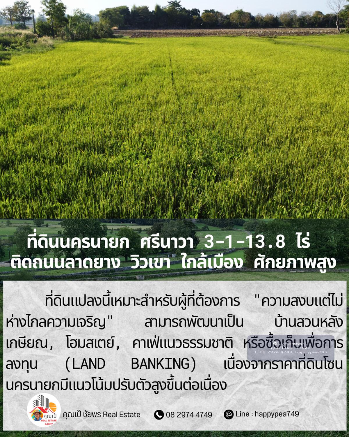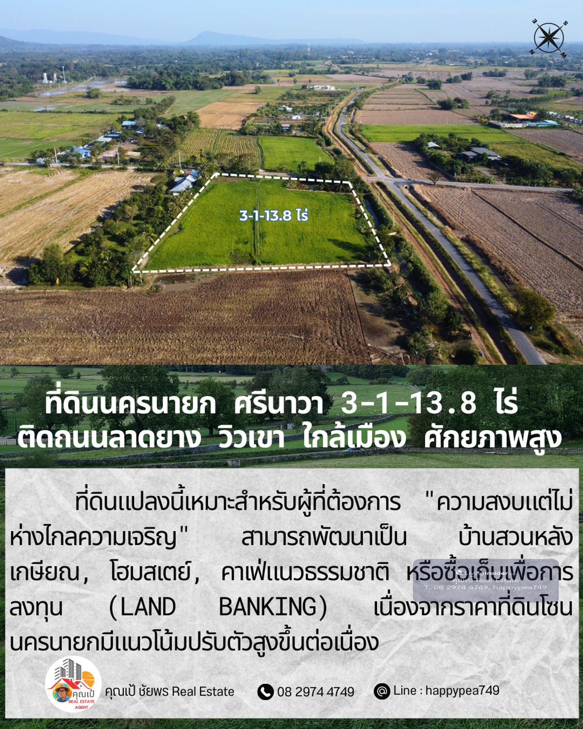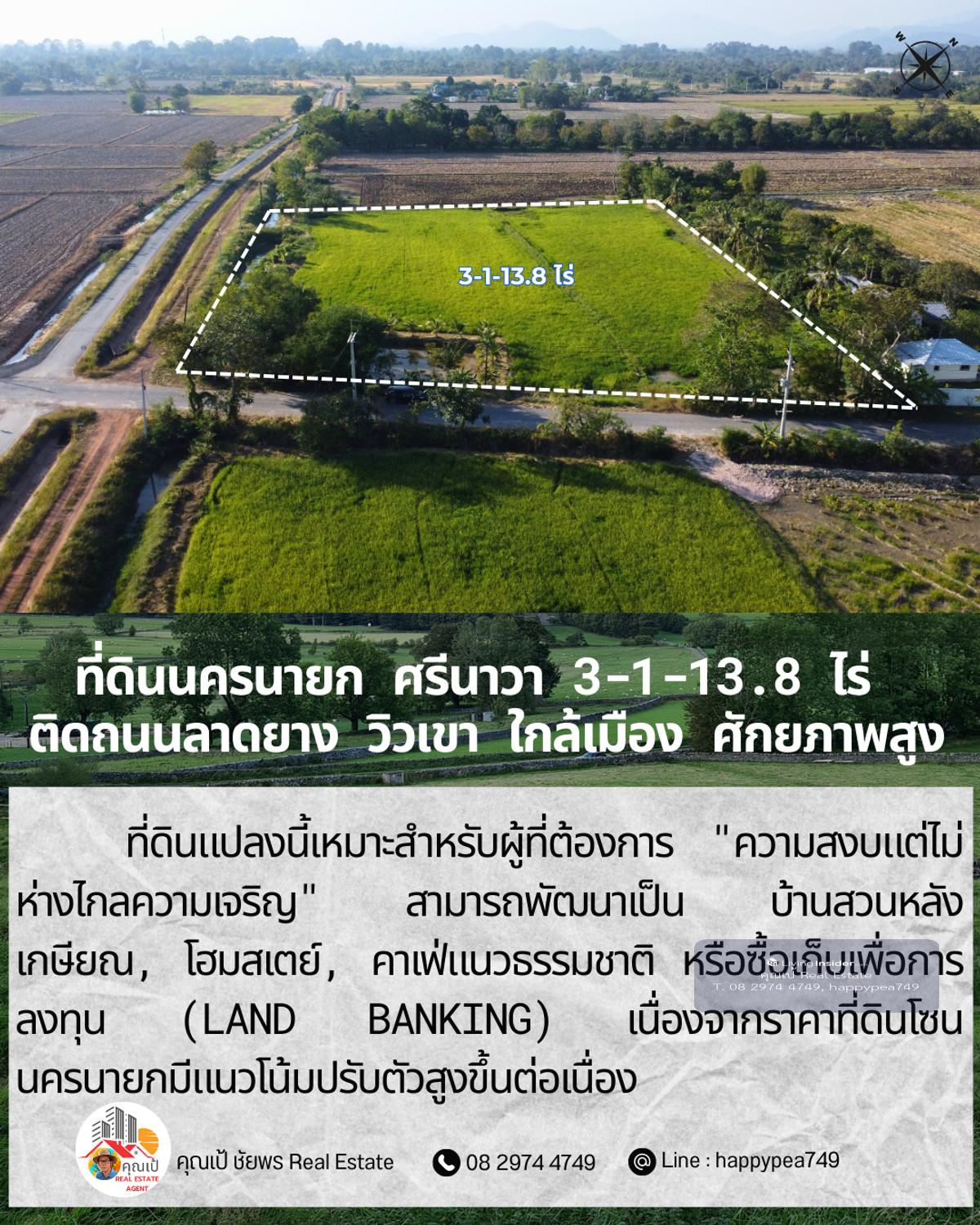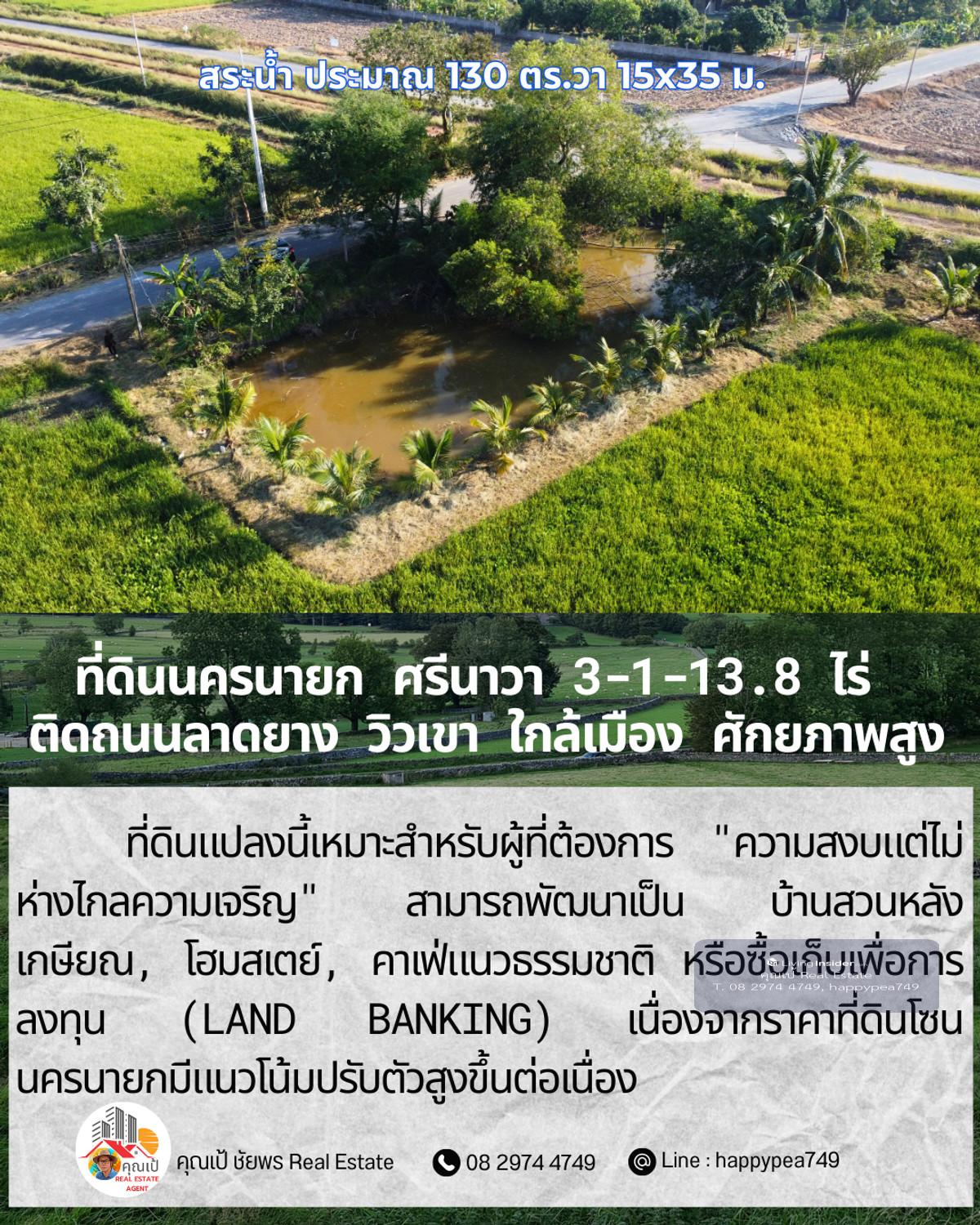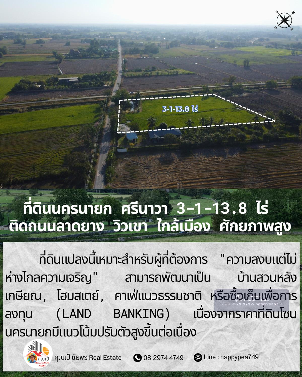ขายที่ดินเปล่าศักยภาพสูง ทำเล ต.ศรีนาวา อ.เมือง จ.นครนายก เนื้อที่ 3 ไร่ 1 งาน 13.8 ตรางวา (รวม 1,313.8 ตร.ว.) แปลงสวยรูปทรงสี่เหลี่ยมผืนผ้า หน้ากว้างติดถนนลาดยางประมาณ 56 เมตร ลึก 93 เมตร บรรยากาศดีมาก มองเห็นวิวภูเขา เหมาะสำหรับสร้างที่อยู่อาศัย รีสอร์ท หรือทำการเกษตรสมัยใหม่ จุดเด่นและสาธารณูปโภค: การเดินทาง: ติดถนนลาดยาง รถสวนได้สะดวก เชื่อมต่อถนนหลักได้ง่าย สาธารณูปโภค: ไฟฟ้า และน้ำประปา เข้าถึงหน้าแปลง สภาพแวดล้อม: เป็นพื้นที่สีเขียว (Green Zone) สงบ ร่มรื่น อากาศดีตลอดปี พิกัดแปลง: https://maps.app.goo.gl/dpLUbZhZGNbPBQAZ7 สถานที่ใกล้เคียง: ถนนสุวรรณศร (7.8 กม.) โรงพยาบาลนครนายก (9.8 กม.) ตัวเมืองนครนายก และสถานที่ท่องเที่ยวสำคัญ วิเคราะห์ศักยภาพ: ที่ดินแปลงนี้เหมาะสำหรับผู้ที่ต้องการ "ความสงบแต่ไม่ห่างไกลความเจริญ" สามารถพัฒนาเป็น บ้านสวนหลังเกษียณ, โฮมสเตย์, คาเฟ่แนวธรรมชาติ หรือซื้อเก็บเพื่อการลงทุน (Land Banking) เนื่องจากราคาที่ดินโซนนครนายกมีแนวโน้มปรับตัวสูงขึ้นต่อเนื่อง ราคาเสนอขาย: ราคาปกติ 1,200,000 บาท/ไร่ (รวม 3,941,400 บาท) โปรโมชั่นพิเศษ: หากโอนกรรมสิทธิ์ภายใน ธันวาคม 2568 ลดราคาเหมาเหลือเพียง 3,500,000 บาท (ประหยัดไปกว่า 4 แสนบาท) สนใจติดต่อ: คุณเป้ ชัยพร โทร: คลิกเพื่อดูเบอร์โทรติดต่อ Line ID: happypea749 #ขายที่ดินนครนายก #ที่ดินศรีนาวา #ที่ดินวิวเขา #ที่ดินราคาถูก #ที่ดินทำบ้านสวน #อสังหาริมทรัพย์นครนายก #LandForSaleThailand #NakhonNayok #ที่ดินวัยเกษียณ #ลงทุนที่ดิน