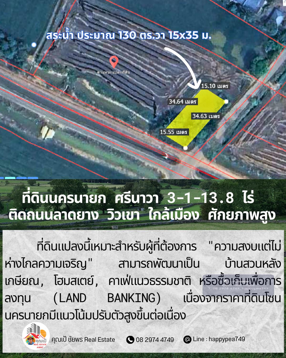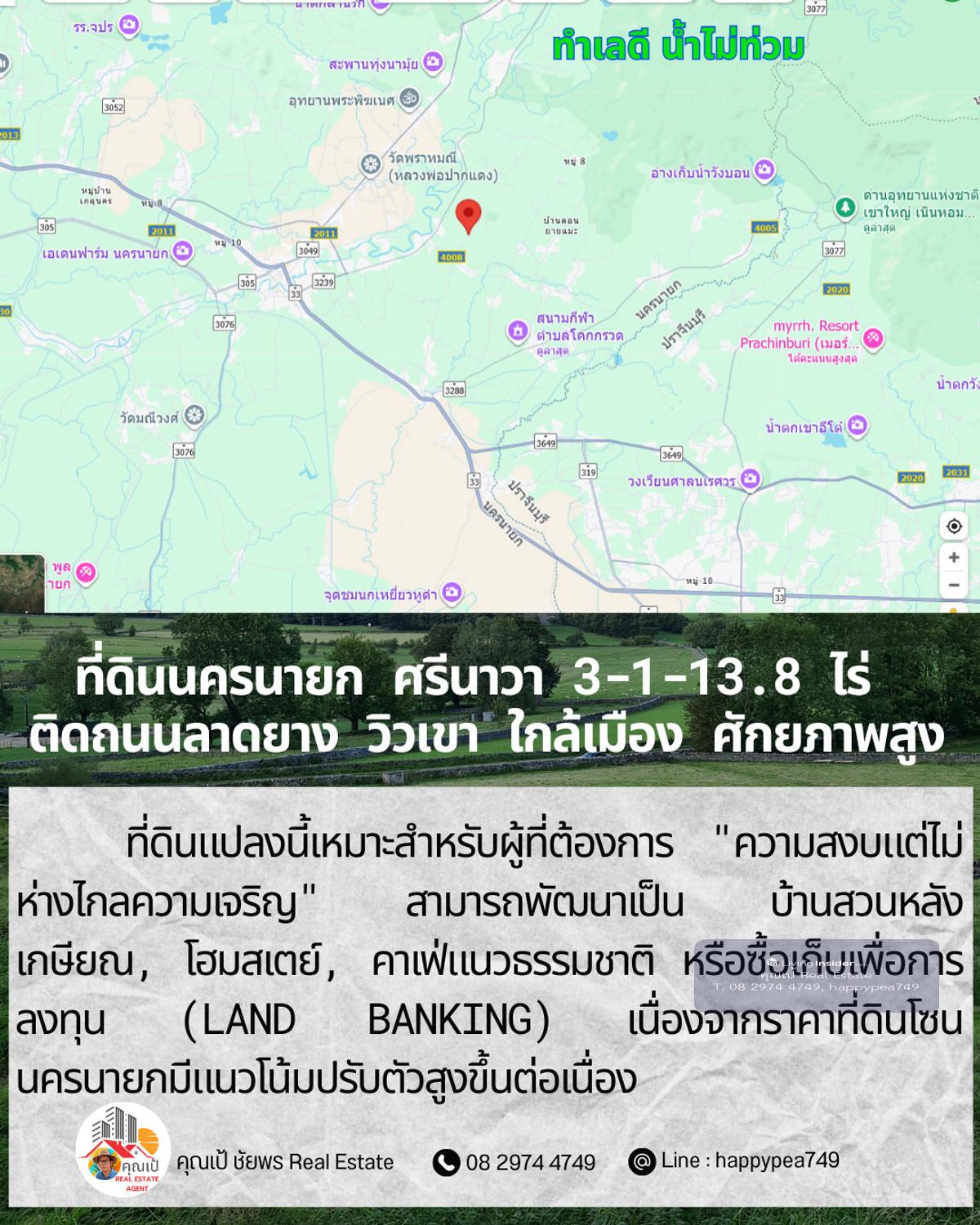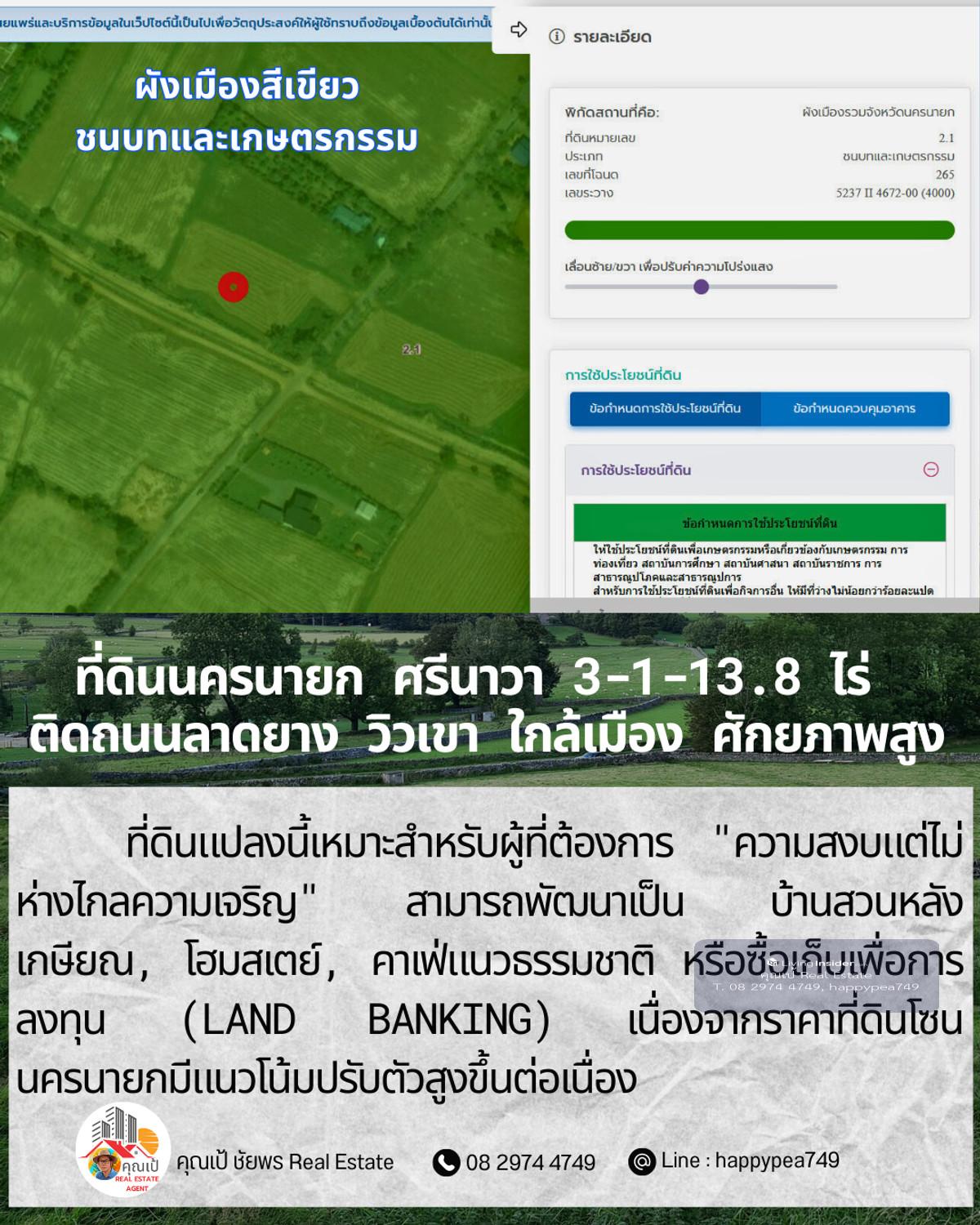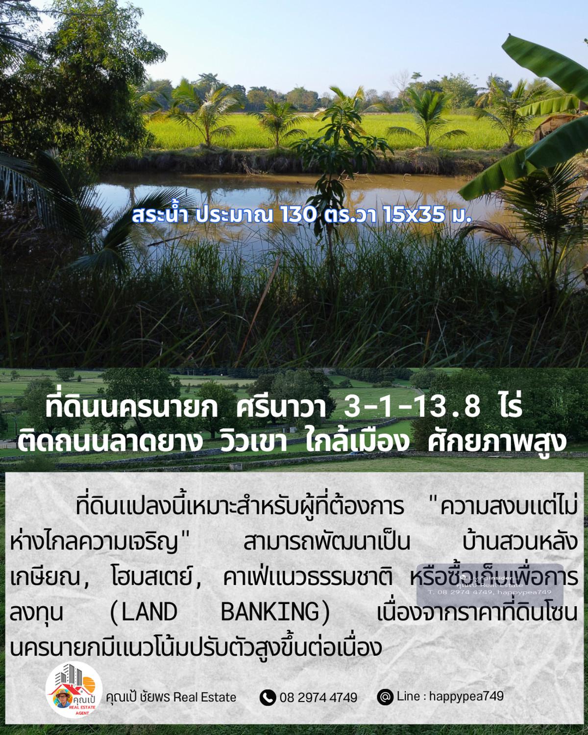 ขายที่ดินเปล่าศักยภาพสูง ทำเล ต.ศรีนาวา อ.เมือง จ.นครนายก เนื้อที่ 3 ไร่ 1 งาน 13.8 ตรางวา (รวม 1,313.8 ตร.ว.) แปลงสวยรูปทรงสี่เหลี่ยมผืนผ้า หน้ากว้างติดถนนลาดยางประมาณ 56 เมตร ลึก 93 เมตร บรรยากาศดีมาก มองเห็นวิวภูเขา เหมาะสำหรับสร้างที่อยู่อาศัย รีสอร์ท หรือทำการเกษตรสมัยใหม่ จุดเด่นและสาธารณูปโภค: การเดินทาง: ติดถนนลาดยาง รถสวนได้สะดวก เชื่อมต่อถนนหลักได้ง่าย สาธารณูปโภค: ไฟฟ้า และน้ำประปา เข้าถึงหน้าแปลง สภาพแวดล้อม: เป็นพื้นที่สีเขียว (Green Zone) สงบ ร่มรื่น อากาศดีตลอดปี พิกัดแปลง: https://maps.app.goo.gl/dpLUbZhZGNbPBQAZ7 สถานที่ใกล้เคียง: ถนนสุวรรณศร (7.8 กม.) โรงพยาบาลนครนายก (9.8 กม.) ตัวเมืองนครนายก และสถานที่ท่องเที่ยวสำคัญ วิเคราะห์ศักยภาพ: ที่ดินแปลงนี้เหมาะสำหรับผู้ที่ต้องการ "ความสงบแต่ไม่ห่างไกลความเจริญ" สามารถพัฒนาเป็น บ้านสวนหลังเกษียณ, โฮมสเตย์, คาเฟ่แนวธรรมชาติ หรือซื้อเก็บเพื่อการลงทุน (Land Banking) เนื่องจากราคาที่ดินโซนนครนายกมีแนวโน้มปรับตัวสูงขึ้นต่อเนื่อง ราคาเสนอขาย: ราคาปกติ 1,200,000 บาท/ไร่ (รวม 3,941,400 บาท) โปรโมชั่นพิเศษ: หากโอนกรรมสิทธิ์ภายใน ธันวาคม 2568 ลดราคาเหมาเหลือเพียง 3,500,000 บาท (ประหยัดไปกว่า 4 แสนบาท) สนใจติดต่อ: คุณเป้ ชัยพร โทร: คลิกเพื่อดูเบอร์โทรติดต่อ Line ID: happypea749 #ขายที่ดินนครนายก #ที่ดินศรีนาวา #ที่ดินวิวเขา #ที่ดินราคาถูก #ที่ดินทำบ้านสวน #อสังหาริมทรัพย์นครนายก #LandForSaleThailand #NakhonNayok #ที่ดินวัยเกษียณ #ลงทุนที่ดิน