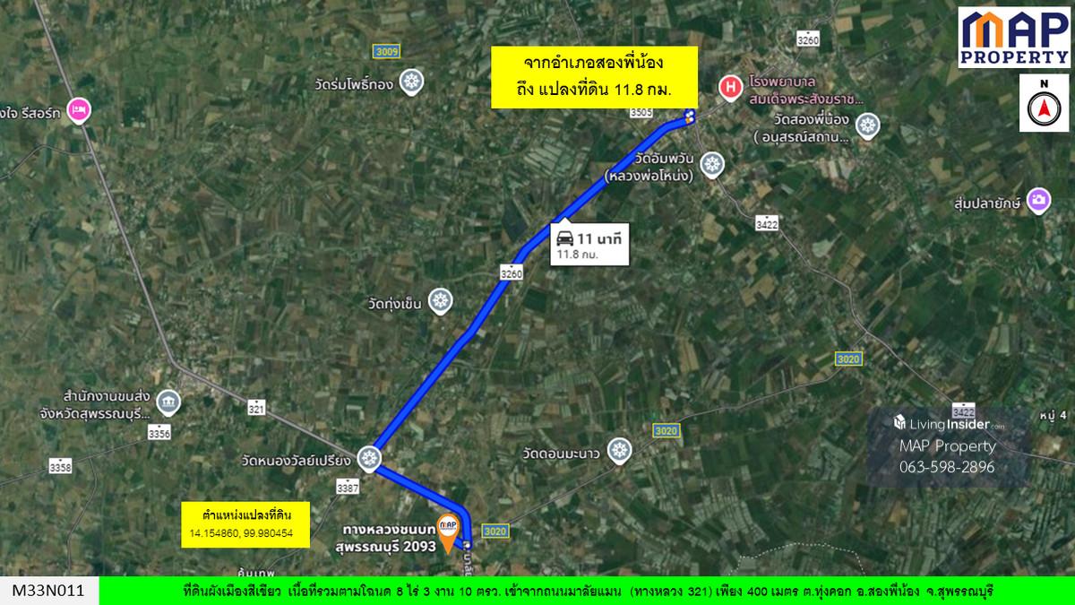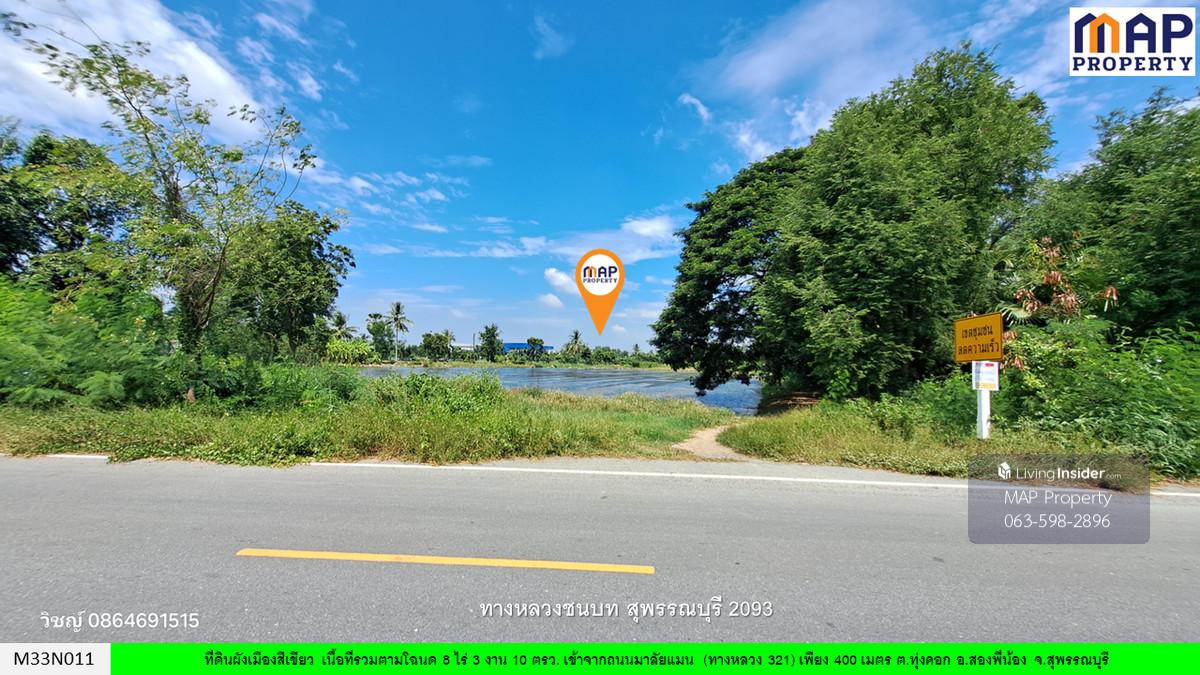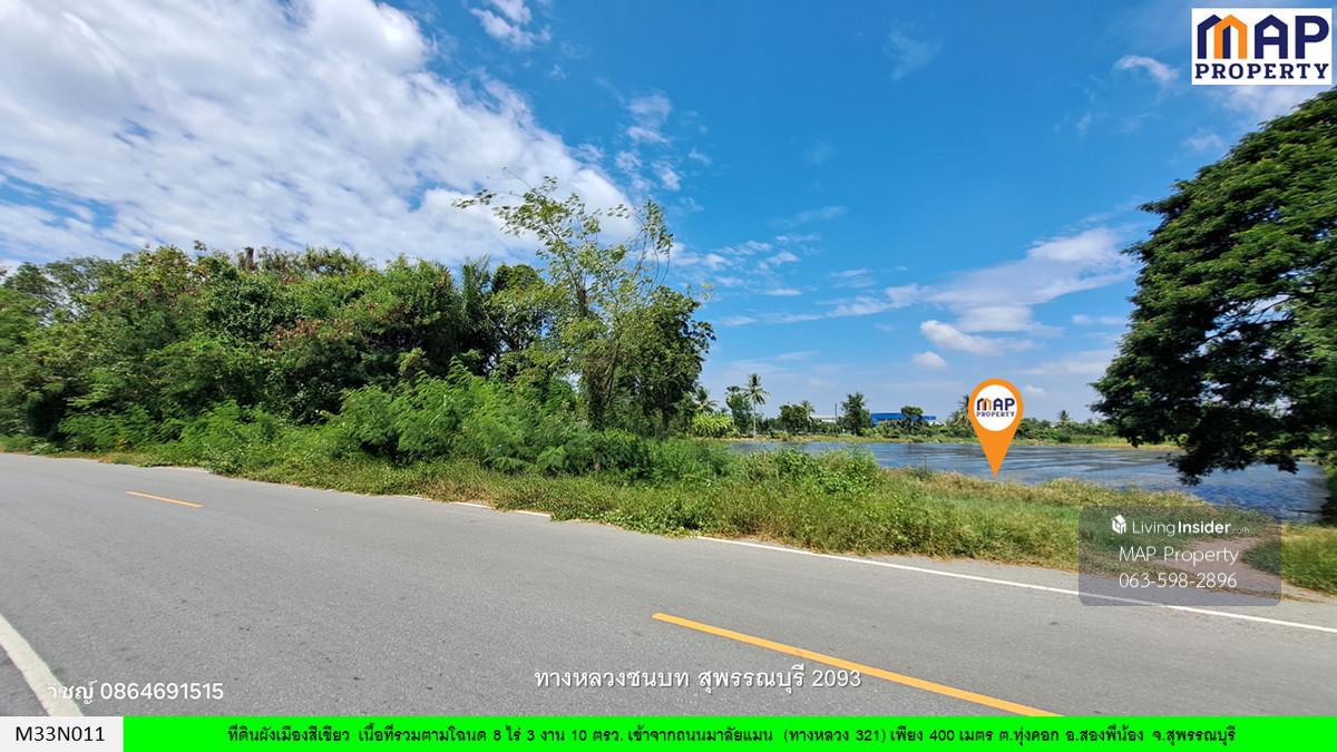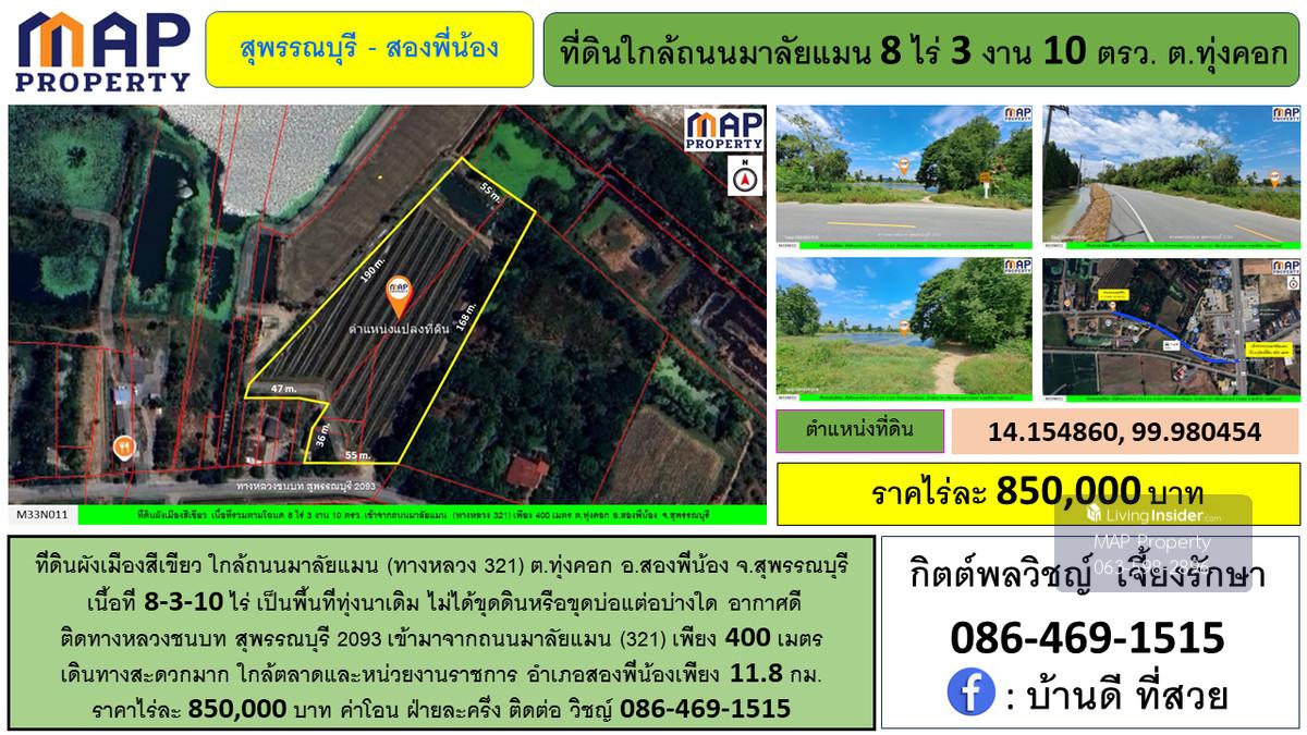 ที่ดินผังเมืองสีเขียว ใกล้ถนนมาลัยแมน (ทางหลวง 321) ต.ทุ่งคอก อ.สองพี่น้อง จ.สุพรรณบุรี -เนื้อที่ 8-3-10 ไร่ เป็นพื้นที่ทุ่งนาเดิม ไม่ได้ขุดดินหรือขุดบ่อแต่อย่างใด อากาศดี เดินทางสะดวกมาก: -ติดทางหลวง