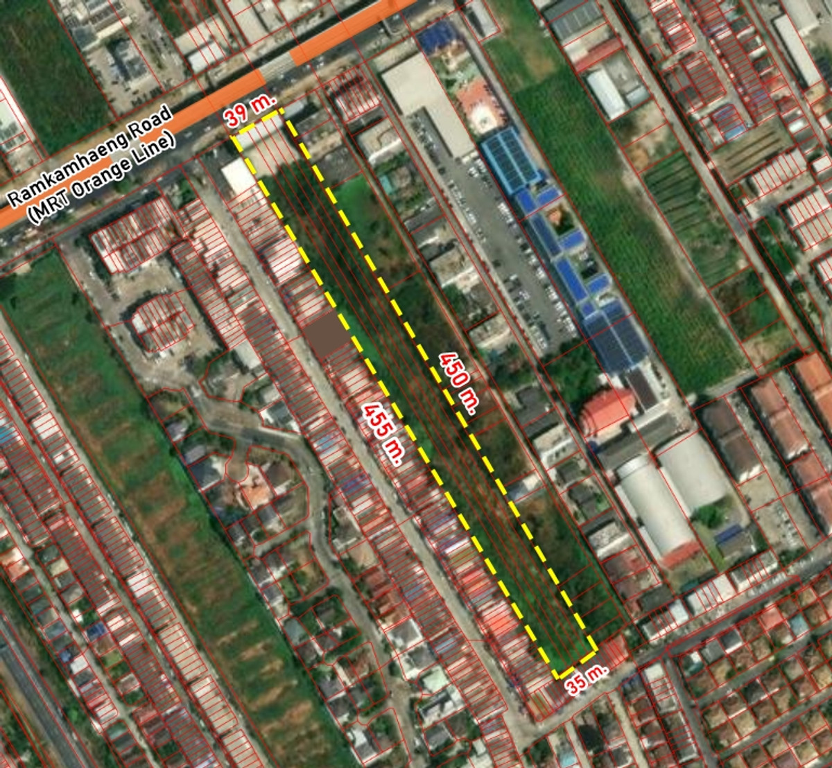 ที่ดินเปล่า 10-1-66.4 ไร่ ติดถนนรามคำแหง ฝั่งขาเข้า เส้นรถไฟฟ้าสายสีส้ม เดินได้จาก MRT น้อมเกล้า และโรงเรียนเตรียมอุดมศึกษาน้อมเกล้า เพียง 180 เมตร ที่ดินเคยจะพัฒนาเป็นโครงการคอนโดมิเนียม 8 ชั้น ขนาด