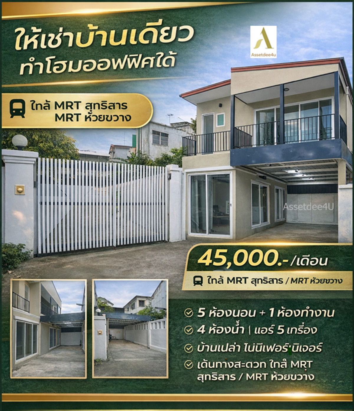 บ้านใกล้รถไฟฟ้า ให้เช่าบ้านเช่าสุทธิสาร AH632 ให้เช่าบ้านเดี่ยว บ้าน 5 ห้องนอน ห้วยขวาง ใกล้ MRT สุทธิสาร เหมาะอยู่อาศัยหรือทำโฮมออฟฟิศ