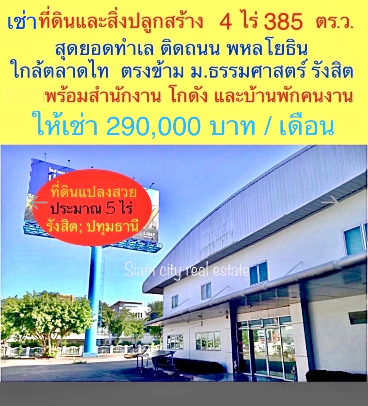 ให้เช่า ที่ดินแปลงสวย พร้อมสิ่งปลูกสร้าง เป็นสำนักงาน และโกดังสินค้า พร้อมบ้านพักพนักงาน 🏠 บนทำเลศักยภาพ ติดถนน พหลโยธิน ใกล้ ตลาดไท ตรงข้าม ม.ธรรมศาสตร์ รังสิต ต.คลองหนึ่ง อ.คลองหลวง จ.ปทุมธานี 🚩 พร้