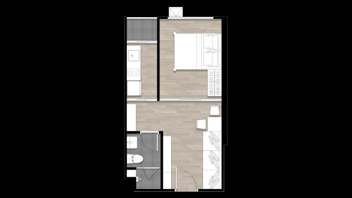 ห้องแบบ 1 Bedroom แยกสัดส่วนจริง โซนห้องนั่งเล่นกว้าง ใช้พื้นที่ได้เต็ม ห้องนอนเป็นสัดส่วน พร้อมประตูปิด เพิ่มความเป็นส่วนตัว ครัวแบบปิด (หรือครัวกั้นโซน) ลดกลิ่นรบกวนในห้อง ห้องน้ำขนาดกำลังดี แบ่งส่ว