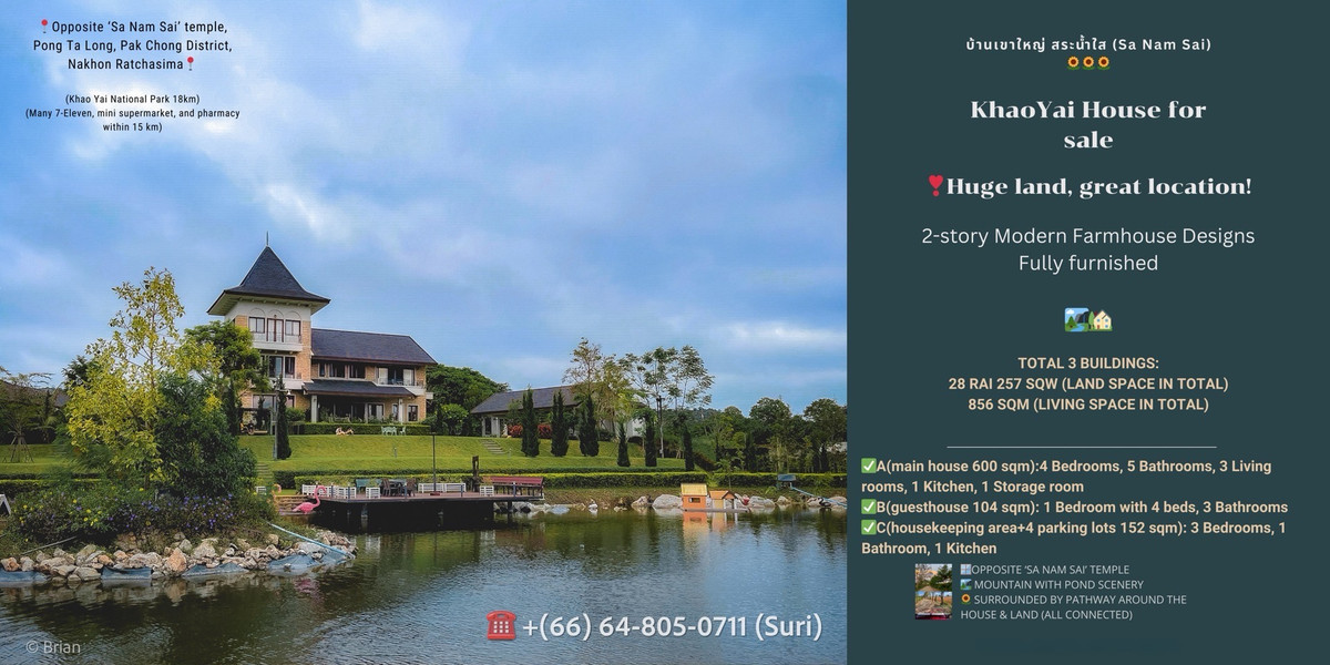 บ้านพักตากอากาศเขาใหญ่ ร่มรื่น น่าอยู่ (ครุฑแดง) 2 ชั้น สไตล์ MODERN FARMHOUSE เจ้าของขายเอง ✅ ตกแต่งภายใน + เฟอร์นิเจอร์ครบ พร้อมเข้าอยู่ ✅ พื้นที่ดิน: 28 ไร่ 257 ตารางวา ✅ พื้นที่ใช้สอยทั้งหมด: 856 ตารางเมตร * แยกเป็น 3 อาคาร: A (600 ตร.ม.ตัวบ้านหลัก), B (104 ตร.ม.เรือนรับรองแขก), C (152 ตร.ม.โซนแม่บ้าน + โรงจอดรถ) * ✅ ฟังก์ชั่น อาคาร A 600 ตร.ม.(ตัวบ้านหลัก) • 4 ห้องนอน • 5 ห้องน้ำ • 3 ห้องนั่งเล่น • 1 ห้องครัว • 1 ห้องเก็บของ ✅ ฟังก์ชั่น อาคาร B 104 ตร.ม.(เรือนรับรองแขก) • 1 ห้องนอนรวม พร้อม 4 เตียงนอน • 3 ห้องน้ำ ✅ ฟังก์ชั่น อาคาร C 152 ตร.ม.(โซนแม่บ้าน + โรงจอดรถ) • 3 ห้องนอน • 1 ห้องน้ำ • 1 ห้องครัว • โรงจอดรถรองรับได้ 4 คัน แต่รอบตัวบ้านสามารถจอดได้หลายคัน ✅ ทำเล + การออกแบบ ส่งเสริมตามหลักฮวงจุ้ย ➢ บริเวณด้านหน้า มีวัดสระน้ำใส ➢ บริเวณด้านหลัง มีสระเอนกประสงค์ขนาดใหญ่ + ลานกิจกรรมข้างสระ พร้อมเฟอร์นิเจอร์ ล้อมไปด้วยภูเขาด้านหลัง และต้นไม้รอบบ้าน พร้อมทางพื้น ที่เชื่อมต่อกันรอบบริเวณตัวบ้านและที่ดิน ✅ ทำเลที่ตั้ง *(NOTE) มีหลากหลายร้านสะดวกซื้อ 7-Eleven, มินิซูเปอร์มาเก็ต (TESCO Lotus express, Big C mini, Tops daily), และร้านขายยา ตั้งอยู่ในบริเวณใกล้เคียงตัวบ้าน ภายในระยะทางไม่เกิน 15 กม. • Khao Yai National Park 17.8 km • Biciclette Cafe Khao Yai 1.4 km • Toscana Valley Khao Yai 6.8 km • Khao Yai Art Museum 9.1 km • Within-Khaoyai | Mixology Cafe x Stay 9.8 km • Ban Tha Chang Spring 10.1 km • Bonanza Exotic Zoo 12.1 km • The Pandora Camp Khao Yai 12.5 km • Scenical World Khao Yai 15.4 km • Bangkok Khao Yai Clinic 15.8 km • Primo Piazza Khao Yai 20 km • Midwinter Khao Yai 20.8 km • Lago di Khao Yai 24.2 km • Makro Food Service Pak Chong-Khaoyai 27 km • Lotus’s Pak Chong-Khaoyai 27.5 km • Big C Supercenter Pak Chong-Khaoyai 27.5 km • Pak Chong Nana Hospital 28.4 km • GranMonte Vineyard and Winery 29.2 km • Farm Chokchai 31.5 km • Bangkok Hospital Pak Chong 33.6 km • PB Valley Khao Yai Winery 36.1 km แบบบ้านสไตล์ Modern Farmhouse นี้ได้รับแรงบันดาลใจมาจากพื้นที่ไร่ขนาดใหญ่รอบตัวบ้าน ไม่ว่าจะกิจกรรมไหน ก็จะมอบความรู้สึกอบอุ่น สนุกสนาน และส่งเสริมฮวงจุ้ยแก่ผู้อยู่อาศัย ✅ ราคา: 389 ล้านบาท ✅ เจ้าของขายเอง (ครุฑแดง) เบอร์ติดต่อ: คลิกเพื่อดูเบอร์โทรติดต่อ (Suri)