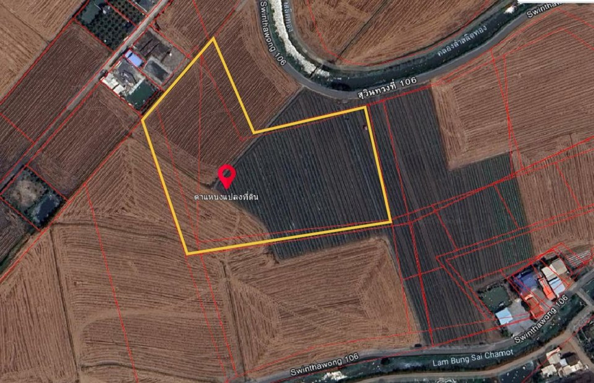 ขาย ที่ดิน ซอยสุวินทวงศ์ 106 หน้ากว้างติดถนนซอยประมาณ 200 เมตร เนื้อที่ 16 ไร่ 67 ตารางวา (6,467 ตร.ว.) ปัจจุบันให้เช่าทำนา ราคาต่อรองได้! สถานที่สำคัญเคียง - สวนกีฬากมล FBT - สำนักงานขนส่งกรุงเทพมหาน