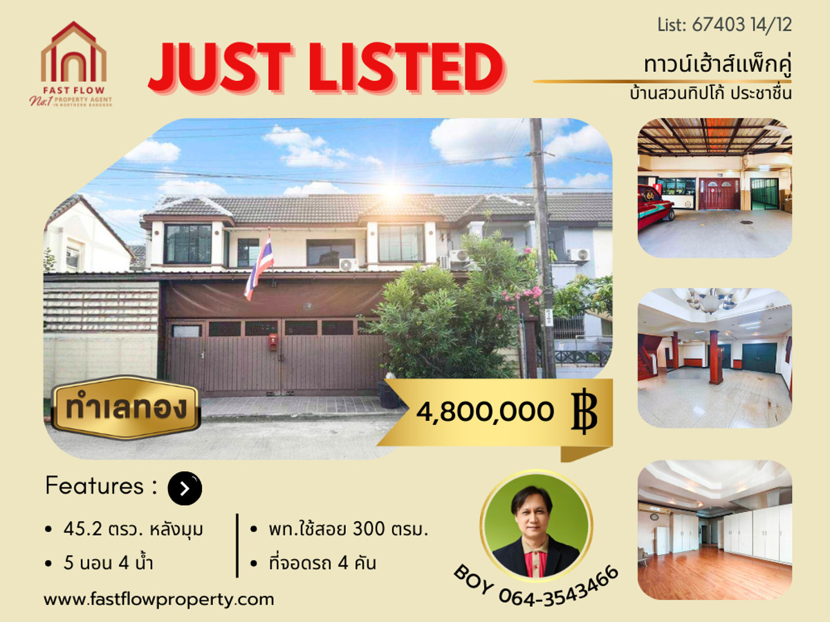 ขายทาวน์เฮ้าส์ 2 ชั้น 2 หลังติดกัน แปลงมุม หมู่บ้านสวนทิปโก้ ประชาชื่น ซอยประชานุกูล 1 ใกล้แยกประชานุกูล ใกล้รถไฟฟ้า สถานีวงศ์สว่าง ทางด่วนประชานุกูล รัชดาภิเษก62 64 66 ประชาชื่น 30 ซอยกรุงเทพ-นนทบุรี 56 ใกล้ รพ.เกษมราษฎร์ประชาชื่น BOY สนใจติดต่อ: (บอย) ธนบดี Fast Flow Property คลิกเพื่อดูเบอร์โทรติดต่อ Line ID: boykrub15 Listing no: 67403 Property Detail - ทาวน์เฮ้าส์ 2 ชั้น 2 ยูนิตติดกัน ชื่อโครงการบ้านสวนทิปโก้ ซอยประชานุกูล1 - เป็นแปลงหัวมุม ติดกับที่กลับรถหมู่บ้าน - ที่ดินรวม 45.2 ตารางวา - พื้นที่ใช้สอยรวมต่อเติมครัวและโรงรถ ประมาณ 300 ตารางเมตร - หน้าบ้านหันทิศตะวันออกเฉียงเหนือ รับพลังงานแสงแดดยามเช้า - 4 ห้องนอน 3 ห้องน้ำ 1 ห้องนั่งเล่นใหญ่ 1 ห้องครัว 1 ห้องเก็บของ - 1 ห้องนอนชั้นล่างพร้อมห้องน้ำในตัว สำหรับผู้สูงอายุ - ต่อเติมครัวไทยด้านหลังบ้าน เคาน์เตอร์ครัวอย่างดี พร้อมเตาไฟฟ้าและเครื่องดูดควัน - ต่อเติมโรงรถด้านหน้าเต็มพื้นที่ พร้อมปูกระเบื้อง จอดรถในร่มได้ 4 คัน - ชั้นล่างปูกระเบื้อง/แกรนิต ชั้นบนปูพื้นไม้ปาร์เก้/ลามิเนต - ขายบ้านเปล่า ตกแต่งต่อเติมได้ง่าย - ขายพร้อมเครื่องปรับอากาศ 2 เครื่อง Project and Facilities - โครงการพัฒนาโดย บริษัท ทิปโก้แลนด์ จำกัด - มีสวนหย่อม - ค่าส่วนกลาง 25 บาท ต่อตารางวาต่อเดือน - CCTV และ รปภ. 24 ชั่วโมง - เข้า-ออก หมู่บ้านด้วยระบบบัตรสแกน สถานที่ใกล้เคียง - ทางด่วนพิเศษศรีรัช ประชานุกูล - รถไฟฟ้าสายสีม่วง สถานีวงศ์สว่าง - โรงเรียนประชานิเวศน์ โรงเรียนหอวัง - โรงพยาบาลเกษมราษฏร์ ประชาชื่น - ตลาดบองมาเช่, ตลาดนัดจตุจักร - Central ลาดพร้าว, Big C วงศ์สว่าง ตำแหน่งที่ตั้ง https://maps.app.goo.gl/Dcqy6Gihncy3rYS28 ราคา 4,800,000 บาท บริการช่วยเหลือจัดหาสินเชื่อธนาคารฟรี! สามารถนัดเข้าชมสถานที่จริงได้ทุกวัน สนใจราคาคุยกันได้ ติดต่อ: (บอย) ธนบดี Fast Flow Property คลิกเพื่อดูเบอร์โทรติดต่อ Line ID: boykrub15 ติดต่อ Fast Flow Property Office Tel: คลิกเพื่อดูเบอร์โทรติดต่อ Line ID: @fastflow FB Page: facebook.com/fastflowproperty www.fastflowproperty.com บริการรับฝากขายอสังหาริมทรัพย์ทุกประเภท ฟรีค่าโฆษณา