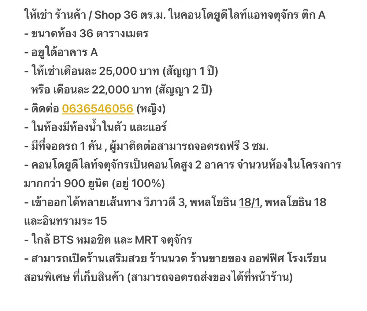 ให้เช่า ร้านค้า / Shop 36 ตร.ม. ในคอนโดยูดีไลท์แอทจตุจักร ตึก A - ขนาดห้อง 36 ตารางเมตร - อยูใต้อาคาร A - ให้เช่าเดือนละ 25,000 บาท (สัญญา 1 ปี) หรือ เดือนละ 22,000 บาท (สัญญา 2 ปี) - ติดต่อ คลิกเพื่อดูเบอร์โทรติดต่อ (หญิง) - ในห้องมีห้องน้ำในตัว และแอร์ - มีที่จอดรถ 1 คัน , ผู้มาติดต่อสามารถจอดรถฟรี 3 ชม. - คอนโดยูดีไลท์จตุจักรเป็นคอนโดสูง 2 อาคาร จำนวนห้องในโครงการมากกว่า 900 ยูนิต (อยู่ 100%) - เข้าออกได้หลายเส้นทาง วิภาวดี 3, พหลโยธิน 18/1, พหลโยธิน 18 และอินทรามระ 15 - ใกล้ BTS หมอชิต และ MRT จตุจักร - สามารถเปิดร้านเสริมสวย ร้านนวด ร้านขายของ ออฟฟิศ โรงเรียนสอนพิเศษ ที่เก็บสินค้า (สามารถจอดรถส่งของได้ที่หน้าร้าน)