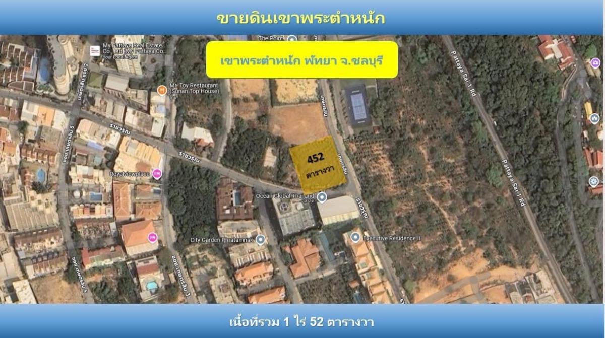 Land for sale 1-0-52 rai, Khao Phra Tamnak, Pattaya Premium zone | 2-way road | 15-storey building Special selling price only: 99 million baht (from normal price 169 million baht) This price includes the whole plot – worth it in terms of potential use and future added value Plot details Area: 1 rai 52 sq.w. (total 1,808 sq.m.) Width: approximately 45 meters | Depth: approximately 40 meters City plan: Red – can develop a building up to 15 floors Plot characteristics: corner plot, 2-way road (Ratchawarun Road 1 and side alley) Land highlights Land on a high hill – panoramic sea view 2-way road – increases flexibility in project design and development High potential: suitable for building luxury condominiums, hotels, or pool villas Only 500 meters from the beach Located in the area of High-end foreign tourists (Russia, China, Germany) Red zone - maximum land use Nearby landmarks Dongtan Beach - 3 minutes Pattaya Viewpoint - 4 minutes Bali Hai Cape - 6 minutes Walking Street Pattaya - 8 minutes Terminal 21 Pattaya - 15 minutes