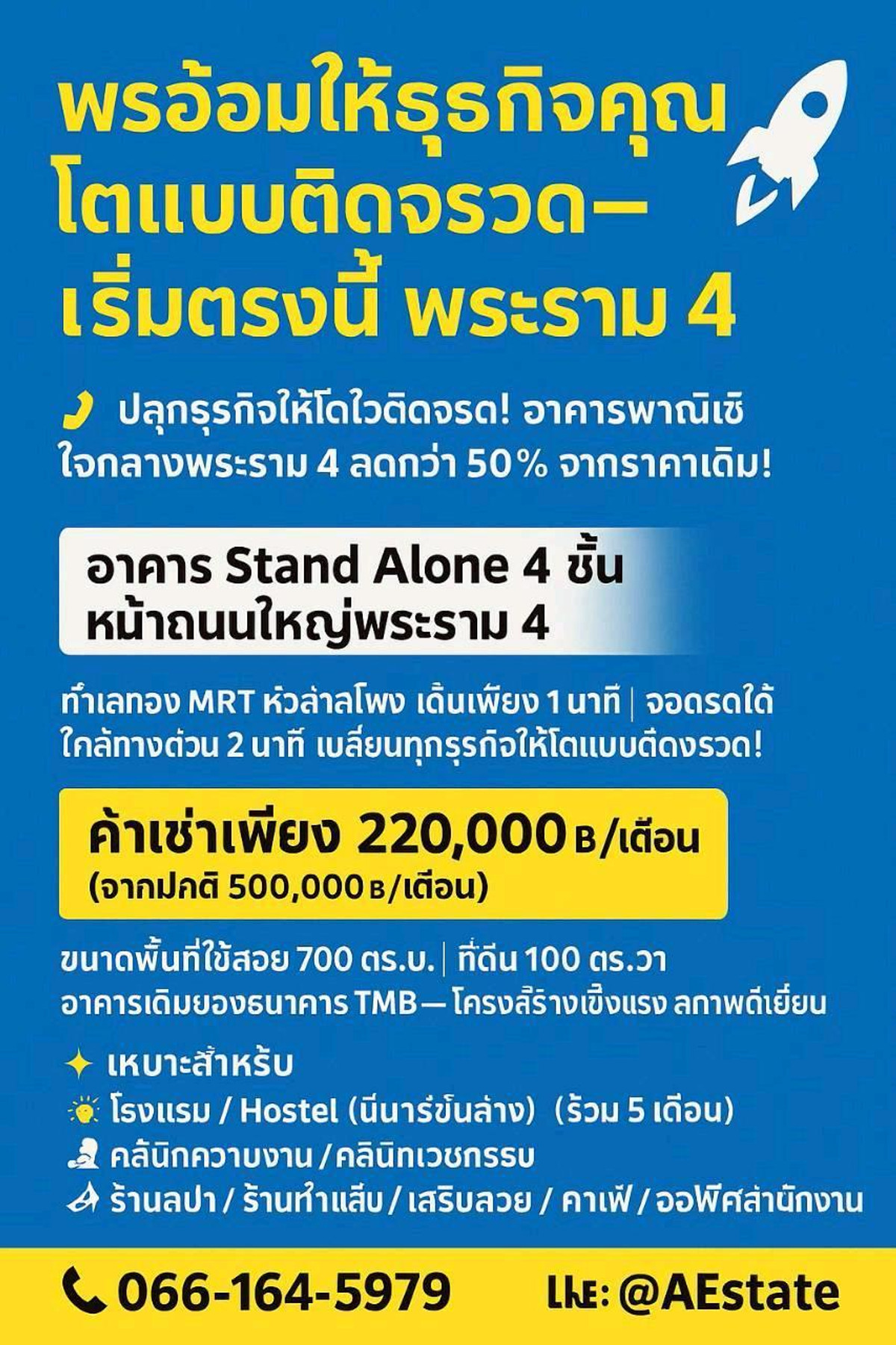 [URGENT DEAL] Rare Stand-alone Opportunity on Rama 4 – Now 60% Below Market Price! โอกาสครอบครองอาคาร Stand-alone บนทำเลศักยภาพสูงสุด "ถนนพระราม 4 - บรรทัดทอง" ในราคาที่หาไม่ได้อีกแล้วในโซนนี้! 🔥 Highlight: จากปกติ 500,000.- ลดเหลือเพียง 220,000 - / เดือน (เหมาะสำหรับผู้ที่ต้องการควบคุมต้นทุน Fix Cost เพื่อสร้างกำไรในระยะยาว) ทำไมตึกนี้ถึงเป็นจุดยุทธศาสตร์สำหรับธุรกิจคุณ? * 📍 Visibility & Access: ติดถนนพระราม 4 ใหญ่ เดินถึง MRT หัวลำโพงเพียง 1 นาที และใกล้ทางด่วน 2 นาที * 🏦 Bank-Grade Structure: เดิมเป็นอาคารธนาคาร TMB โครงสร้างแข็งแรงระดับสูงสุด พื้นที่ใช้สอย 700 ตร.ม. พร้อมพื้นที่จอดรถ * 📈 High Potential Zone: เชื่อมต่อย่านบรรทัดทอง, สยาม และจุฬาฯ แหล่งรวม Lifestyle และกลุ่มลูกค้ากำลังซื้อสูง Perfect for: Luxury Hostel | Medical/Aesthetic Clinic | Wellness Center | Corporate HQ | Flagship Café ✅ Terms: มัดจำ 3 + ล่วงหน้า 1 (รวม 4 เดือน) พร้อมเข้าดำเนินการทันที ⚠️ First Call, First Secure: มีผู้สนใจสอบถามหลายราย นัดชมสถานที่จริงก่อนใครได้ที่: 📞 คุณออร่า: คลิกเพื่อดูเบอร์โทรติดต่อ 💬 Line ID: @hyl4686y 60% RENTAL DROP! 🚀 โอกาสทองใจกลางพระราม 4 – บรรทัดทอง หากคุณกำลังมองหาอาคาร Stand-alone สำหรับทำ Clinic, Hostel หรือ Office นี่คือดีลที่ "ดีที่สุด" ของปี 2026 💰 เพียง 220,000THB/Month (จากราคาเดิม 500k) 📍 MRT หัวลำโพง 1 นาทีถึง! Details: * พื้นที่ใช้สอย 750 ตร.ม. | ที่ดิน 100 ตร.วา * อดีตอาคารธนาคาร โครงสร้างแน่น รีโนเวทง่าย * จอดรถสะดวก ติดถนนใหญ่ หน้าปากซอยบรรทัดทอง ด่วน! สัญญาพร้อมเริ่มทันที เงื่อนไขยืดหยุ่น อย่าปล่อยให้ทำเลที่สร้างกำไรให้คุณได้มหาศาลหลุดมือไป นัดดูตึกด่วนวันนี้: ☎️ Call: คลิกเพื่อดูเบอร์โทรติดต่อ 📥 Add Line: @hyl4686y #Rama4 #CommercialProperty #BangkokRealEstate #InvestmentOpportunity #ClinicForRent #HostelBusiness #StandAloneBuilding 💡#TownHomeForRent #BTSสยาม #อาคารพาณิย์ #TownHomeให้เช่า Tel : คลิกเพื่อดูเบอร์โทรติดต่อ LINE ID :@hyl4686y เช็ค Google Map https://maps.app.goo.gl/dSSypwSaucMYB4Ap9 ❌️⛔️เน้นโทร