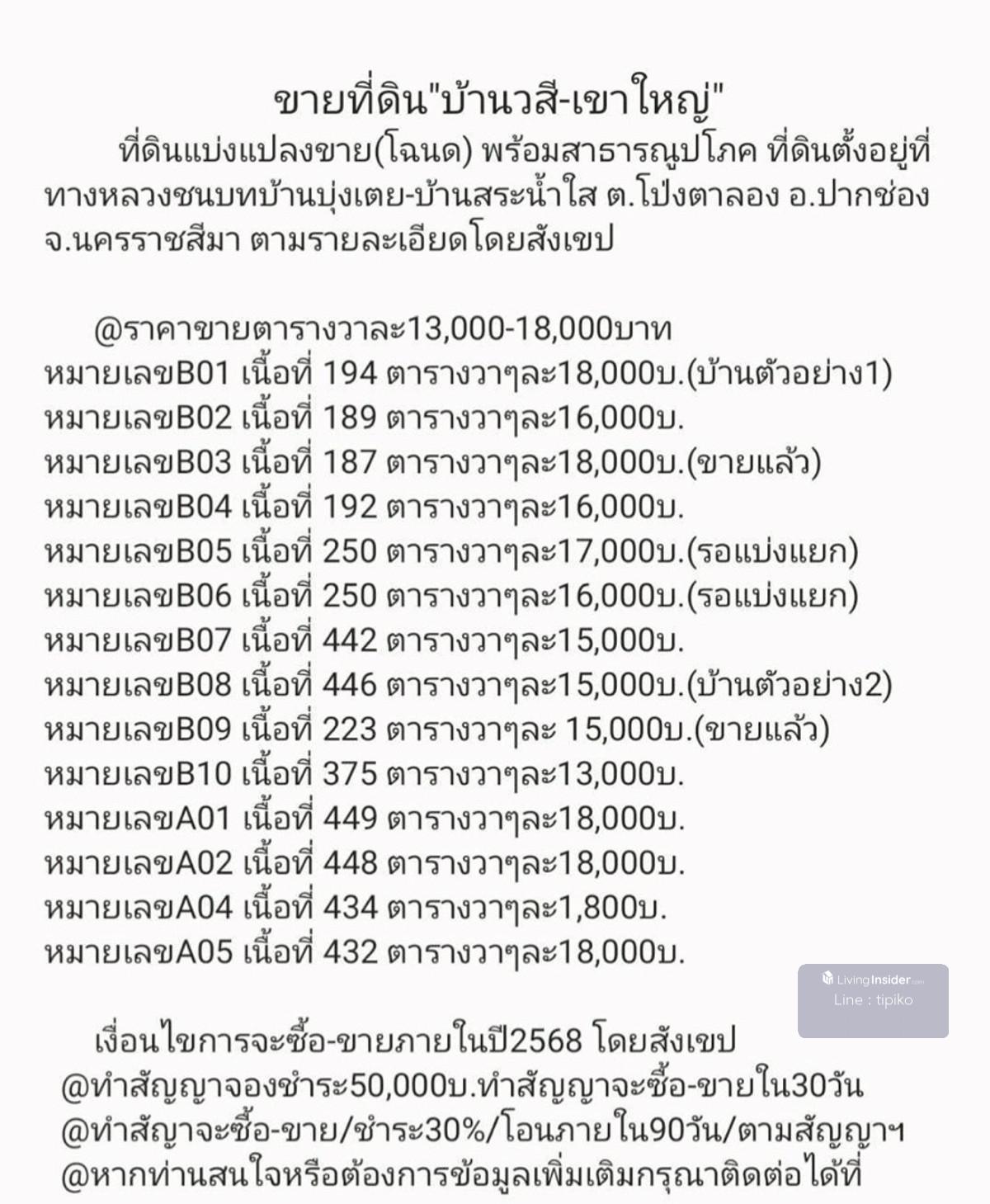ขายที่ดิน "เขาใหญ่" ที่ดินแบ่งแปลงขาย(โฉนด) พร้อมสาธารณูปโภค 📍ที่ดินตั้งอยู่ที่ทางหลวงชนบทบ้านบุ่งเตย-บ้านสระน้ำใส ต.โป่งตาลอง อ.ปากช่องจ.นครราชสีมา 🔖 ราคาขายตารางวาละ 13,000-18,000บาท หมายเลขB01 เนื้อที่ 194 ตารางวาๆละ18,000บ.(บ้านตัวอย่าง1) หมายเลขB02 เนื้อที่ 189 ตารางวาๆละ16,000บ. หมายเลขB03 เนื้อที่ 187 ตารางวาๆละ18,000บ. (ขายแล้ว) หมายเลขB04 เนื้อที่ 192 ตารางวาๆละ16,000บ. หมายเลขB05 เนื้อที่ 250 ตารางวาๆละ17,000บ.(รอแบ่งแยก) หมายเลขB06 เนื้อที่ 250 ตารางวาๆละ16,000บ.(รอแบ่งแยก) หมายเลขB07 เนื้อที่ 442 ตารางวาๆละ15,000บ. หมายเลขB08 เนื้อที่ 446 ตารางวาๆละ15,000บ. (บ้านตัวอย่าง2) หมายเลขB09 เนื้อที่ 223 ตารางวาๆละ 15,000บ.(ขายแล้ว) หมายเลขB10 เนื้อที่ 375 ตารางวาๆละ13,000บ. หมายเลขA01 เนื้อที่ 449 ตารางวาๆละ18,000บ. หมายเลขA02 เนื้อที่ 448 ตารางวาๆละ18,000บ. หมายเลขA04 เนื้อที่ 434 ตารางวาๆละ1,800บ. หมายเลขA05 เนื้อที่ 432 ตารางวาๆละ18,000บ. เงื่อนไขการจะซื้อ-ขายภายในปี2568 ทำสัญญาจองชำระ50,000บ. ทำสัญญาจะซื้อ-ขายใน30วัน สอบถามเพิ่มเติม / นัดชมสถานที่ 📞Tel : คลิกเพื่อดูเบอร์โทรติดต่อ 📲 Line : tipiko https://line.me/ti/p/uaVD7PHXFS