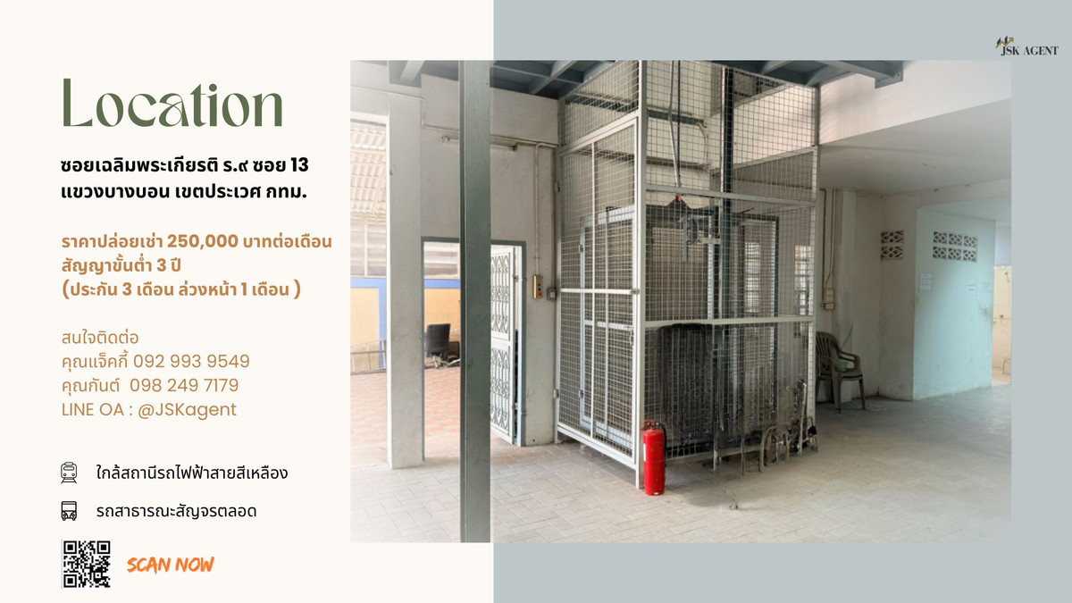ให้เช่าสำนักงานพร้อมคลังสินค้าขนาดใหญ่ บนถนนเฉลิมพระเกียรติ ร.9 ซอย 13 เนื้อที่ดิน 704 ตารางวา พื้นที่ใช้สอย 1500 ตารางเมตร โดยประมาณ พื้นที่คลังสินค้า และสำนักงาน สามารถเข้าใช้สถานที่ได้เลย ราคาปล่อยเช่า 250,000 บาท (สามารถต่อรองได้) สนใจติดต่อสอบถามได้ที่ คุณแจ็คกี้ คลิกเพื่อดูเบอร์โทรติดต่อ , คลิกเพื่อดูเบอร์โทรติดต่อ Line OA : @JSKagent