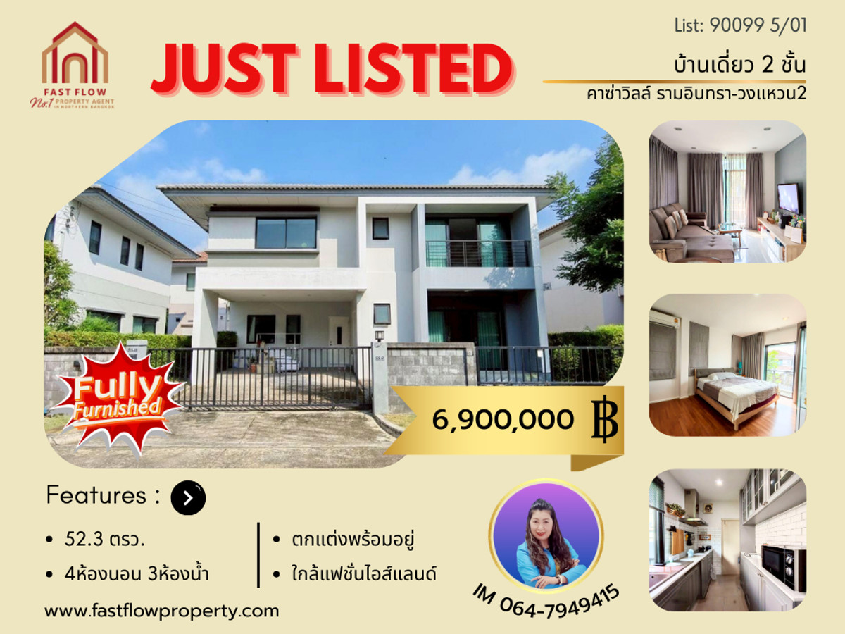 ขาย บ้านเดี่ยว ม.คาซ่าวิลล์ รามอินทรา-วงแหวน2 Casa Ville Ramintra-Wongwaen 2 ถนนกาญจนาภิเษก ติดถนนเลียบวงแหวนตะวันออก ใกล้ ถ.รามอินทรา ถ.รัชดา-รามอินทรา ถ.คู้บอน ถ.จตุโชติ สนามบินสุวรรณภูมิ แฟชั่นไอส์แลนด์ ทางด่วนฉลองรัช IM สนใจติดต่อ รันญรัตน์ Fast Flow Property คลิกเพื่อดูเบอร์โทรติดต่อ, คลิกเพื่อดูเบอร์โทรติดต่อ เบอร์ Line : คลิกเพื่อดูเบอร์โทรติดต่อ Listing no : 90099 Property Detail: - ขาย บ้านเดี่ยว 2 ชั้น ม.คาซ่าวิลล์ รามอินทรา วงแหวน2 - บ้านตำแหน่งดี ใกล้คลับเฮ้าส์ บ้านอยู่ในซอย 4 - ที่ดิน 52.30 ตารางวา - พื้นที่ใช้สอย 167 ตารางเมตร - หน้าบ้านหันทิศใต้ ลมดี อากาศถ่ายเทสะดวก - หน้าบ้านเป็นฝั่งที่ไม่มีเสาไฟฟ้า ดูสะอาด และปลอดภัย - มี 4 ห้องนอน 3 ห้องน้ำ - มีห้องนอนชั้นล่าง - ครัวไทยขนาดใหญ่ เคาน์เตอร์ครัวอย่างดี พร้อมติดเครื่องดูดควัน - จอดรถในร่มได้ 2 คัน - ชั้นล่างปูแกรนิตโต้ ชั้นบนปูลามิเนต - ขายพร้อมเฟอร์นิเจอร์บิวท์อินอย่างดี - ตู้เย็น เครื่องซักผ้า เครื่องกรองน้ำ เครื่องทำน้ำอุ่น 2 เครื่อง ทีวี 4 เครื่อง ปั้มน้ำ แทงค์น้ำ - ขายพร้อมเครื่องปรับอากาศ 6 เครื่อง Project and Facilities: - โครงการพัฒนาโดย บริษัท ควอลิตี้เฮ้าส์ จำกัด (มหาชน) - คลับเฮ้าส์หรู มีสระว่ายน้ำ / ฟิตเนส/ ซาวน่า - ค่าส่วนกลาง 2,080 บาท ต่อเดือน - CCTV และ รปภ. 24 ชั่วโมง - เข้า-ออก หมู่บ้านด้วยระบบ Easy Pass สถานที่ใกล้เคียง: - ทางด่วนกาญจนาภิเษก สุวรรณภูมิ บางนา – บางปะอิน, ทางด่วนฉลองรัช - โรงเรียนนวมินทราชินูทิศ เบญจมราชาลัย, โรงเรียนสารสาสน์วิเทศนิมิตใหม่, โรงเรียนภูมิสมิทธ์, โรงเรียนสาธิตพัฒนา, โรงเรียนโชคชัยหทัยราษฎร์, โรงเรียนโสมาภาพัฒนา, โรงเรียนนานาชาติกลอรี่ สิงคโปร์, โรงเรียนสุขฤทัย - โรงพยาบาลนพรัตน์, โรงพยาบาลสินแพทย์, โรงพยาบาลนวมินทร์, โรงพยาบาลเสรีรักษ์, โรงพยาบาลซีจีเอช สายไหม - แฟชั่นไอส์แลนด์, พรอมานาด, เซ็นทรัลอีสวิลล์, แม็คโคร - ตลาดน้ำพระยาสุเรนทร์, ตลาดมารวย ตำแหน่งที่ตั้ง https://maps.app.goo.gl/aoPzYj7deubp3pKX6 ราคา 6,900,000 บาท บริการช่วยเหลือจัดหาสินเชื่อธนาคารฟรี! ไม่มีเครดิต สามารถกู้ได้ กับ Juzmatch บริการกู้ซื้อบ้าน สำหรับลูกค้าที่ประกอบกิจการส่วนตัว สามารถนัดเข้าชมสถานที่จริงได้ทุกวัน สนใจราคาคุยกันได้ ติดต่อ คุณรันญรัตน์ (อิม) คลิกเพื่อดูเบอร์โทรติดต่อ , คลิกเพื่อดูเบอร์โทรติดต่อ เบอร์ Line: คลิกเพื่อดูเบอร์โทรติดต่อ ติดต่อ Fast Flow Property Office Tel: คลิกเพื่อดูเบอร์โทรติดต่อ Line id: @fastflow FB page: facebook.com/fastflowproperty www.fastflowproperty.com บริการรับฝากขายอสังหาริมทรัพย์ทุกประเภท ฟรีค่าโฆษณา