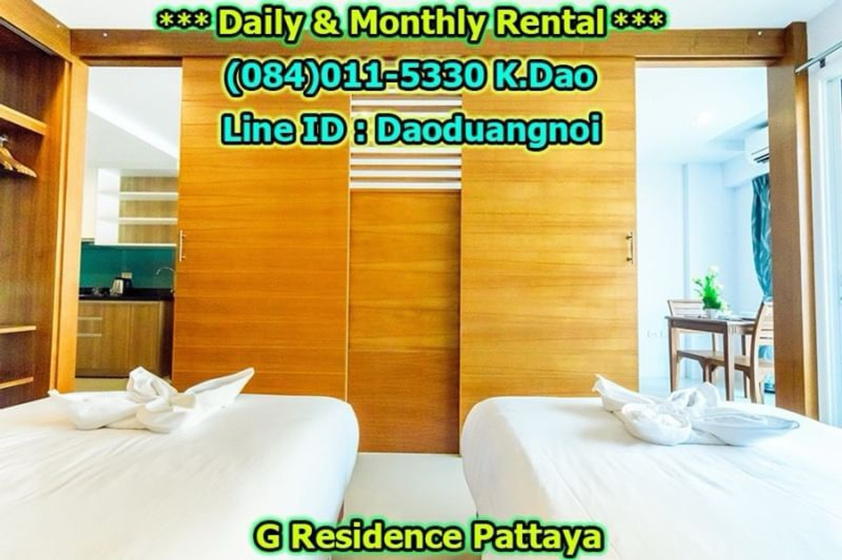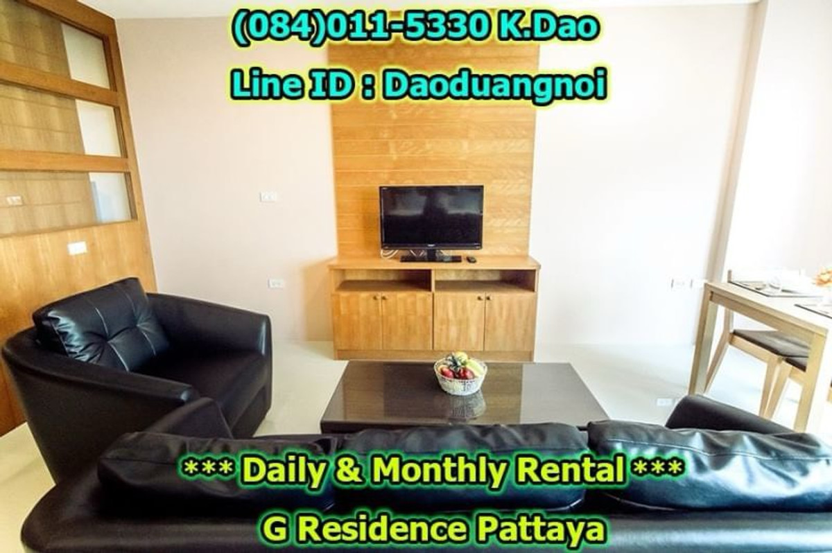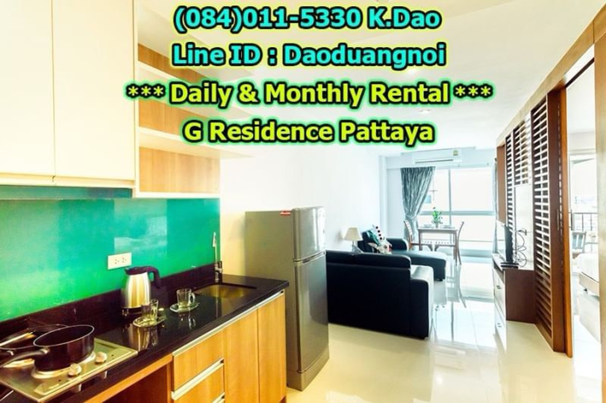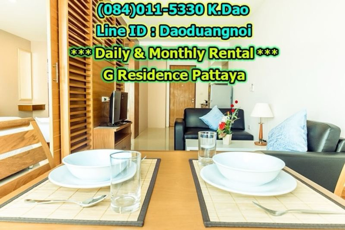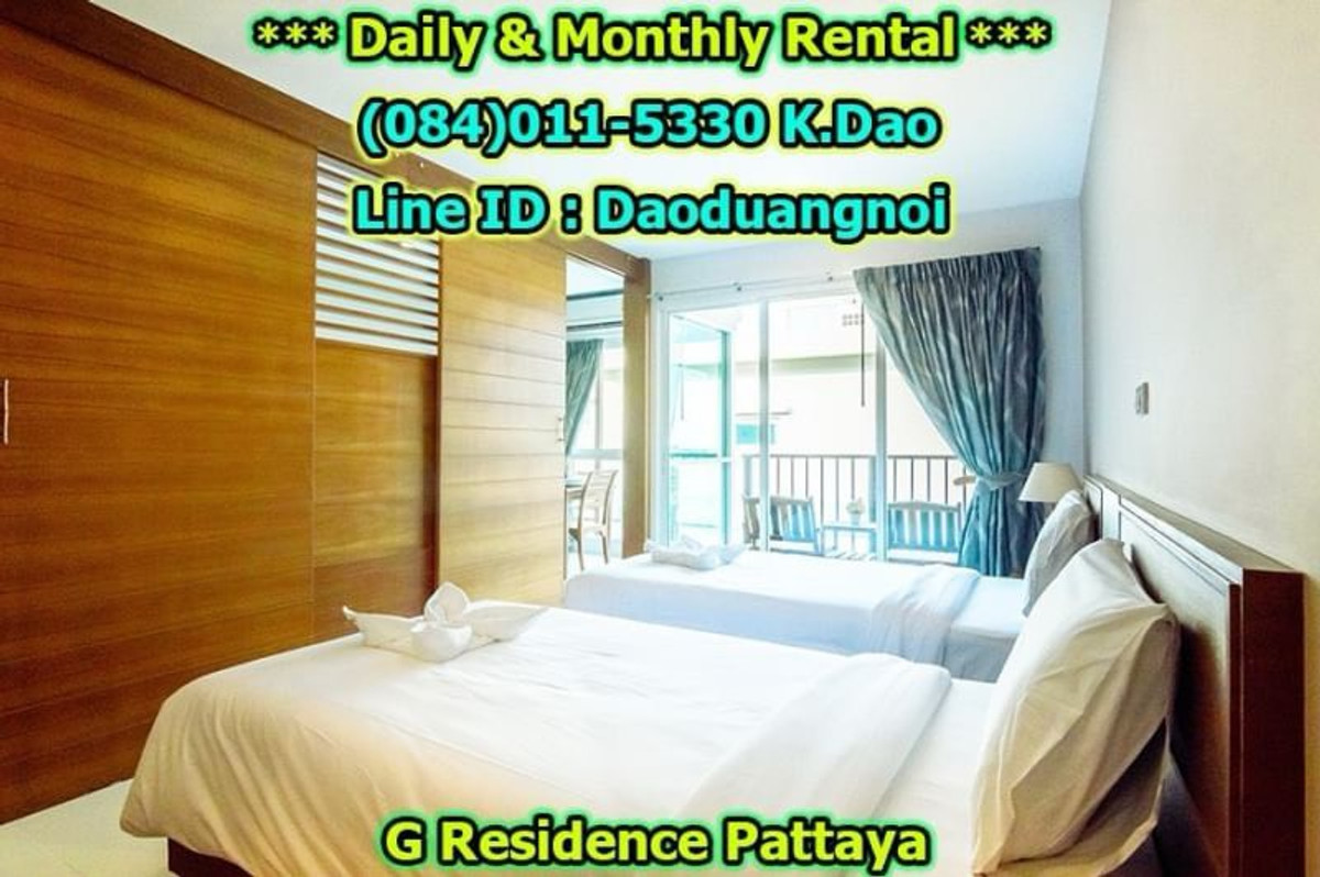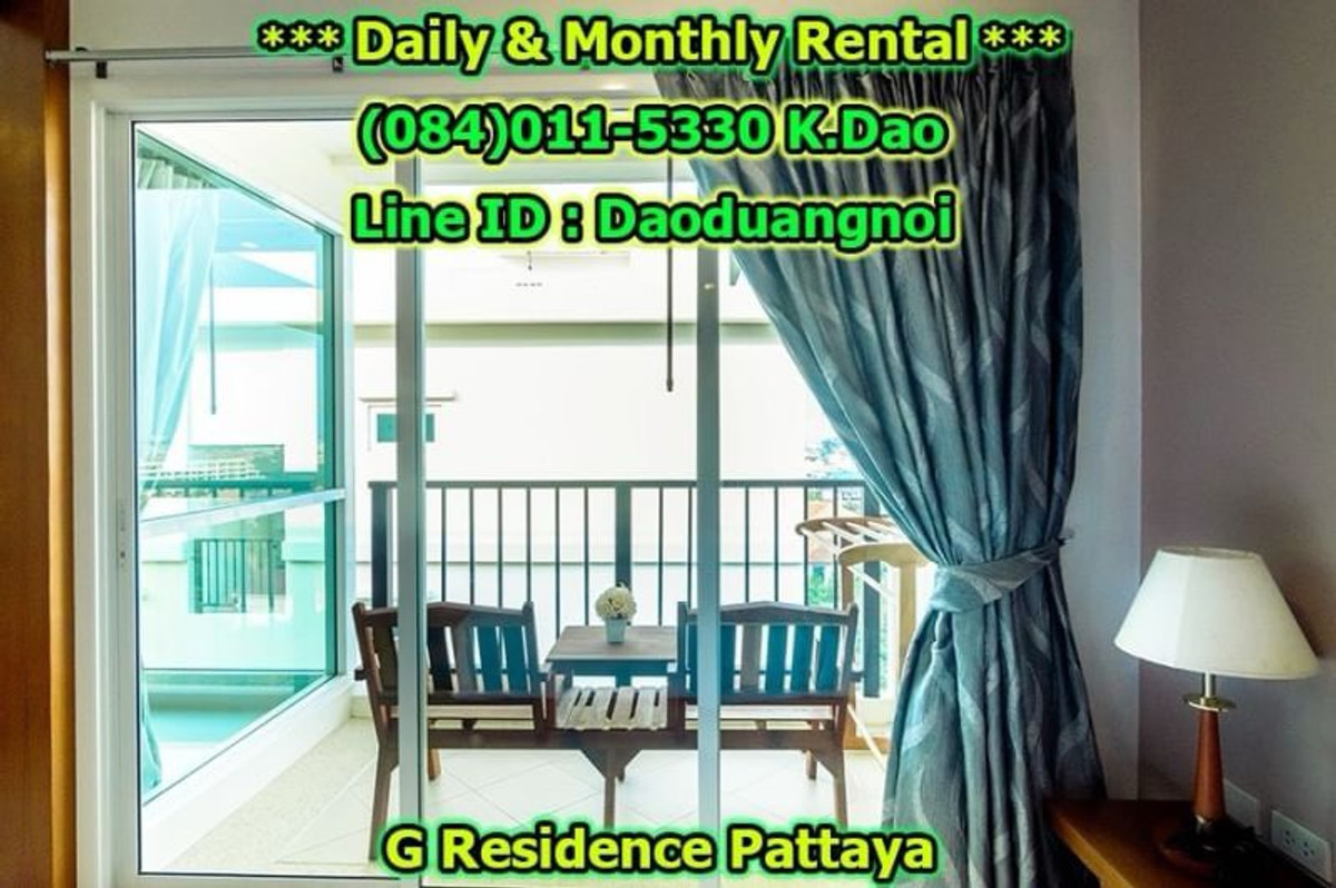 *** Daily & Monthly Rental *** G Residence Pattaya 1-Bedroom Apartment ++ Pool View & City View ++ Area 45 Sq.m. 1 Bedroom 2 Bathrooms 1 European Kitchen Balcony for relaxation Living and Dining Area +++ Furniture & Electric Appliances +++ Electrical cooking hobs 2 air conditioning units Flat-screen TVs with cable TV Refrigerator with freezer Basic kitchen utensils: frying pan, Saucepan, Kettle, cutlery, plates, glasses, Coffee cups, clothes rack, safety box. Free!!! Wifi internet Free!!! Swimming in the luxury pools. High security, 24-hour-security guard Enter the residence (Building G) with a keycard. Daily rental fee 1,200 Baht/Night (City View) ++ For Pool View, 1,400 Baht/Night ++ *** Special *** For 1-year contract, ++ Rental fee is 16,500 Baht/Month ++ Monthly Rental Fee 4 -11 Months; 18,000 Baht/Month 2 - 3 Months; 22,000 Baht/month Location : https://goo.gl/maps/p6ismRL6LpxdKg5A8 Contact for renting with Dao. Tel. : (084)011-5330 Line ID : Daoduangnoi WhatsApp : คลิกเพื่อดูเบอร์โทรติดต่อ https://www.facebook.com/ThePastelProperty