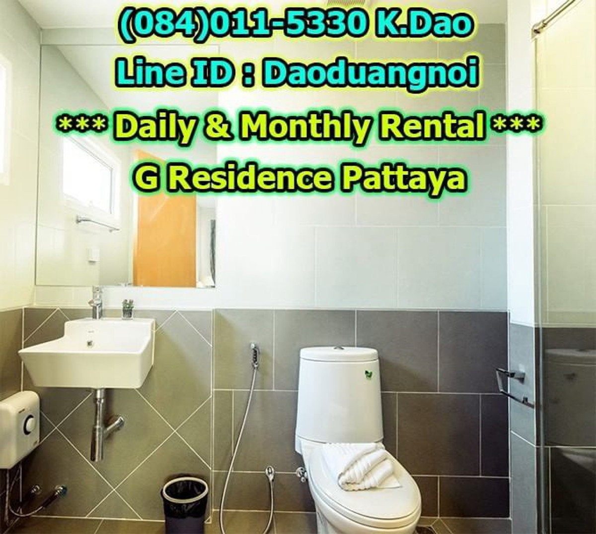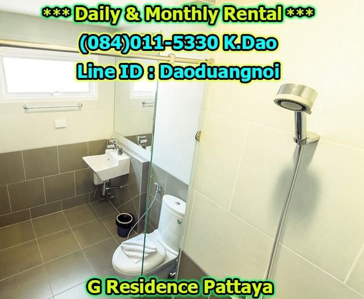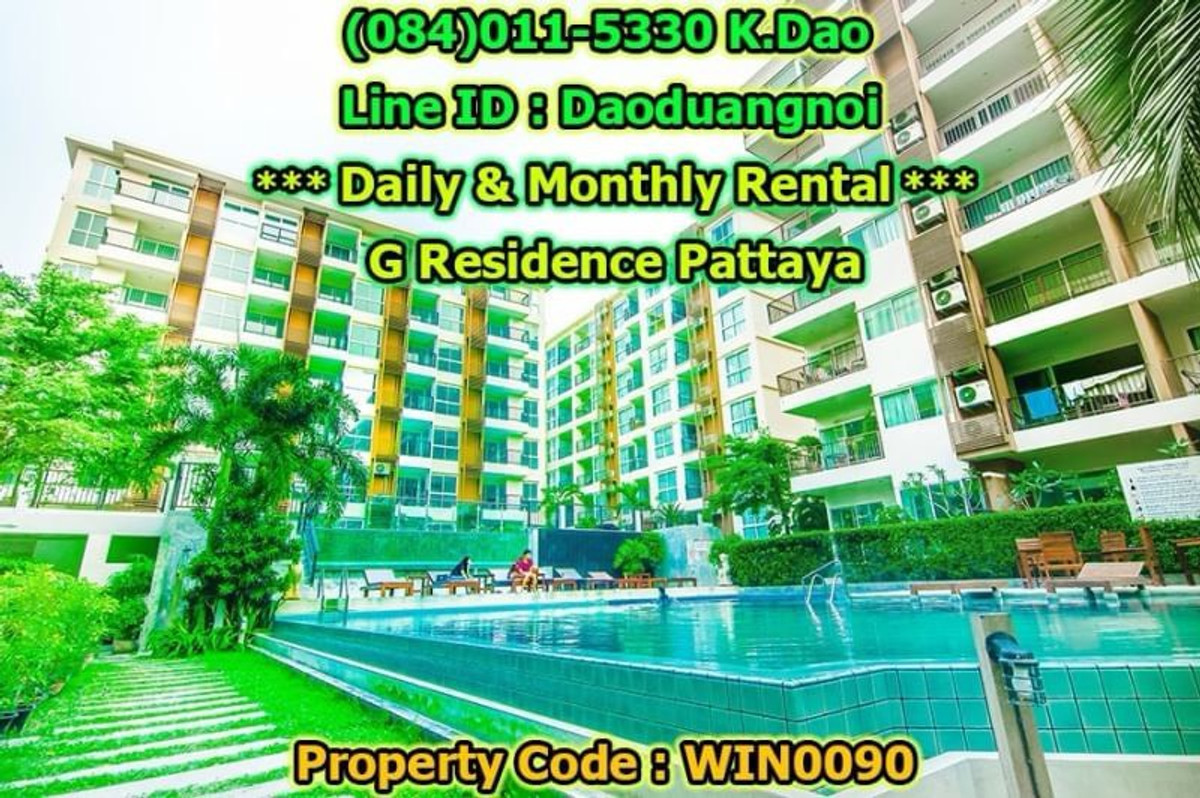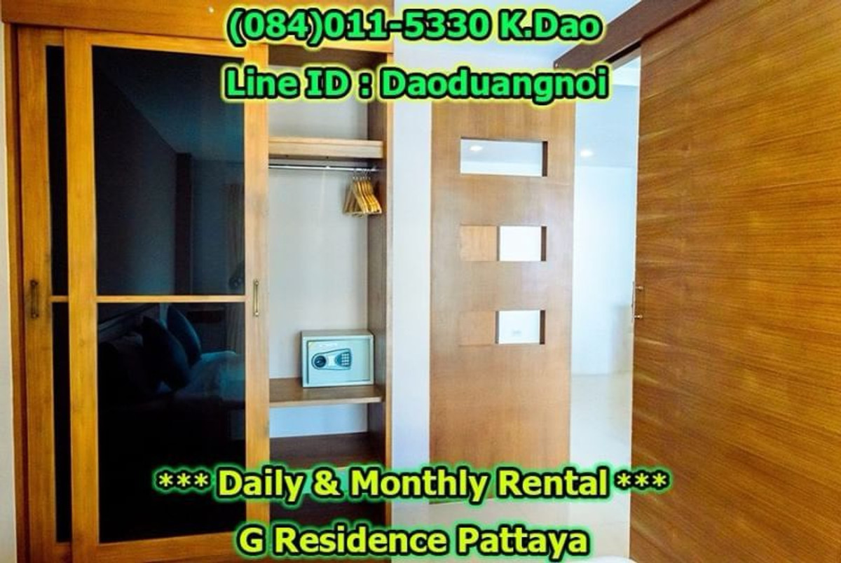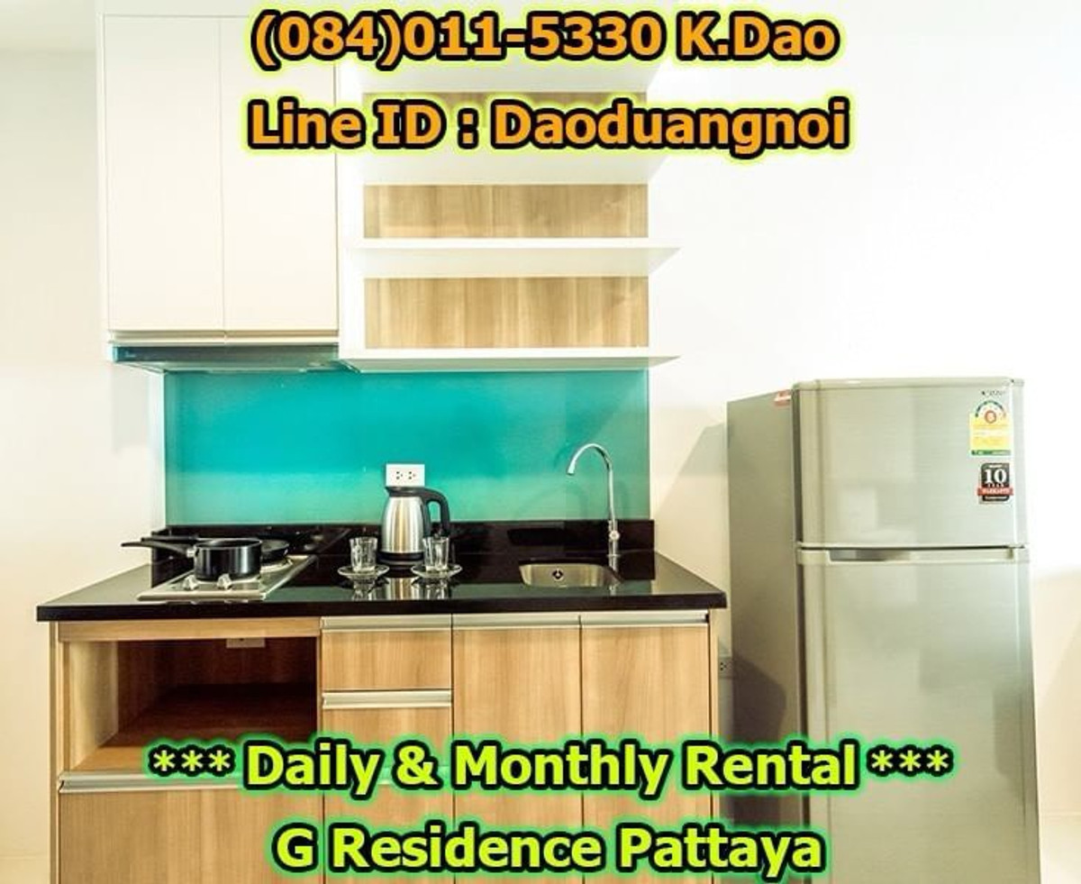 *** Daily & Monthly Rental *** G Residence Pattaya 1-Bedroom Apartment ++ Pool View & City View ++ Area 45 Sq.m. 1 Bedroom 2 Bathrooms 1 European Kitchen Balcony for relaxation Living and Dining Area +++ Furniture & Electric Appliances +++ Electrical cooking hobs 2 air conditioning units Flat-screen TVs with cable TV Refrigerator with freezer Basic kitchen utensils: frying pan, Saucepan, Kettle, cutlery, plates, glasses, Coffee cups, clothes rack, safety box. Free!!! Wifi internet Free!!! Swimming in the luxury pools. High security, 24-hour-security guard Enter the residence (Building G) with a keycard. Daily rental fee 1,200 Baht/Night (City View) ++ For Pool View, 1,400 Baht/Night ++ *** Special *** For 1-year contract, ++ Rental fee is 16,500 Baht/Month ++ Monthly Rental Fee 4 -11 Months; 18,000 Baht/Month 2 - 3 Months; 22,000 Baht/month Location : https://goo.gl/maps/p6ismRL6LpxdKg5A8 Contact for renting with Dao. Tel. : (084)011-5330 Line ID : Daoduangnoi WhatsApp : คลิกเพื่อดูเบอร์โทรติดต่อ https://www.facebook.com/ThePastelProperty