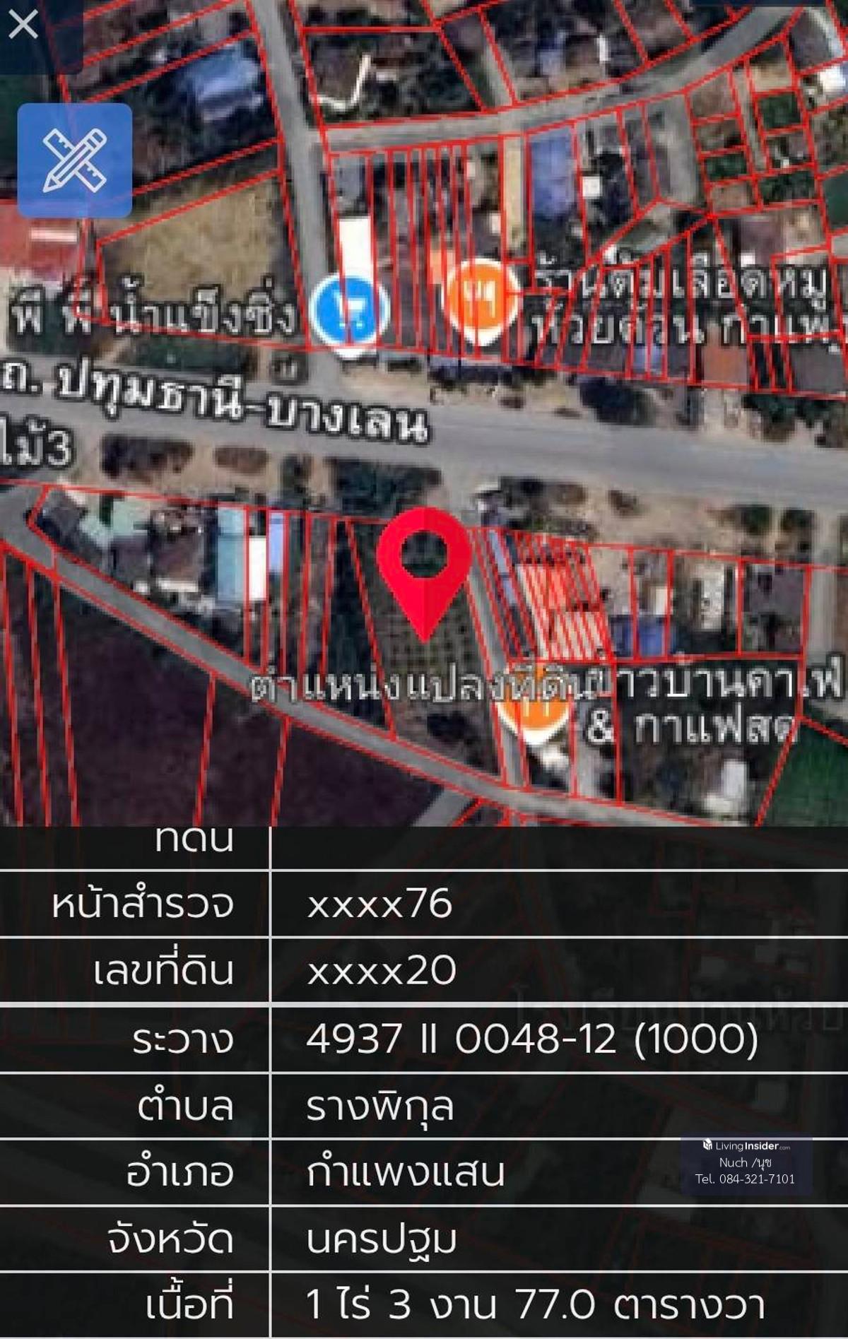ขายที่ดินเปล่า แปลงสวย ใกล้ถนนทางหลวง 346 ที่ตั้ง : ตำบลรางพิกุล อำเภอกำแพงแสน จังหวัดนครปฐม ใกล้ ม.เกษตรศาสตร์ ,โรงพยาบาล, เยื้อง อบต.รางพิกุล ขนาดที่ดิน 1 ไร่ 3 งาน 77 ตารางวา ราคาขาย 7,770,000 บาท ติดต่อ คุณนุช เบอร์โทรศัพท์ : คลิกเพื่อดูเบอร์โทรติดต่อ Line : d558899d WhatsApp : คลิกเพื่อดูเบอร์โทรติดต่อ