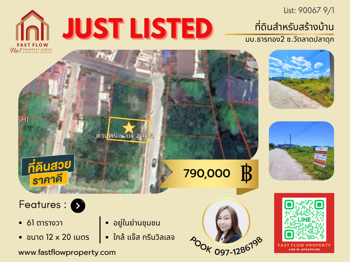 ขาย ที่ดิน 61 ตารางวา ซอยวัดลาดปลาดุก ในหมู่บ้านธารทอง 2 ซอยเต็มรักพัฒนา 9 ใกล้ JAS กรีนวิลเลจ บางบัวทอง โลตัส โก เฟรช ใกล้ถนนบางบัวทอง-ไทรน้อย หมายเลข 1002 ถนนกาญจนาภิเษก PKA สนใจติดต่อ รณพร โวหารา ( ปุ๊ก ) Fast Flow Property คลิกเพื่อดูเบอร์โทรติดต่อ Line id: pook_pookka Listing no : 90067 Property Detail: - ขายที่ดิน 61 ตารางวา ในหมู่บ้านธารทอง 2 ซอยเต็มรักพัฒนา 9 - หน้ากว้างติดถนนประมาณ 12 เมตร ลึกประมาณ 20 เมตร - หน้าที่ดินหันทิศตะวันออก - เหมาะสำหรับสร้างบ้านพักอาศัย - เดินทางสะดวก จากถนนบางบัวทอง-ไทรน้อยหมายเลข 1002 เชื่อมกับถนนกาญจนาภิเษก - ถนนซอยขนาด 2 เลน รถสวนไปมาสะดวก สถานที่ใกล้เคียง: - สำนักงานเทศบาลบางรักพัฒนา - วัดลาดปลาดุก - โฮมโปรบางบัวทอง, Big C วัดลาดปลาดุก, JAS Green Village บางบัวทอง ตำแหน่งที่ตั้ง https://maps.app.goo.gl/MLqFqhtehb9kZdAC6 ราคา 790,000 บาท สามารถนัดเข้าชมสถานที่จริงได้ทุกวัน สนใจราคาคุยกันได้ ติดต่อ คุณรณพร (ปุ๊ก) คลิกเพื่อดูเบอร์โทรติดต่อ Line id: @fastflow ติดต่อ Fast Flow Property Office Tel: คลิกเพื่อดูเบอร์โทรติดต่อ Line id: @fastflow FB page: facebook.com/fastflowproperty www.fastflowproperty.com บริการรับฝากขายอสังหาริมทรัพย์ทุกประเภท ฟรีค่าโฆษณา