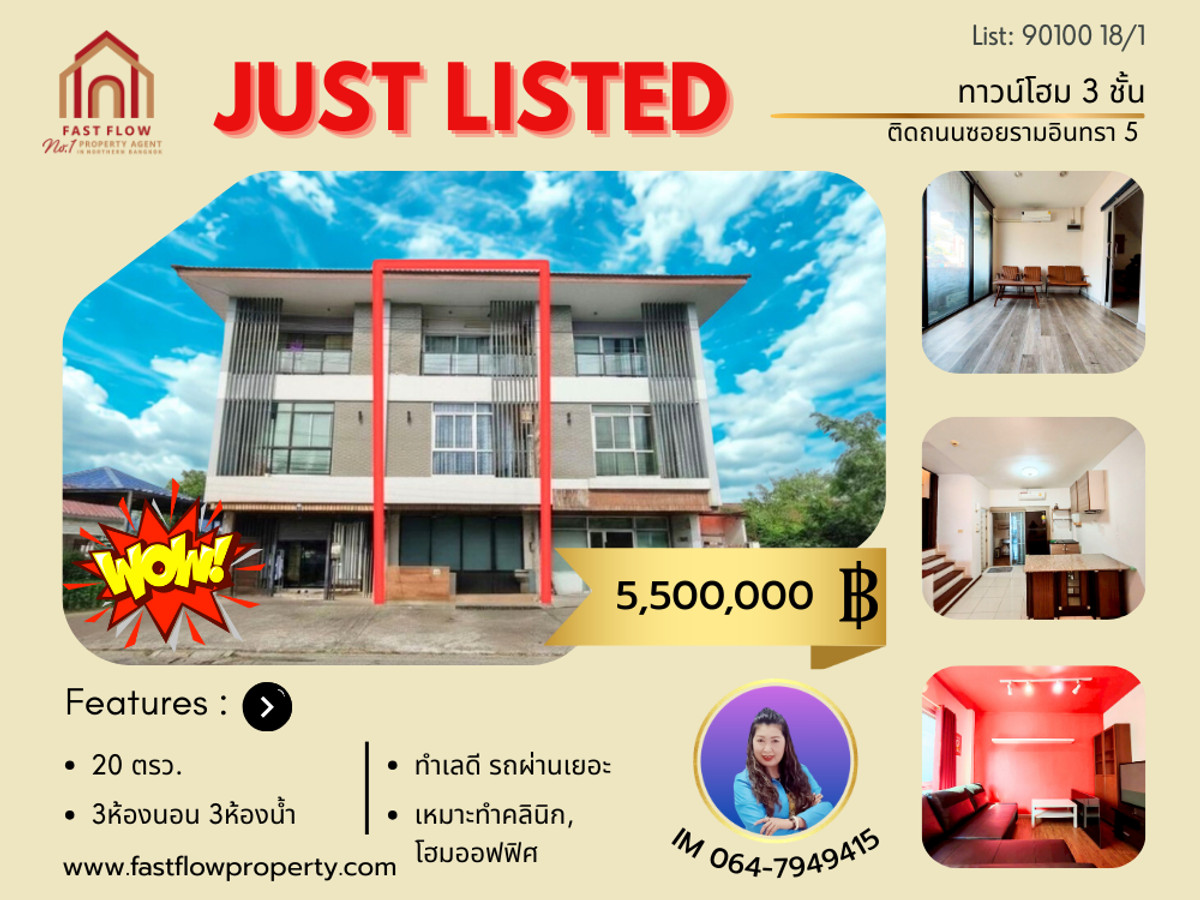 ขาย ทาวน์เฮ้าส์ ซอยรามอินทรา 5 แยก 11 ทาวน์โฮม 3 ชั้น รามอินทรา 19, 21, 23 พหลโยธิน 48 ถนนเทพรักษ์ วัชรพล สุขาภิบาล5 ใกล้เซ็นทรัลรามอินทรา ใกล้ BTS ลาดปลาเค้า เหมาะทำคลินิก ร้านขายยา โฮมออฟฟิศ IM สนใจติดต่อ อิม (รันญรัตน์) Fast Flow Property คลิกเพื่อดูเบอร์โทรติดต่อ, คลิกเพื่อดูเบอร์โทรติดต่อ เบอร์ Line : คลิกเพื่อดูเบอร์โทรติดต่อ Listing no : 90100 Property Detail: - ขาย ทาวน์เฮ้าส์ 3 ชั้น ปากซอยรามอินทรา5 แยก 11 - อยู่ติดถนนซอยรามอินทรา 5 ซึ่งเป็นซอยใหญ่ รถผ่านเยอะ ทำธุรกิจได้ - ซอยรามอินทรา 5 เชื่อมต่อกับซอย รามอินทรา 19, 21, 23, ซอยพหลโยธิน 48, ถนนเทพรักษ์ และถนนสุขาภิบาล5 - ที่ดิน 20 ตารางวา - พื้นที่ใช้สอยประมาณ 170 ตารางเมตร - หน้าบ้านหันทิศตะวันออกเฉียงใต้ รับพลังงานแสงแดดยามเช้า - มี 3 ห้องนอน 3 ห้องน้ำ - ต่อเติมครัวไทยด้านหลังบ้าน เต็มพื้นที่ เคาน์เตอร์ครัวอย่างดี พร้อมติดเครื่องดูดควัน - ชั้นล่างปูกระเบื้อง/ลามิเนต, ชั้นบนกระเบื้อง/ลามิเนต - ขายพร้อมเฟอร์นิเจอร์บางส่วน - ขายพร้อมเครื่องปรับอากาศ 7 เครื่อง และตู้เย็น เครื่องซักผ้า เครื่องอบผ้า สถานที่ใกล้เคียง: - BTS ลาดปลาเค้า - เซ็นทรัลรามอินทรา, แฟชั่นไอส์แลนด์, พรอมานาด, เพลินนารี่มอลล์, บิ๊กซีรามอินทรา - ทางด่วนพิเศษ ฉลองรัช - ตลาดยิ่งเจริญ, ตลาดถนอมมิตร, ตลาดนัดเลียบด่วน2 - มหาวิทยาลัยนอร์ทกรุงเทพ วิทยาเขตสะพานใหม่, วิทยาลัยเทคโนโลยีสยามบริหารธุรกิจ วิทยาเขตสะพานใหม่, - โรงพยาบาลสินแพทย์, โรงพยาบาลนพรัตน์, โรงพยาบาลซีจีเอช, โรงพยาบาลภูมิพล ตำแหน่งที่ตั้ง https://maps.app.goo.gl/XJra6KvB8DFxvAUG6 ราคา 5,500,000 บาท บริการช่วยเหลือจัดหาสินเชื่อธนาคารฟรี! สามารถนัดเข้าชมสถานที่จริงได้ทุกวัน สนใจราคาคุยกันได้ ติดต่อ คุณรันญรัตน์ (อิม) คลิกเพื่อดูเบอร์โทรติดต่อ, คลิกเพื่อดูเบอร์โทรติดต่อ เบอร์ Line: คลิกเพื่อดูเบอร์โทรติดต่อ ติดต่อ Fast Flow Property Office Tel: คลิกเพื่อดูเบอร์โทรติดต่อ Line id: @fastflow FB page: facebook.com/fastflowproperty www.fastflowproperty.com บริการรับฝากขายอสังหาริมทรัพย์ทุกประเภท ฟรีค่าโฆษณา