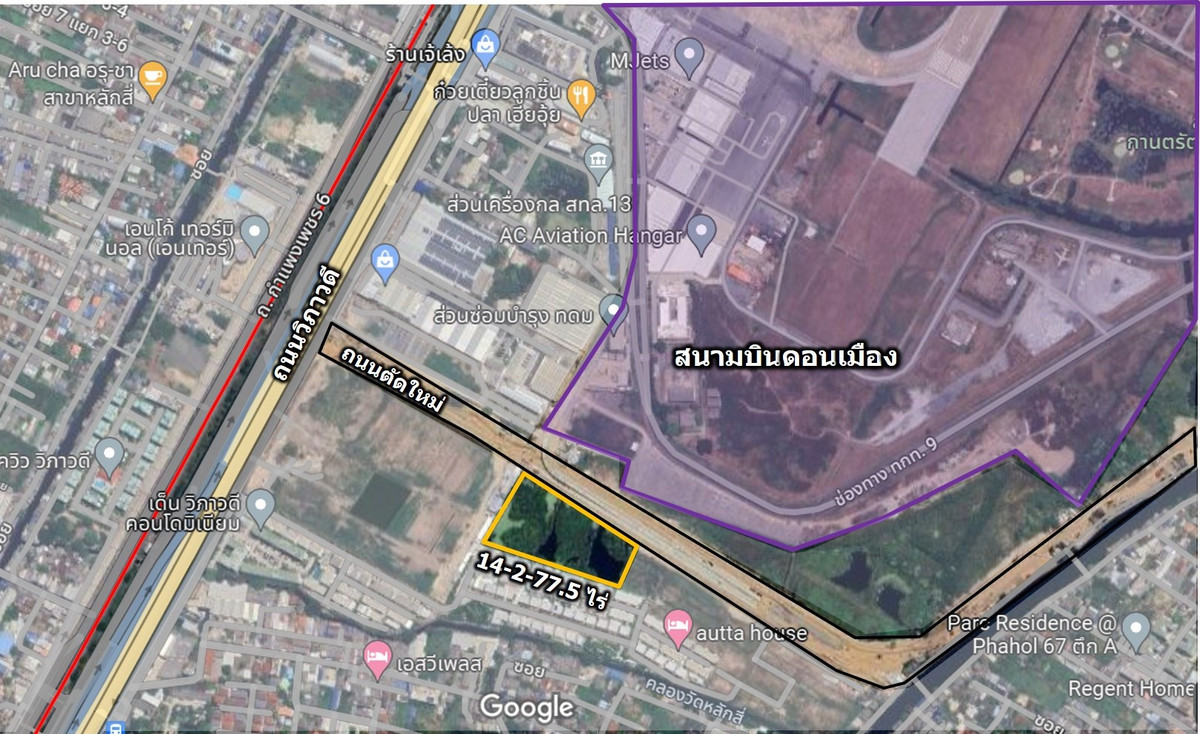 ขายที่ดิน 14-2-77.5 ไร่ ถนนเทพรักษ์ ตัดใหม่วิภาวดี-พหลโยธิน (สนามบินดอนเมือง) เนื้อที่ 14 ไร่ 2 งาน 77.50 ตารางวา หรือ 5,877.50 ตารางวา หน้ากว้างติดถนนทั้งหมด 205 เมตร ลึก 137 : 82 เมตร ถนน เทพรักษ์ (เชื่อมวิภาวดี-พหลโยธิน-เทพรักษ์) แขวงสนามบิน เขตดอนเมือง กรุงเทพมหานคร 10210 พิกัด 13.89065937,100.59577951 ผังเมือง สีเหลือง ย.4-7 FAR 3:1 OSR 10% - ที่อยู่อาศัยรวม ไม่เกิน 10,000 ตร.ม. - ประกอบพาณิชยกรรม ไม่เกิน 2,000 ตร.ม. - สำนักงาน ไม่เกิน 1,000 ตร.ม. - จำกัดความสูง ประมาณ 15.40-18.12 เมตร ขาย ตารางวาละ 100,000 บาท (40,000,000 บาท ต่อ ไร่) รวมทั้งหมด 587,750,000 บาท สนใจติดต่อ บิ๋ม คลิกเพื่อดูเบอร์โทรติดต่อ ขายที่ดินสวย สภาพแวดล้อมดี ทำเลเข้าออกสะดวก เข้าออกได้หลายทาง ราคาต่อรองได้ ต้องการพิกัดแผนที่ หรือ ข้อมูลเพิ่มเติม แชท/โทร มาคุยได้ ขายที่ดินสวย สภาพแวดล้อมดี ทำเลเข้าออกสะดวก เข้าออกได้หลายทาง ราคาต่อรองได้ ต้องการพิกัดแผนที่ หรือ ข้อมูลเพิ่มเติม แชท/โทร มาคุยได้