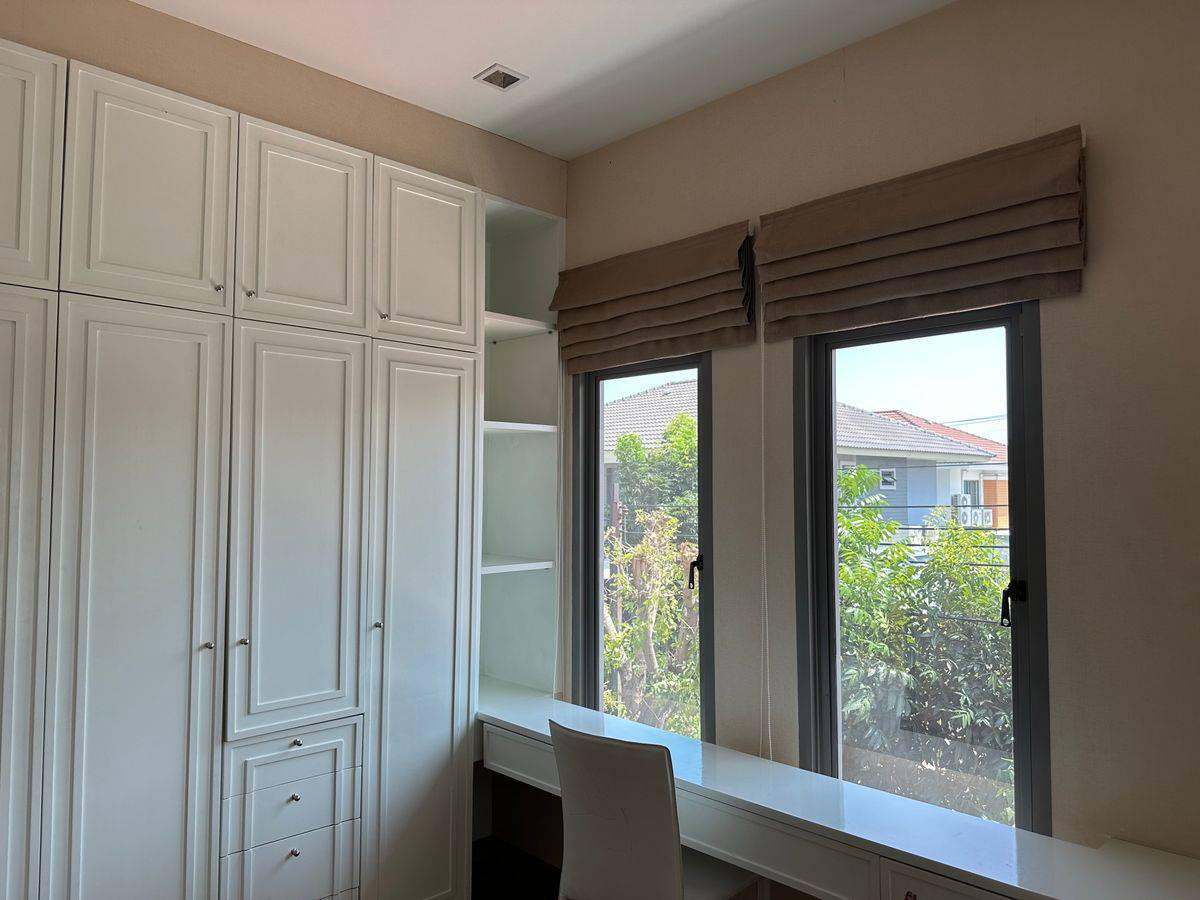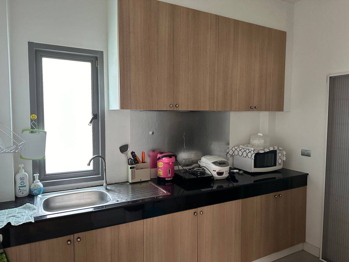 Discover a perfect blend of comfort and convenience in this beautifully maintained home located in the highly sought-after Perfect Place Sukhumvit 77 - Suvarnabhumi Phase 6. This residence features a bright, airy atmosphere with a touch of modern-tropical charm, ideal for professionals or small families seeking a peaceful retreat near the city’s major transport hubs. Property Highlights: Living Area: An inviting open-plan living space featuring a warm mustard-yellow sofa, polished tile flooring, and floor-to-ceiling glass doors that lead out to a private balcony with garden views. Dining & Kitchen: A functional wooden dining set paired with a sleek, modern kitchenette equipped with overhead cabinetry, a black granite countertop, and essential appliances. Bedrooms: * Master Suite: Spacious and light-filled with a large balcony, air conditioning, and a built-in work/study station. Second Bedroom: Features cozy wooden laminate flooring and large windows for natural light. Storage & Functionality: Extensive built-in wardrobes and shelving units throughout the house ensure a clutter-free living environment. Bathroom: Clean, contemporary design with a dedicated shower area and an instant water heater installed. Project Features & Location: Located in Phase 6 of the prestigious Perfect Place development, residents enjoy premium facilities including a clubhouse, swimming pool, fitness center, and 24-hour security. Prime Connectivity: Just minutes away from Suvarnabhumi Airport and the Airport Rail Link (Lat Krabang). Shopping & Lifestyle: Easy access to Robinson Lifestyle Lat Krabang, The Paseo Mall, and various international schools.