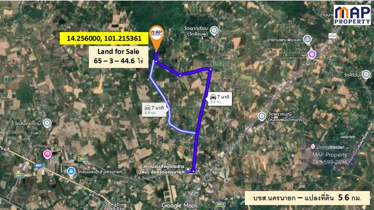 ที่ดินในหุบเขา เนื้อที่ 65-3-44.6 ไร่ ติดถนนเขาทุเรียน-เขาน้อย ต.เขาพระอ.เมืองจ.นครนายก ล้อมรั้วด้านติดถนน ที่ดินรูปหลายเหลี่ยม ขนาด 300 X 400 เมตร ถมแล้วบางส่วน ขุดบ่อสำรองน้ำใช้ในการเกษตร น้ำประปา+ไ