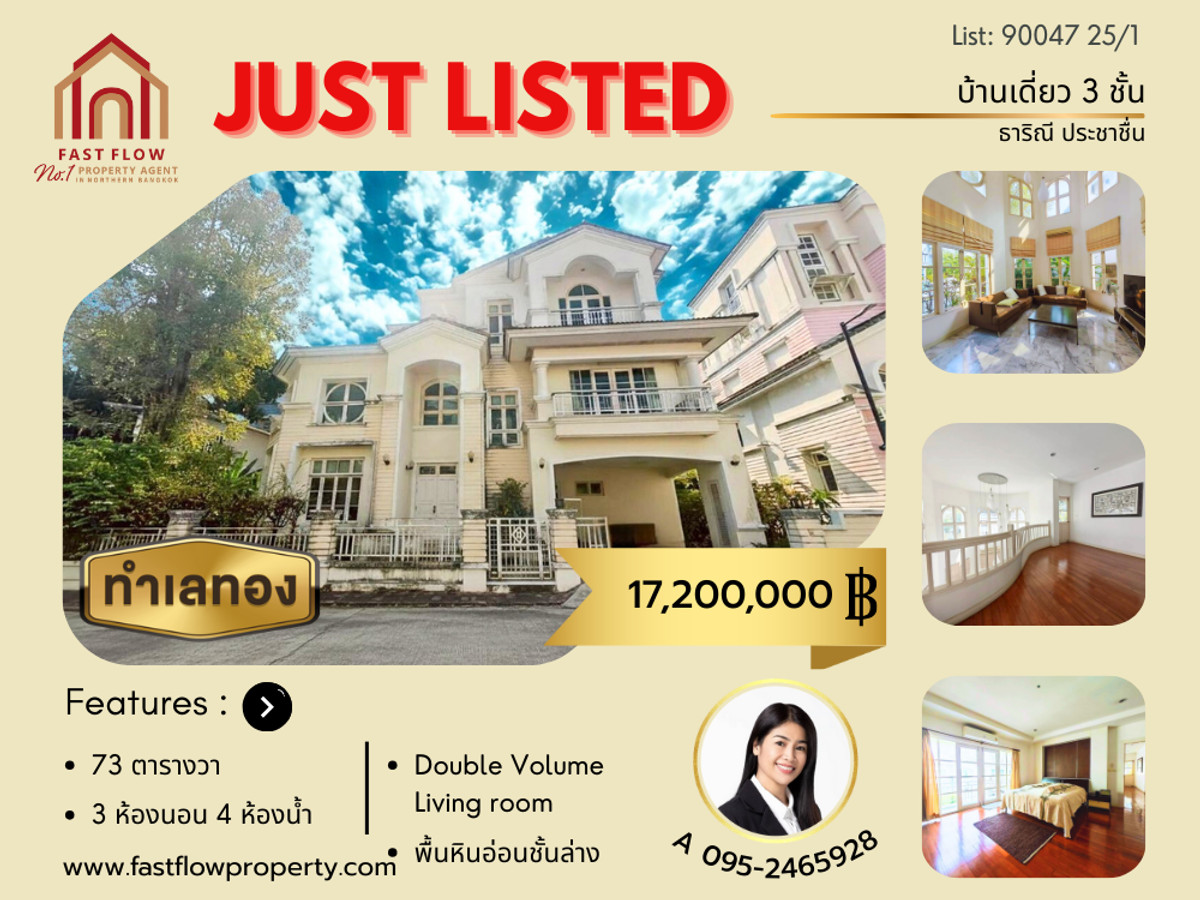 ขายบ้านเดี่ยว 3 ชั้น หมู่บ้าน ธาริณี ประชาชื่น (Baan Tharinee Prachachuen) โดย L&H ถนนประชาชื่น ใกล้เดอะมอลล์งามวงศ์วาน ถนนเทศบาลรังสรรเหนือ ARA สนใจติดต่อ คุณเอ- อารยา Fast Flow Property โทร คลิก
