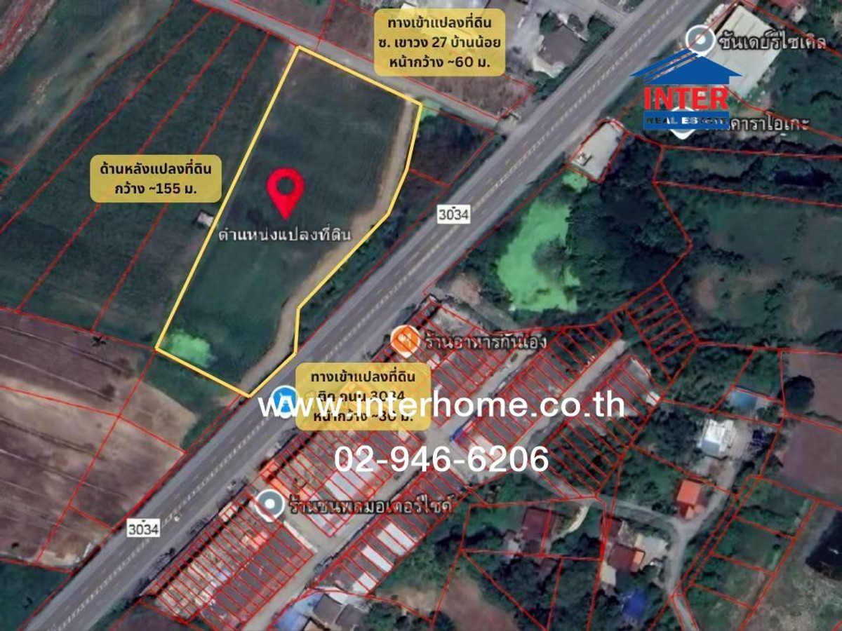 คุณ ณัฐสิน ตรีเพ็ชร (คิริน) เบอร์ติดต่อ : คลิกเพื่อดูเบอร์โทรติดต่อ Office : คลิกเพื่อดูเบอร์โทรติดต่อ สอบถามทางไลน์ https://lin.ee/xTo07Pn Line ID: @interhome รหัสอสังหาริมทรัพย์ : 66122 ขนาด 5 ไร่330 ตร.ว. ที่ตั้ง : ใกล้ปตท.ห้วยป่าหวาย สระบุรี ถ.หมายเลข 3034 พระพุทธบาท สระบุรี รายละเอียด ใกล้ที่ทำการ อบต. เขาวง วัดเขาวง (ถ้ำนารายณ์) จ.สระบุรี ขายที่ดินเปล่า ใกล้ปตท.ห้วยป่าหวาย ติดถนนหมายเลข 3034 ตำบล เขาวง อำเภอพระพุทธบาท จังหวัดสระบุรี ที่ดินเปล่า เนื้อที่ 5-3-30 ไร่ ด้านหน้าแปลงที่ดิน หันหน้าทิศตะวันออกเฉียงใต้ ติดถนน 3034 หน้ากว้าง ~ 30 ม. (โดยประมาณ) ด้านข้างแปลงที่ดิน ด้านทิศ ตะวันออกเฉียงเหนือ หน้ากว้าง ~60 ม. (โดยประมาณ) ด้านหลังแปลงที่ดิน กว้าง ~155 ม. (โดยประมาณ) มีถนนลูกรัง กว้าง ~6 ม. ภายในแปลงที่ดิน (ด้านขวาสุดของแปลงที่ดิน) ด้านข้างแปลงที่ดิน ด้านทิศ ตะวันออกเฉียงเหนือ สามารถเข้าออกทาง ซอยเขาวง 27 บ้านน้อยได้ เป็นถนนคอนกรีตกว้าง ~5 ม. ราคา ~3,780,000 บาท/ไร่ ตั้งอยู่ในพื้นที่ผังสีเขียว (ชนบทและเกษตรกรรม) จุดเด่น : ติดถนนสาธารณะ เดินทางสะดวก เงียบสงบ ไม่วุ่นวาย ใกล้แหล่งชุมชน ที่สวย บรรยากาศดี วิวทุ่งนา ภูเขา เหมาะสำหรับทำบ้านพักตากอากาศ ฟาร์ม อื่น ๆ ทำเลดีสถานที่ใกล้เคียง : ที่ทำการ อบต. เขาวง วัดเขาวง (ถ้ำนารายณ์) จ.สระบุรี บริษัท คาร์กิลล์มีทส์ (ไทยแลนด์) จำกัด บริษัท ปูนซิเมนต์ไทย(ท่าหลวง) จำกัด (โรงงานเขาวง) วัดถ้ำกระบอก วัดพระพุทธบาท ราชวรมหาวิหาร โรงพยาบาลพระพุทธบาท การเดินทางสะดวก : ติดถนนหมายเลข 3034 เชื่อมต่อ ถนนพหลโยธิน สามารถเข้าออก ทางถนนหมายเลข3034 และ ซอยเขาวง 27 บ้านน้อย (ถนนคอนกรีตกว้าง ~5 ม.) บริษัท อินเตอร์โฮม เรียลตี้ เอสเตท จำกัด Interhome Realty Estate www.interhome.co.th โทร. คลิกเพื่อดูเบอร์โทรติดต่อ https://www.interhome.co.th/propertydetail.php?propcode=66122
