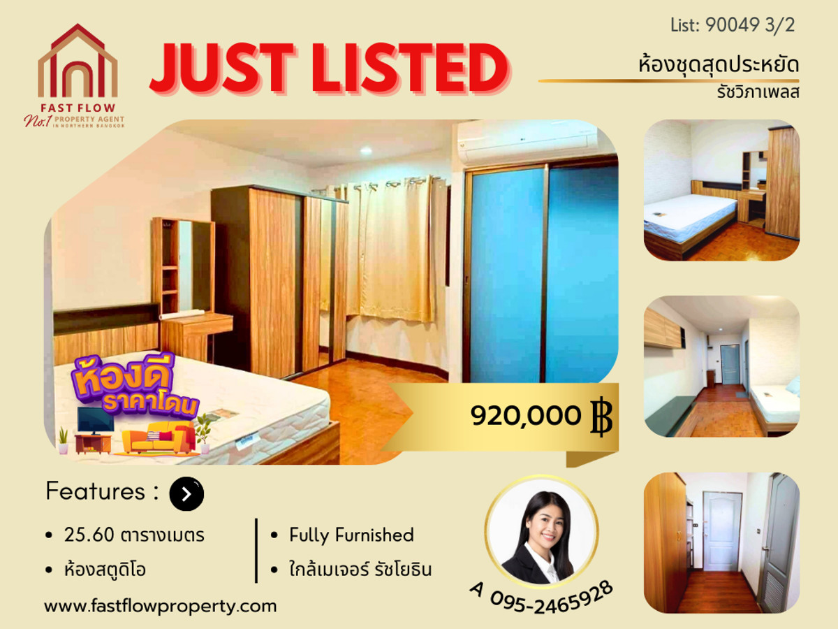 ขายถูกสุดในโครงการ คอนโด รัชวิภาเพลส ใกล้ SCB Park ใกล้เมเจอร์รัชโยธิน BTS รัชโยธิน แยกรัชวิภาขาเข้า ซอยพหลโยธิน35/4 แยก2 ซอยรัชดาภิเษก 48 ถนนวิภาวดีรังสิต ARA สนใจติดต่อ คุณ เอ- อารยา โทร คลิกเพื่อดูเบอร์โทรติดต่อ , คลิกเพื่อดูเบอร์โทรติดต่อ LINE OA : @fastflow Listing no : 90049 Room Detail: - ขายห้องชุด โครงการรัชวิภาเพลส - ห้องมีผู้เช่าอยู่ สามารถเลือกให้ผู้เช่าอยู่ต่อ หรือให้ผู้เช่าออกแล้วอยู่เองก็ได้ - ห้องอยู่ชั้น 6 - พื้นที่ใช้สอย 25.60 ตารางเมตร - ห้องเป็นแบบสตูดิโอ พร้อมห้องน้ำ 1 ห้อง - ระเบียงหันทิศตะวันตก แต่ไม่ได้รับแดดตรง ทำให้ห้องไม่อับชื้น แต่ไม่ร้อนเพราะมีร่มเงาจากตึกข้างเคียง - สิทธิ์จอดรถ 1 คัน - ขายพร้อมเฟอร์นิเจอร์ และ เครื่องปรับอากาศ 1 เครื่อง Project and Facilities: - ค่าส่วนกลาง 30 บาทต่อตารางเมตร ต่อเดือน - CCTV และ รปภ. 24 ชั่วโมง - ประตูเข้า-ออกโครงการ แสกนลายนิ้วมือ สถานที่ใกล้เคียง: - รถไฟฟ้าสายสีเขียว BTS รัชโยธิน - โรงเรียนหอวัง - โรงพยาบาลวิภาวดี - เซ็นทรัลลาดพร้าว, โลตัสลาดพร้าว, บิ๊กซีลาดพร้าว - ศูนย์ Laser Vision ตำแหน่งที่ตั้ง https://maps.app.goo.gl/CwARFsyoHWKGx1U8A ราคา 920,000 บาท บริการช่วยเหลือจัดหาสินเชื่อธนาคารฟรี! สามารถนัดเข้าชมสถานที่จริงได้ทุกวัน สนใจราคาคุยกันได้ ติดต่อ เอ- อารยา โทร คลิกเพื่อดูเบอร์โทรติดต่อ Line id: @fastflow ติดต่อ Fast Flow Property Office Tel: คลิกเพื่อดูเบอร์โทรติดต่อ Line id: @fastflow FB page: facebook.com/fastflowproperty www.fastflowproperty.com บริการรับฝากขายอสังหาริมทรัพย์ทุกประเภท ฟรีค่าโฆษณา