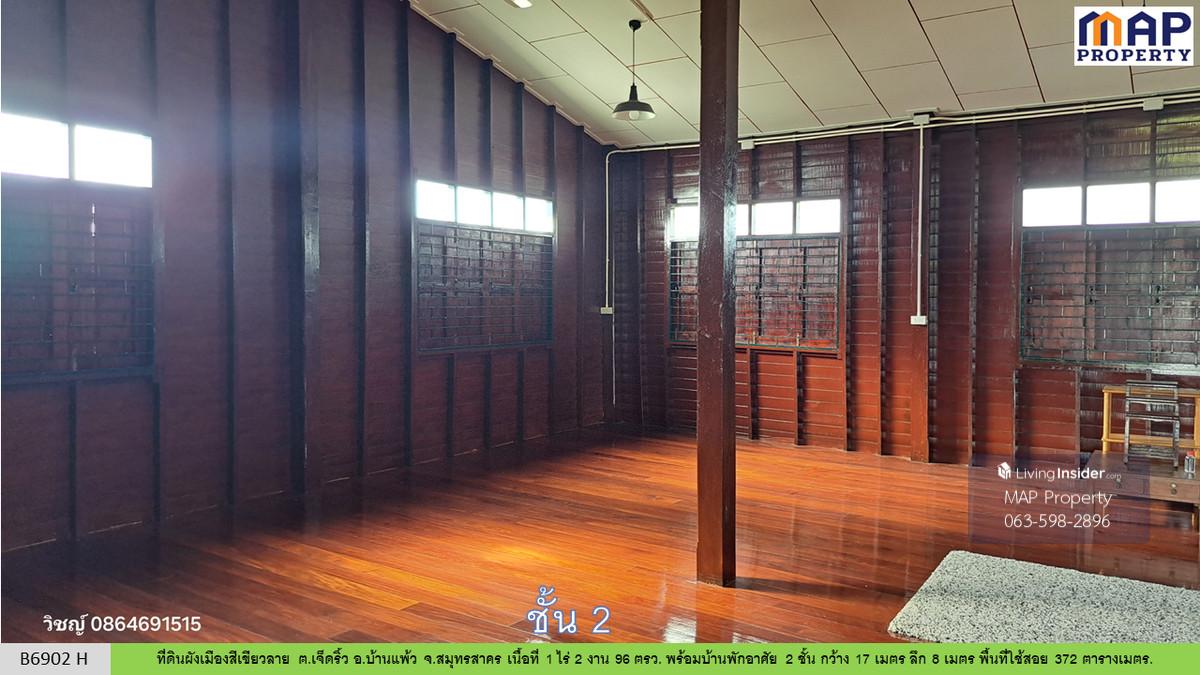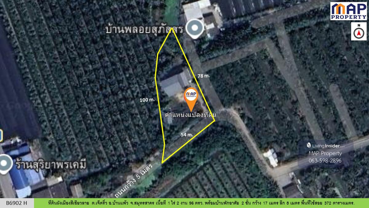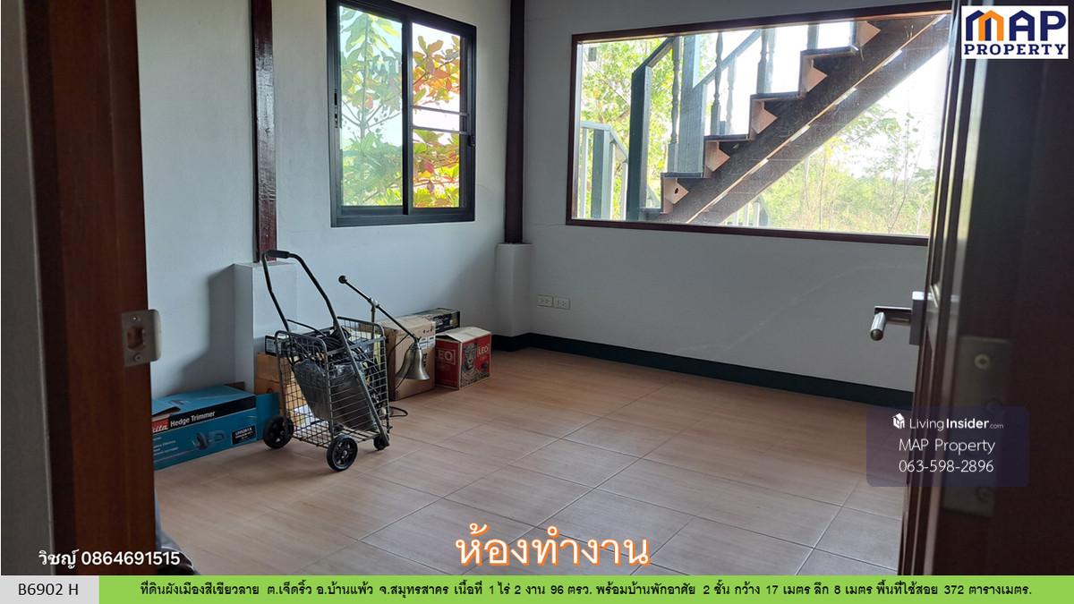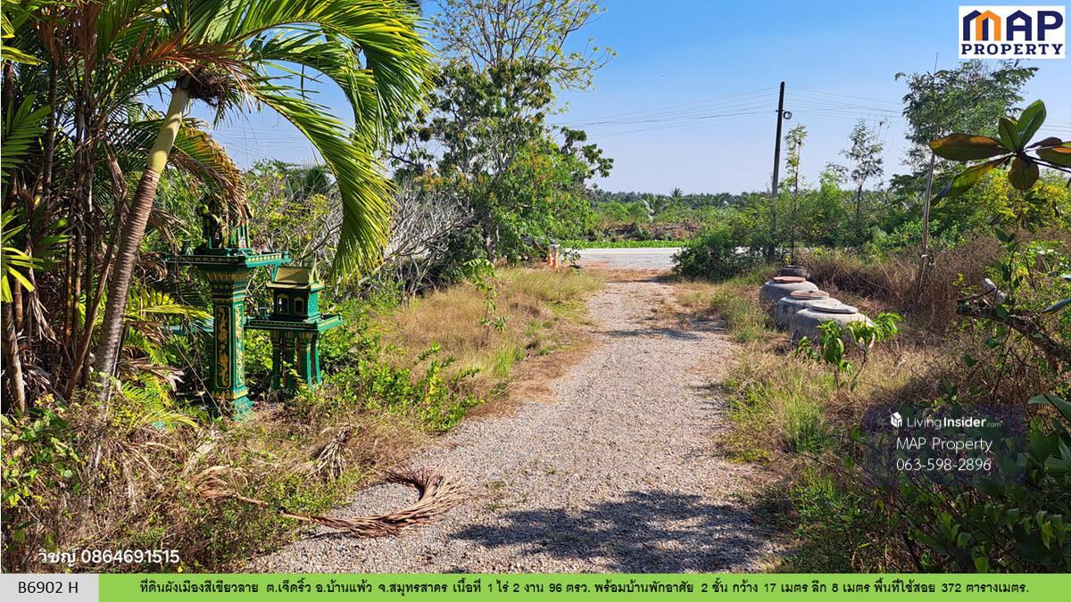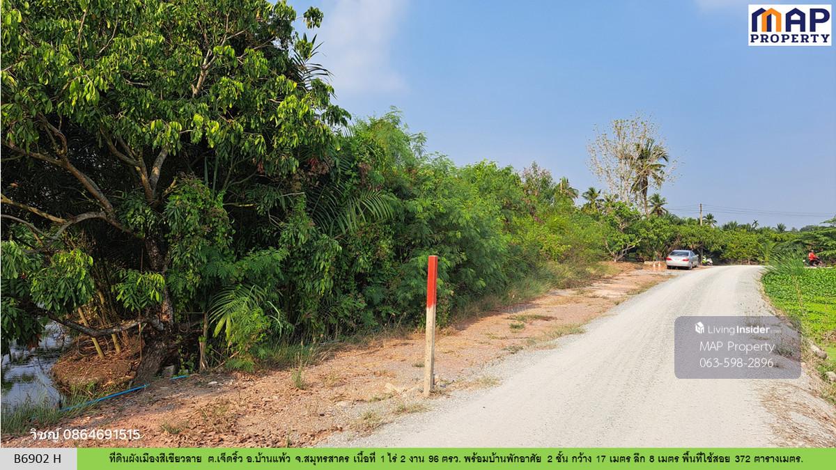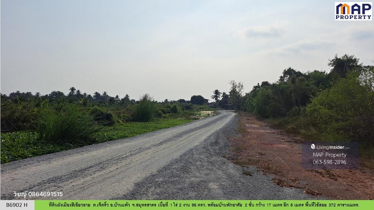 ที่ดินผังเมืองสีเขียวลาย ขนาด 1 ไร่ 2 งาน 96 ตรว. ต.เจ็ดริ้ว อ.บ้านแพ้ว จ.สมุทรสาคร พร้อมบ้าน 2 ชั้น พื้นที่ใช้สอย 272 ตารางเมตร ชั้นล่าง ประกอบด้วย ห้องนอน, ห้องน้ำ, ห้องทำงาน, ห้องครัว, ห้องเก็บของ โถงรับแขก ลานซักล้างด้านหลังบ้าน และส่วนจอดรถยนต์มีหลังคา ชั้นสองเป็นเรือนไม้ มีบันไดขึ้นจากภายในตัวบ้าน บนชั้นสองเป็นโถงโล่ง มีห้องเอนกประสงค์ 1 ห้อง และมีระเบียงด้านหน้าตัวบ้านพร้อมบันไดขึ้น-ลง ได้อีกทาง ไฟฟ้า-น้ำประปาพร้อม เข้าอยู่ได้ทันที - บรรยากาศธรรมชาติ เงียบสงบ มีพื้นที่ทำสวน ปลูกต้นไม้รอบตัวบ้าน เดินทางสะดวก หน้าบ้านทิศใต้ติดถนนสาธารณะ เข้า-ออกได้หลายเส้นทาง - วัดหลักสอง 2 กม. - วัดเจ็ดริ้ว 3.1 กม. - ตลาดน้ำบ้านแพ้ว 8.5 กม. - แยกบ้านแพ้ว ถนนพระรามสอง 14.9 กม. - เซนทรัลนครปฐม 33.7 กม. ติดต่อ วิชญ์ 086.469.1515