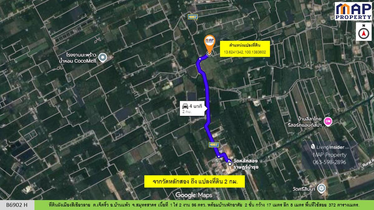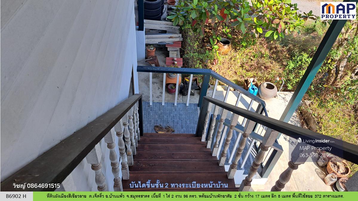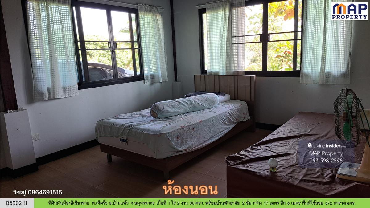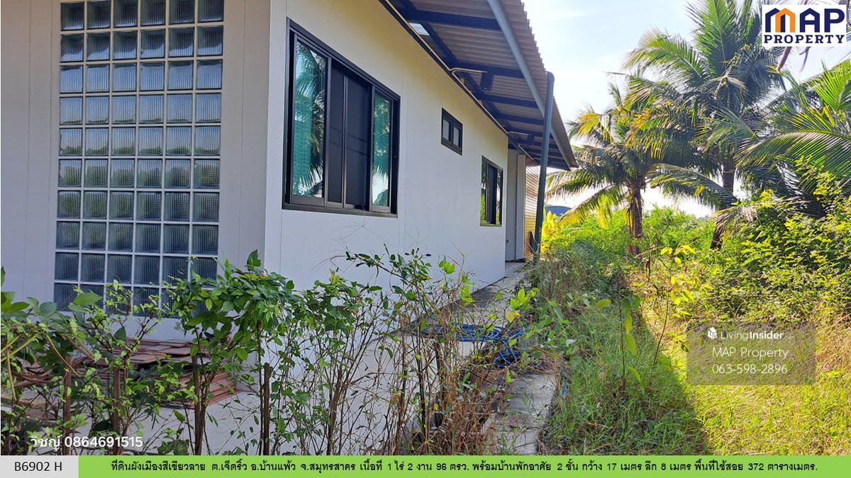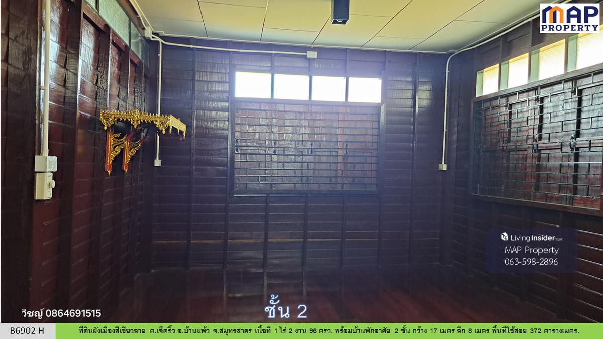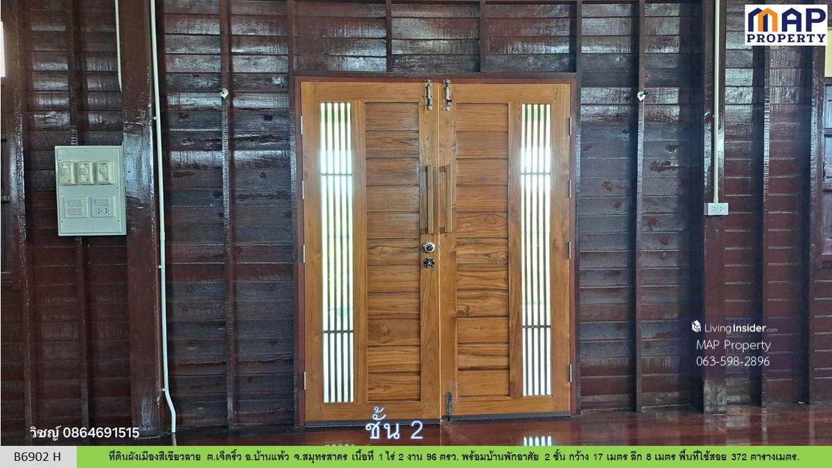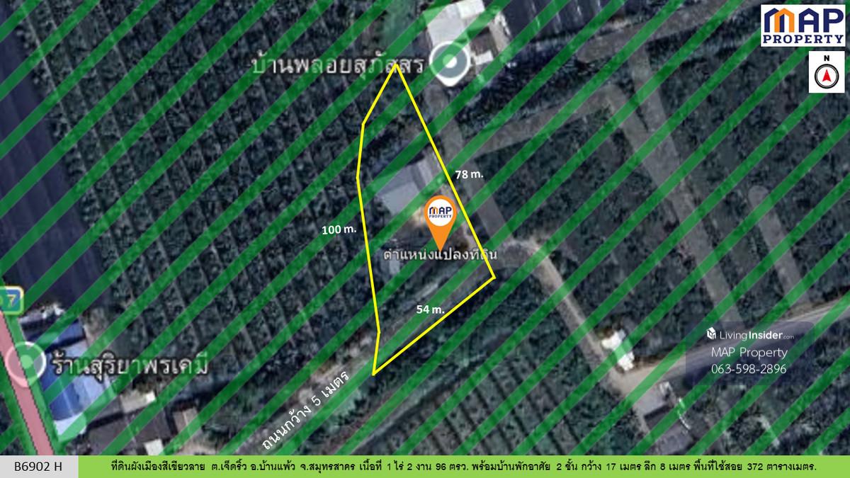 ที่ดินผังเมืองสีเขียวลาย ขนาด 1 ไร่ 2 งาน 96 ตรว. ต.เจ็ดริ้ว อ.บ้านแพ้ว จ.สมุทรสาคร พร้อมบ้าน 2 ชั้น พื้นที่ใช้สอย 272 ตารางเมตร ชั้นล่าง ประกอบด้วย ห้องนอน, ห้องน้ำ, ห้องทำงาน, ห้องครัว, ห้องเก็บของ โถงรับแขก ลานซักล้างด้านหลังบ้าน และส่วนจอดรถยนต์มีหลังคา ชั้นสองเป็นเรือนไม้ มีบันไดขึ้นจากภายในตัวบ้าน บนชั้นสองเป็นโถงโล่ง มีห้องเอนกประสงค์ 1 ห้อง และมีระเบียงด้านหน้าตัวบ้านพร้อมบันไดขึ้น-ลง ได้อีกทาง ไฟฟ้า-น้ำประปาพร้อม เข้าอยู่ได้ทันที - บรรยากาศธรรมชาติ เงียบสงบ มีพื้นที่ทำสวน ปลูกต้นไม้รอบตัวบ้าน เดินทางสะดวก หน้าบ้านทิศใต้ติดถนนสาธารณะ เข้า-ออกได้หลายเส้นทาง - วัดหลักสอง 2 กม. - วัดเจ็ดริ้ว 3.1 กม. - ตลาดน้ำบ้านแพ้ว 8.5 กม. - แยกบ้านแพ้ว ถนนพระรามสอง 14.9 กม. - เซนทรัลนครปฐม 33.7 กม. ติดต่อ วิชญ์ 086.469.1515