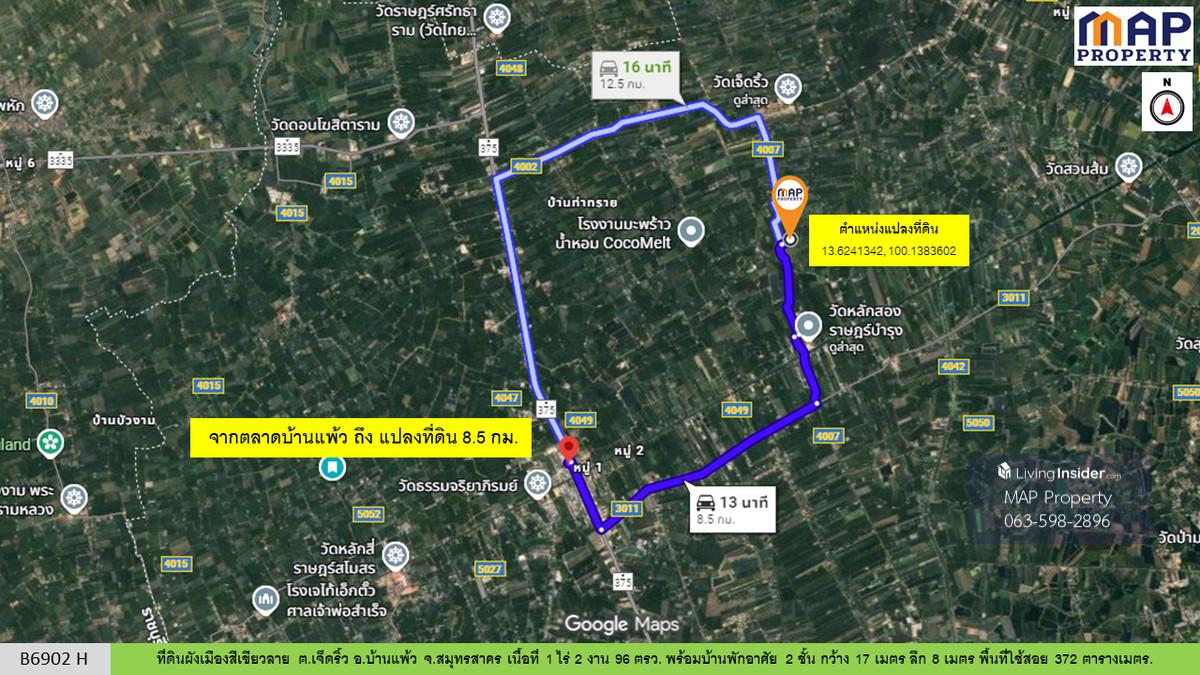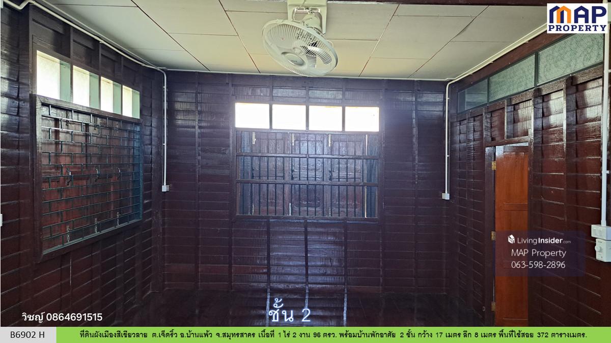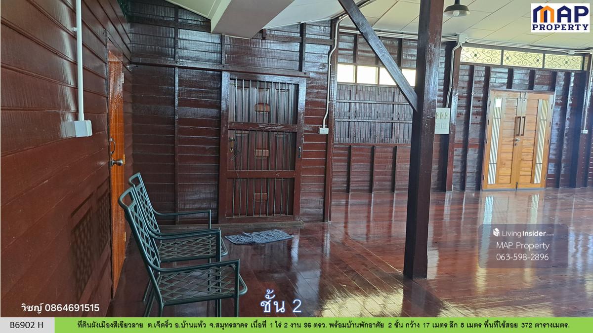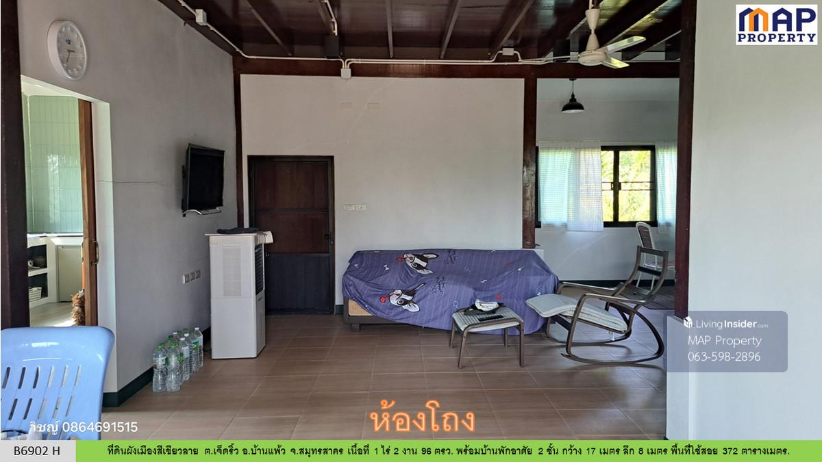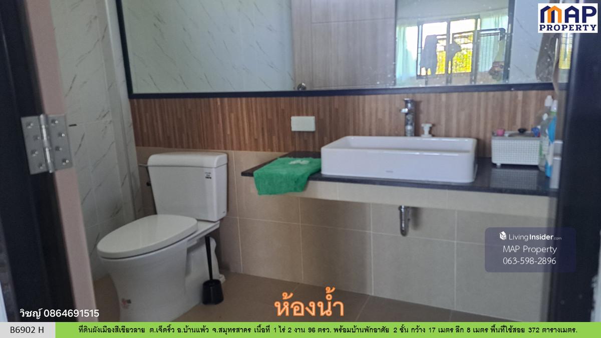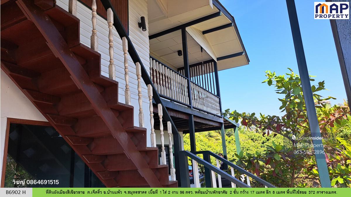 ที่ดินผังเมืองสีเขียวลาย ขนาด 1 ไร่ 2 งาน 96 ตรว. ต.เจ็ดริ้ว อ.บ้านแพ้ว จ.สมุทรสาคร พร้อมบ้าน 2 ชั้น พื้นที่ใช้สอย 272 ตารางเมตร ชั้นล่าง ประกอบด้วย ห้องนอน, ห้องน้ำ, ห้องทำงาน, ห้องครัว, ห้องเก็บของ โถงรับแขก ลานซักล้างด้านหลังบ้าน และส่วนจอดรถยนต์มีหลังคา ชั้นสองเป็นเรือนไม้ มีบันไดขึ้นจากภายในตัวบ้าน บนชั้นสองเป็นโถงโล่ง มีห้องเอนกประสงค์ 1 ห้อง และมีระเบียงด้านหน้าตัวบ้านพร้อมบันไดขึ้น-ลง ได้อีกทาง ไฟฟ้า-น้ำประปาพร้อม เข้าอยู่ได้ทันที - บรรยากาศธรรมชาติ เงียบสงบ มีพื้นที่ทำสวน ปลูกต้นไม้รอบตัวบ้าน เดินทางสะดวก หน้าบ้านทิศใต้ติดถนนสาธารณะ เข้า-ออกได้หลายเส้นทาง - วัดหลักสอง 2 กม. - วัดเจ็ดริ้ว 3.1 กม. - ตลาดน้ำบ้านแพ้ว 8.5 กม. - แยกบ้านแพ้ว ถนนพระรามสอง 14.9 กม. - เซนทรัลนครปฐม 33.7 กม. ติดต่อ วิชญ์ 086.469.1515