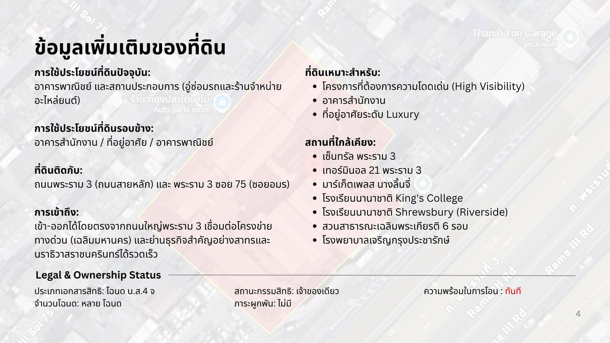 ที่อยู่: - 150 พระราม 3 ซอย 75 แขวงช่องนนทรี เขตยานนาวา กรุงเทพฯ 10120 ที่ดินติดกับ: - ถนนพระราม 3 (ถนนสายหลัก) และ พระราม 3 ซอย 75 (ซอยอมร) - เชื่อมต่อถนนสายหลัก: พระราม 3, นราธิวาสราชนครินทร์, สาธุประดิษฐ์ และรัชดาภิเษก (พระราม 3) การเข้าถึง: - เข้า-ออกได้โดยตรงจากถนนใหญ่พระราม 3 เชื่อมต่อโครงข่ายทางด่วน (เฉลิมมหานคร) และย่านธุรกิจสำคัญอย่างสาทรและนราธิวาสราชนครินทร์ได้รวดเร็ว มีทางเข้าจากซอยเย็นอากาศ ขนาด: - 2 ไร่ เศษ รวมเป็น 1,000 ตารางวา ลักษณะรูปแปลง: - รูปทรงหลายเหลี่ยม (Polygonal) - หน้ากว้าง ติดถนนพระราม 3 โดยประมาณ 70 เมตร - ความลึกของแปลง โดยประมาณ 60 เมตร การใช้ประโยชน์ที่ดินปัจจุบัน: - อาคารพาณิชย์ และสถานประกอบการ (อู่ซ่อมรถและร้านจำหน่ายอะไหล่ยนต์) การใช้ประโยชน์ที่ดินรอบข้าง: - อาคารสำนักงาน / ที่อยู่อาศัย / อาคารพาณิชย์ ที่ดินเหมาะสำหรับ: - โครงการที่ต้องการความโดดเด่น (High Visibility) ติดสะพานทางพิเศษเฉลิมมหานคร (สะพานพระราม 3 ไป พระราม 4) - อาคารสำนักงาน - ที่อยู่อาศัยระดับ Luxury สถานที่ใกล้เคียง: - เซ็นทรัล พระราม 3 - เทอร์มินอล 21 พระราม 3 - มาร์เก็ตเพลส นางลิ้นจี่ - โรงเรียนนานาชาติ King's College - โรงเรียนนานาชาติ Shrewsbury (Riverside) - สวนสาธารณะเฉลิมพระเกียรติ 6 รอบ - โรงพยาบาลเจริญกรุงประชารักษ์ Legal & Ownership Status - ประเภทเอกสารสิทธิ: โฉนด น.ส.4 จ - จํานวนโฉนด: หลาย โฉนด - สถานะกรรมสิทธิ: เจ้าของเดียว - ภาระผูกพัน: ไม่มี - ความพร้อมในการโอน : ทันที สนใจติดต่อ สอบถามข้อมูลเพิ่มเติมได้ที่ คุณบิว คลิกเพื่อดูเบอร์โทรติดต่อ Email: คลิกเพื่อดูอีเมล