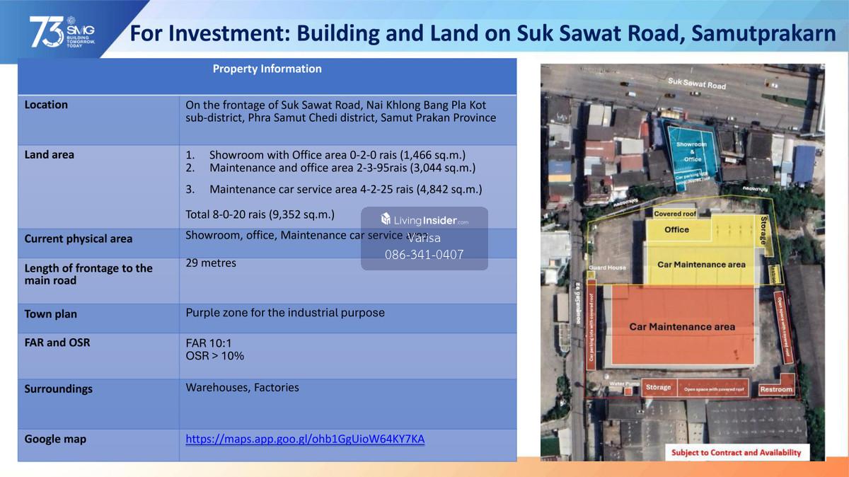 ที่ดินและสิ่งปลูกสร้างติดหน้าถนนสุขสวัสดิ์ โชว์รูม และออฟฟิศ พื้นที่ 0-2-0 ไร่ (1,466 ตร.ม.) พื้นที่ซ่อมบำรุง และออฟฟิศ 2-3-95 ไร่ (3,044 ตร.ม.) พื้นที่ซ่อมบำรุง 4-2-25 ไร่ (4,842 ตร.ม.) หน้ากว้าง: 29